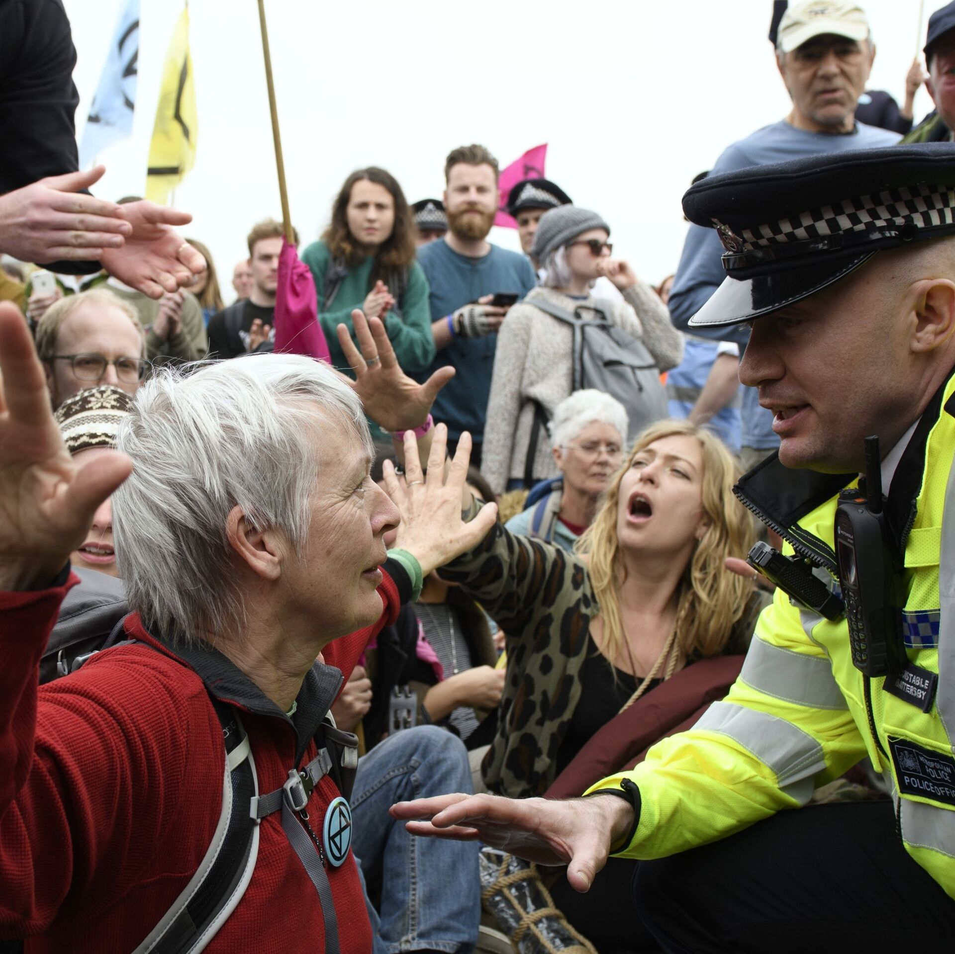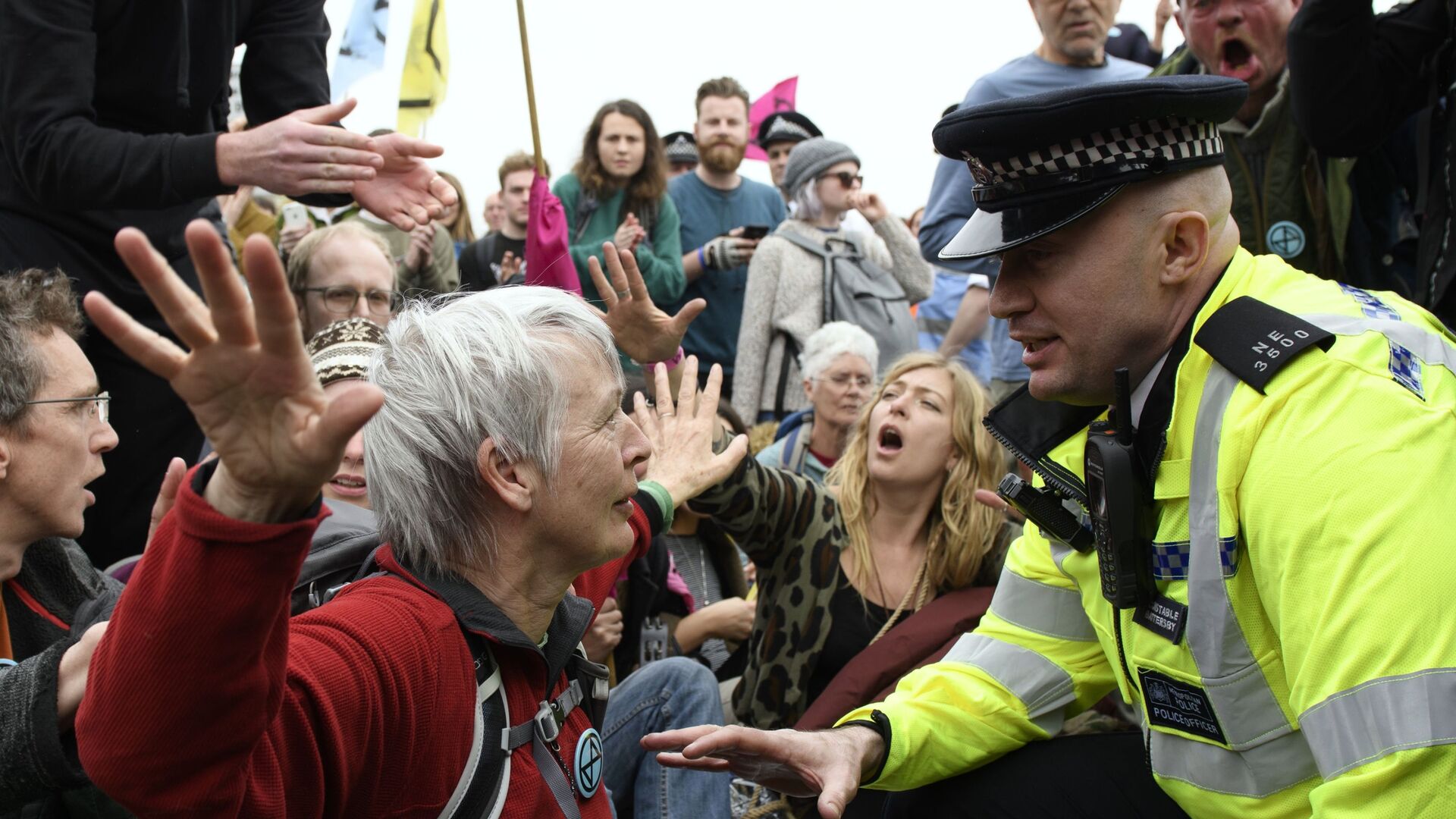 ضابط شرطة يتواصل مع أحد المشاركين في احتجاجات ضد التلوث البيئي في أحد شوارع لندن، إنجلترا 16 أبريل 2019 - سبوتنيك عربي, 1920, 02.09.2025
