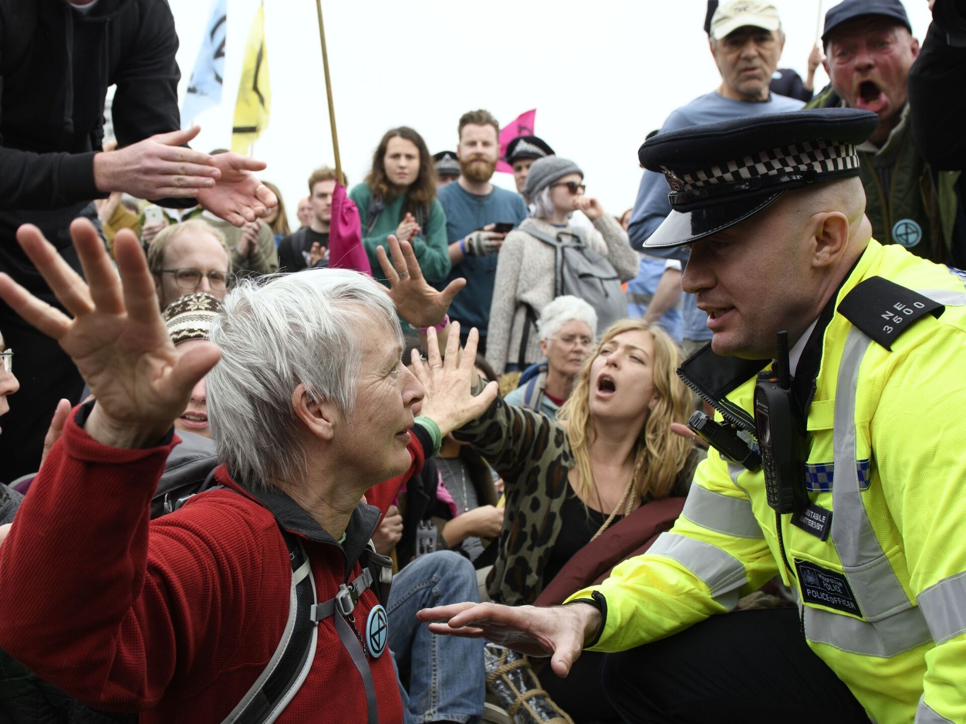 © Sputnik . Justin Griffiths-Williams / الانتقال إلى بنك الصورضابط شرطة يتواصل مع أحد المشاركين في احتجاجات ضد التلوث البيئي في أحد شوارع لندن، إنجلترا 16 أبريل 2019