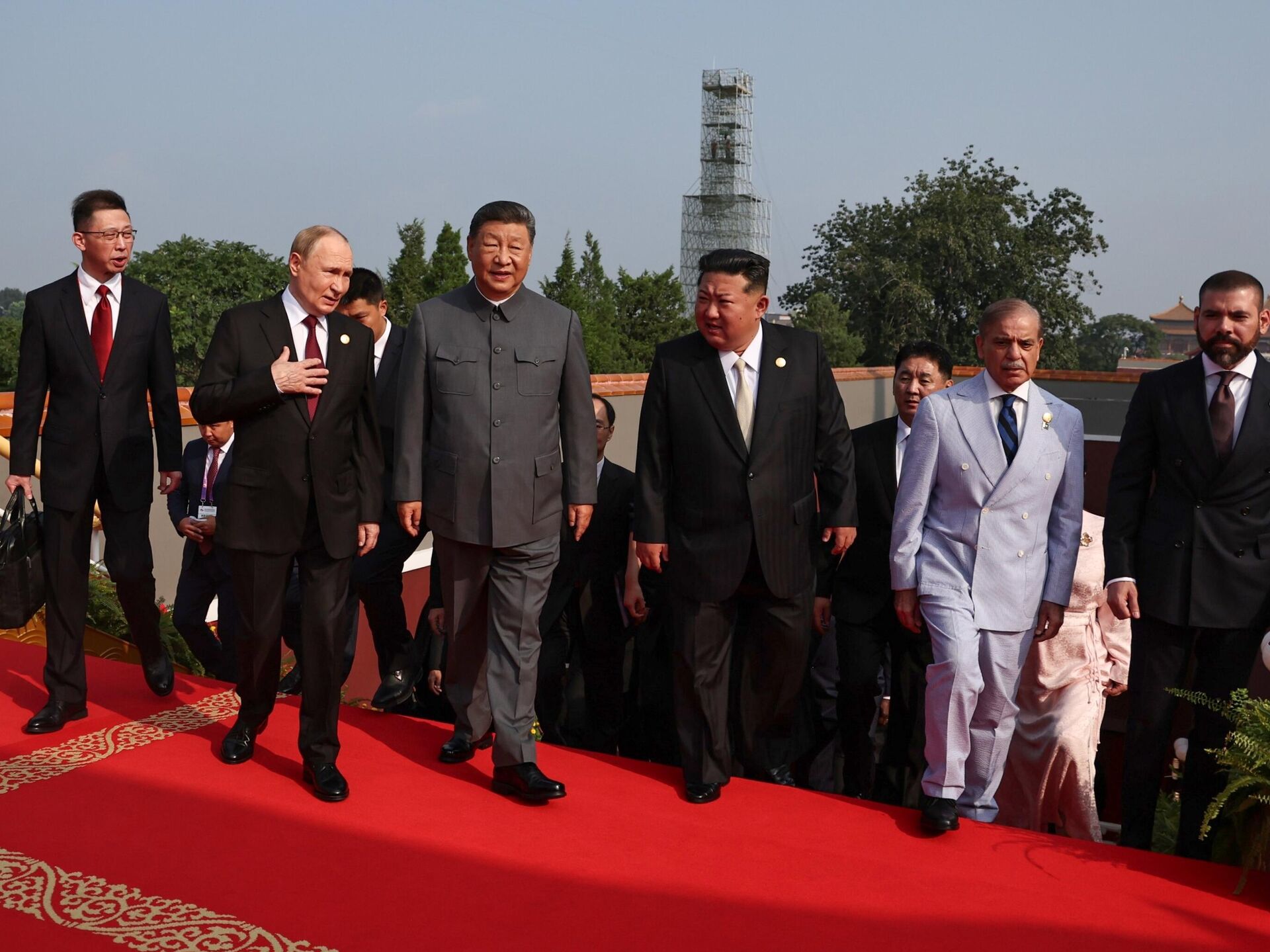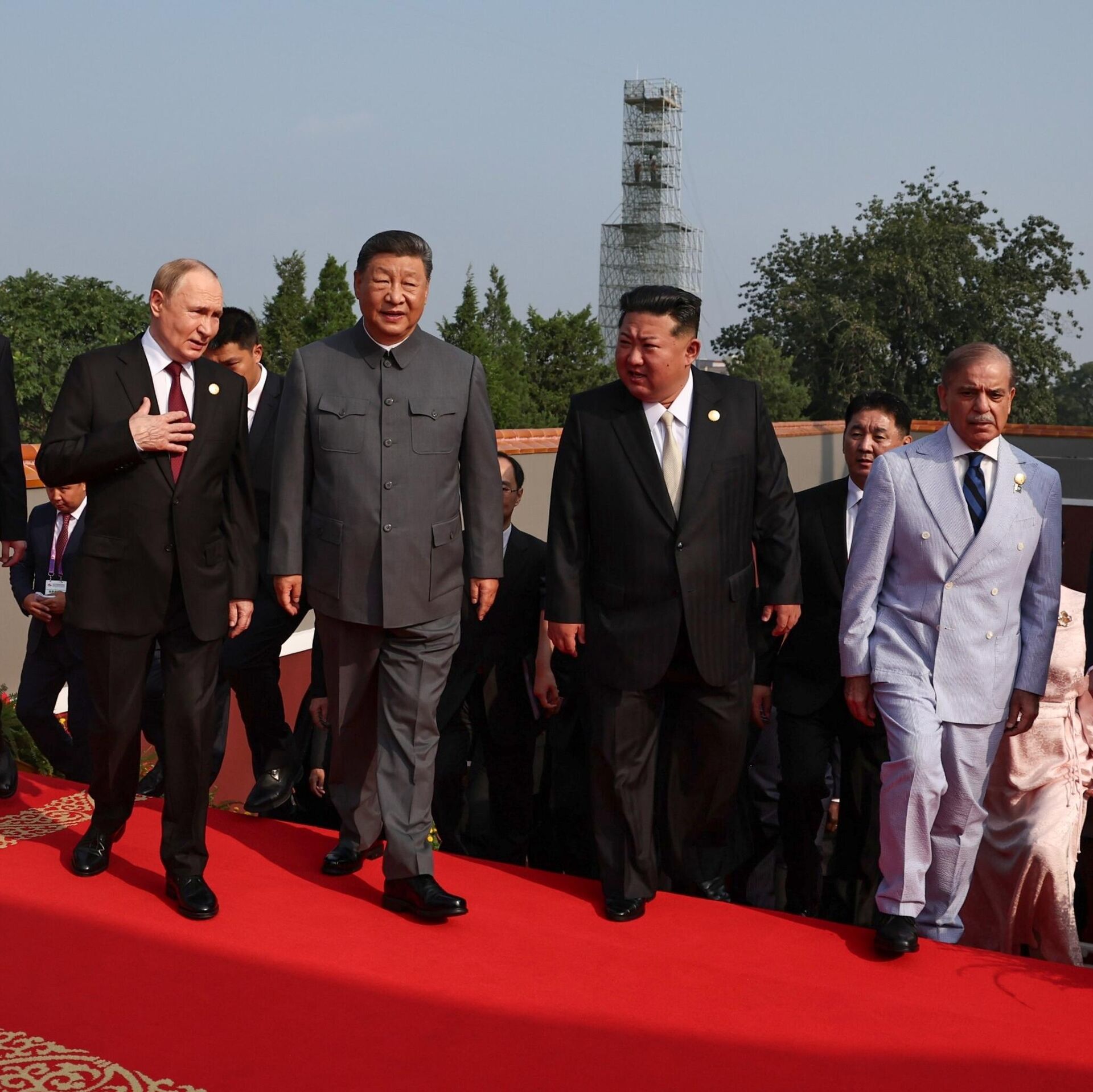 بوتين وكيم جونغ أون تبادلا حديثًا قصيرًا مع شي جين بينغ أثناء توجه القادة الثلاثة إلى المنصة المخصصة لمتابعة العرض في بكين.