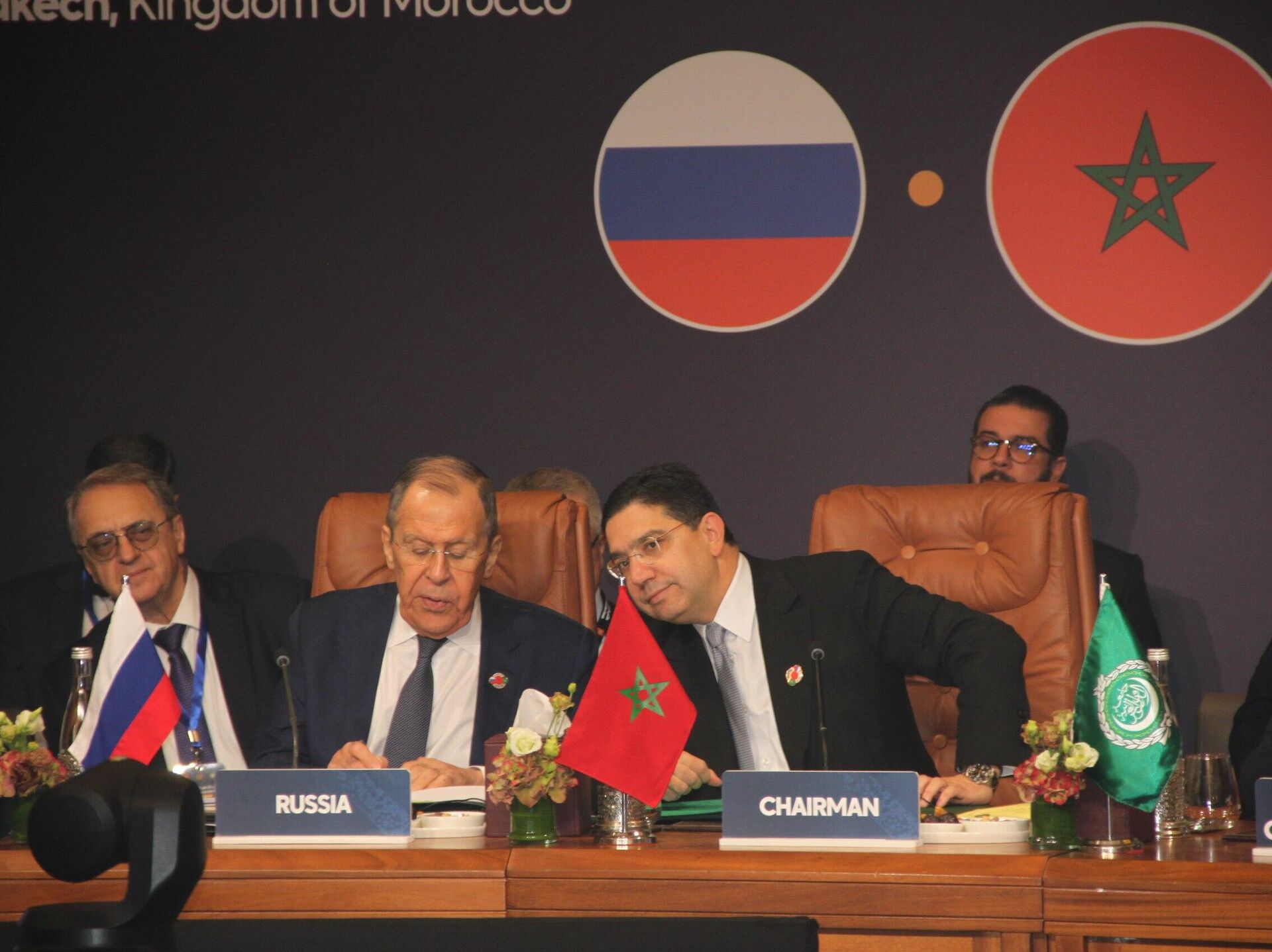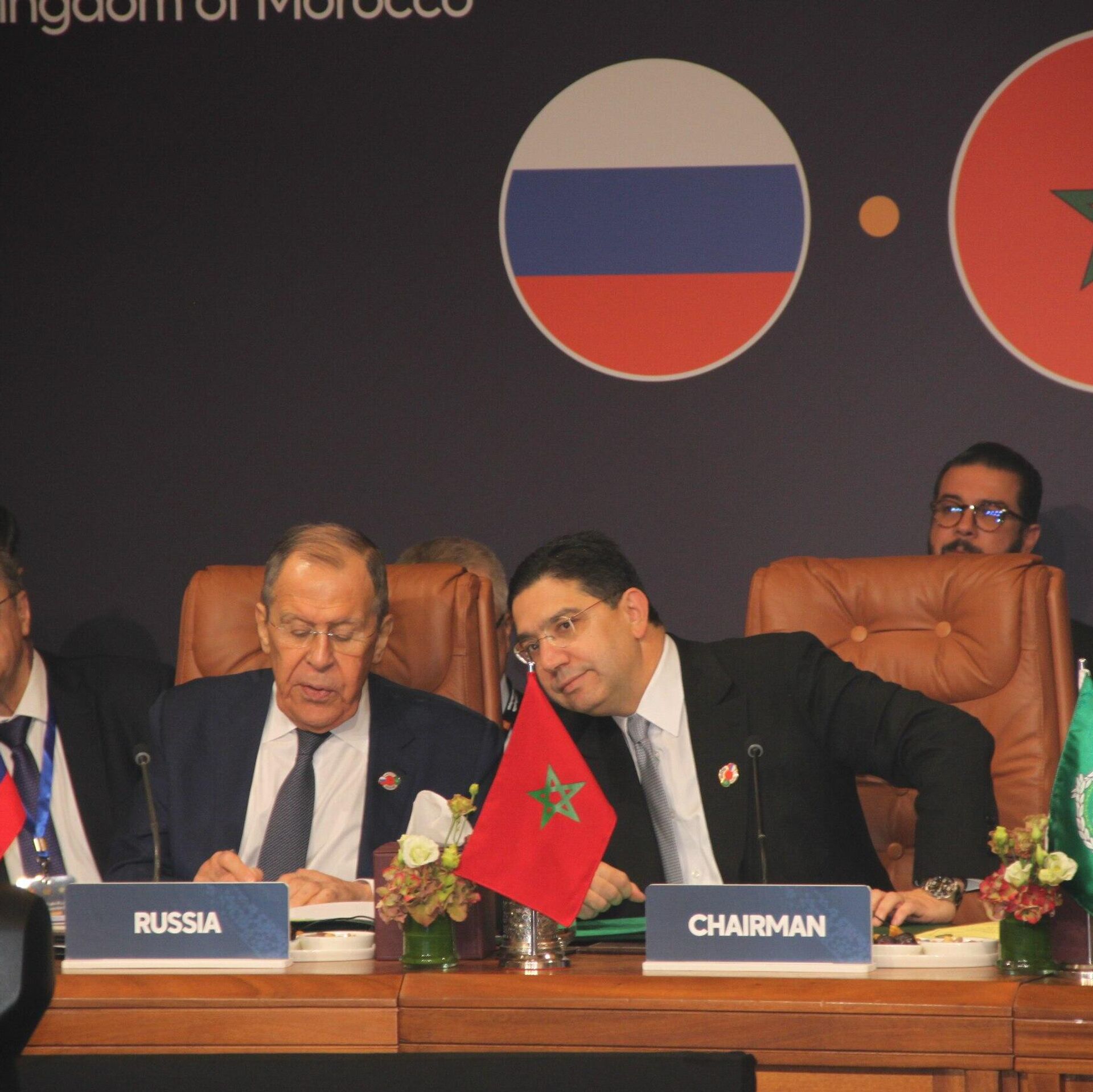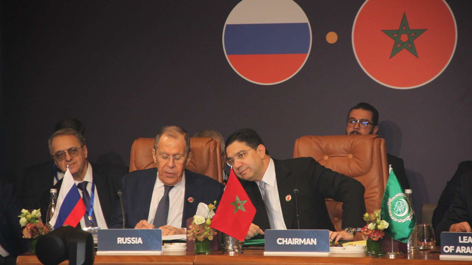 © Sputnikوزير الخارجية الروسي سيرغي لافروف ونظيره المغربي ناصر بوريطة خلال المنتدى العربي الروسي