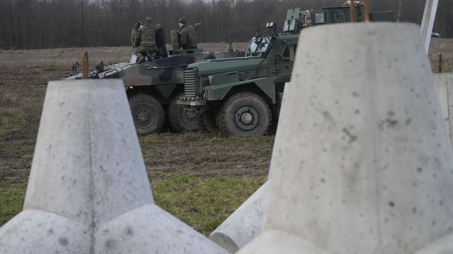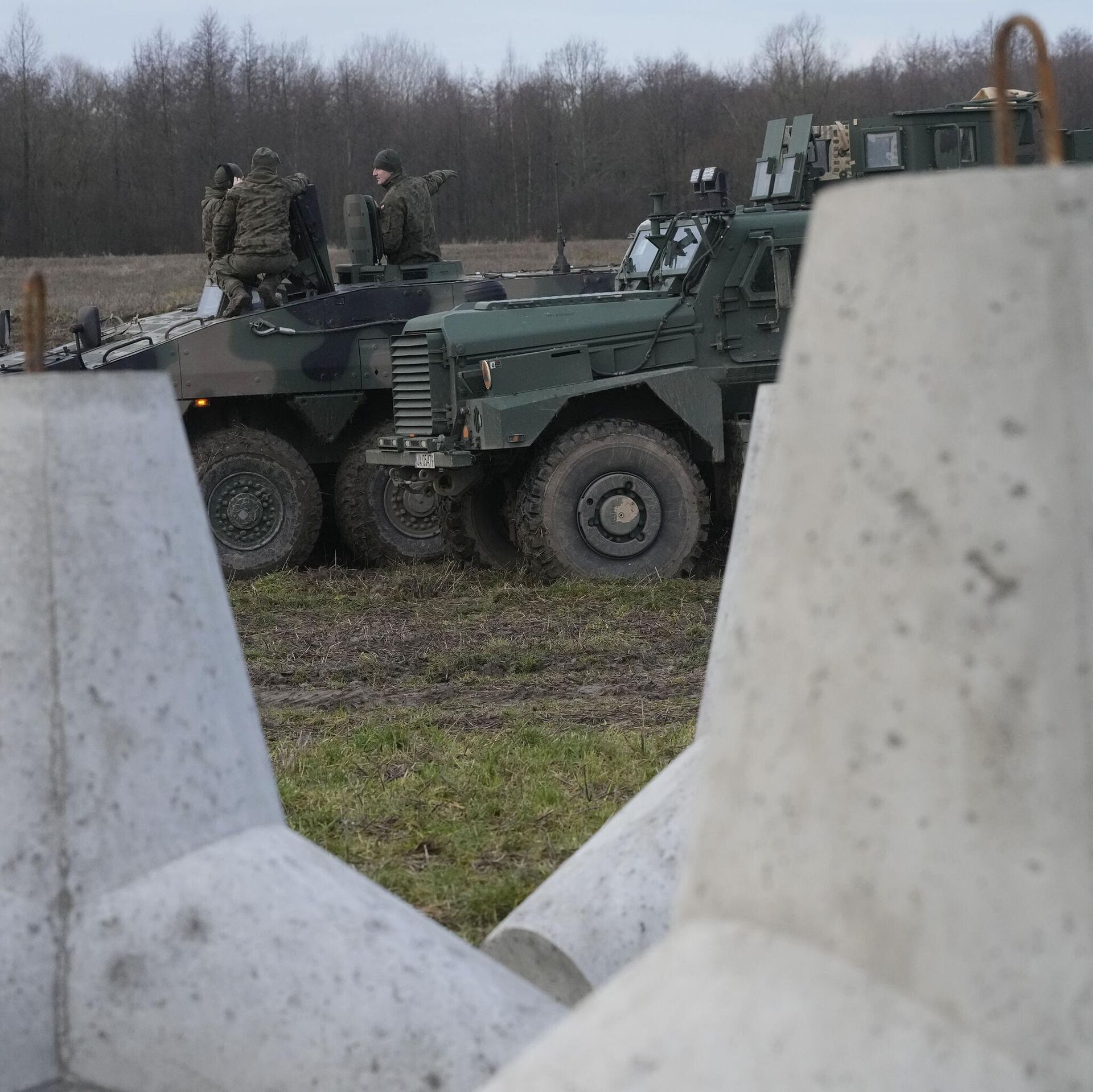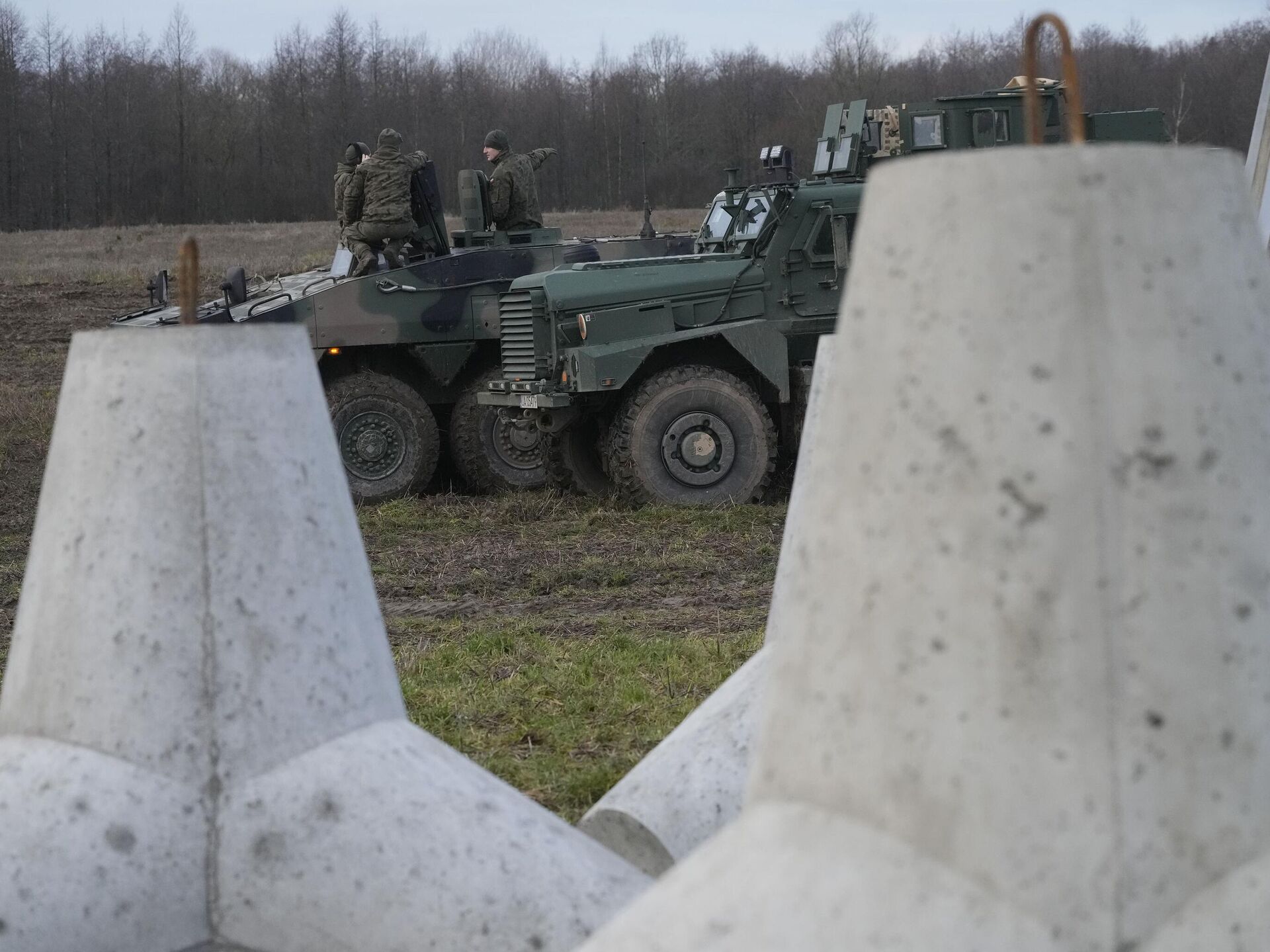 © AP Photo / Czarek Sokolowskiحواجز خرسانية تشكل جزءًا من تحصينات تسمى "درع بولندا الشرقي" على الحدود بين بولندا وروسيا في دابروفكا البولندية، 30 نوفمبر 2024.