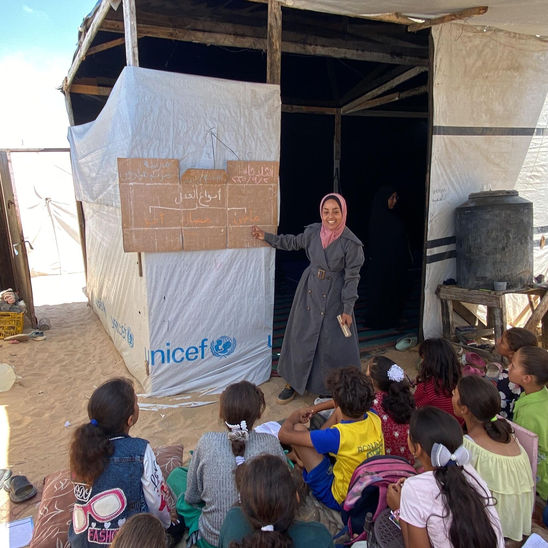 وتضيف: "هذا العمل تطوعي ولا نتقاضى أجرا مقابل هذه المبادرة، ويوجد عدد كبير من الأطفال في هذه الخيمة التعليمية، رغم ما نواجهه من صعوبات في توفير أدنى مقومات التعليم"، وتستدرك: "يساعدنا بعض الأهالي النازحين، لكن الظروف صعبة على الجميع، لذلك نقوم بصنع بدائل مثل لوح الخشبي الذي استبدلناه بلوح من الكرتون، ونهدف للتخفيف أيضا عن الأطفال وجعلهم ينسون ولو لوقت قصير ظروف الحرب التي نعيشها".