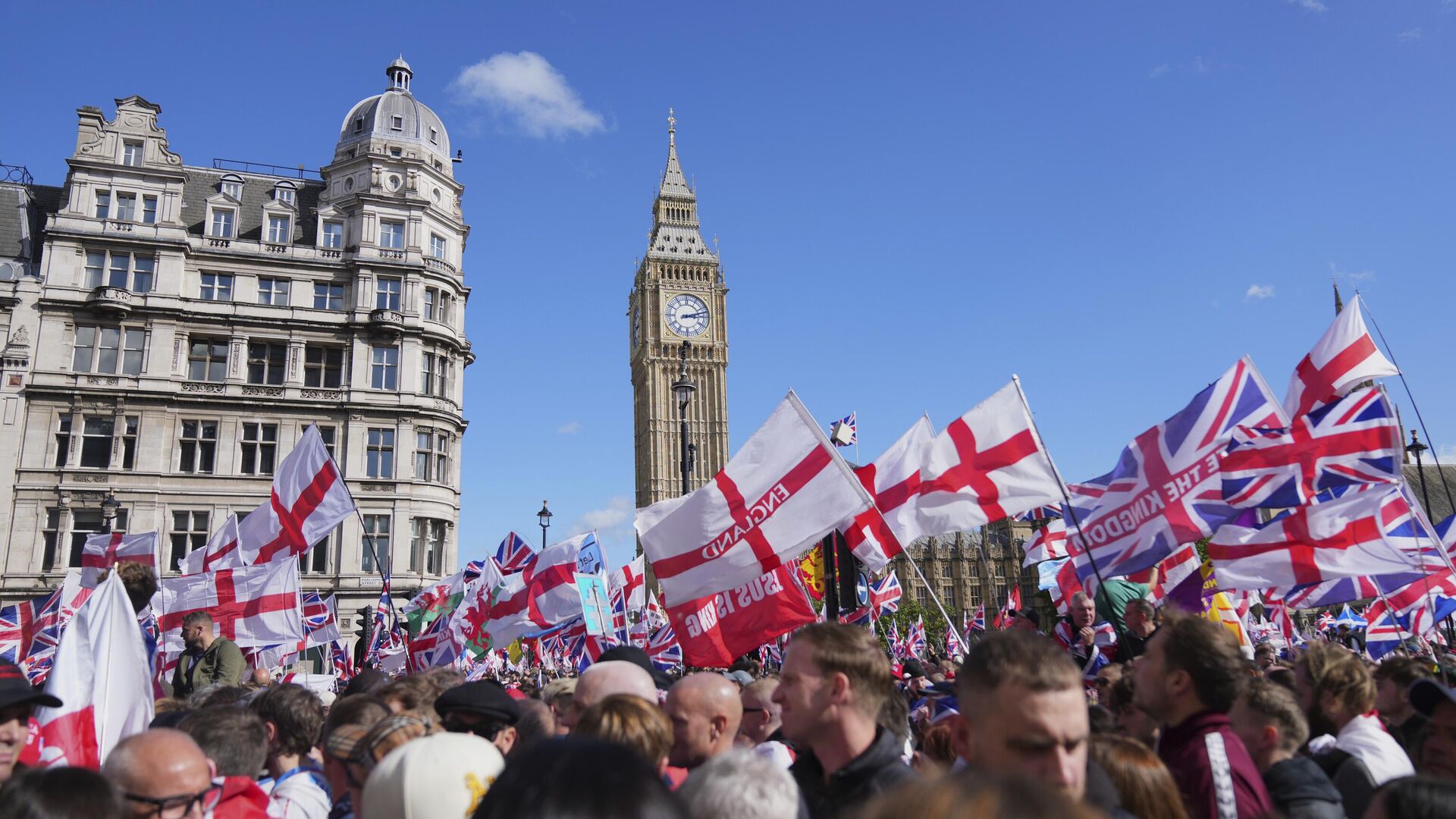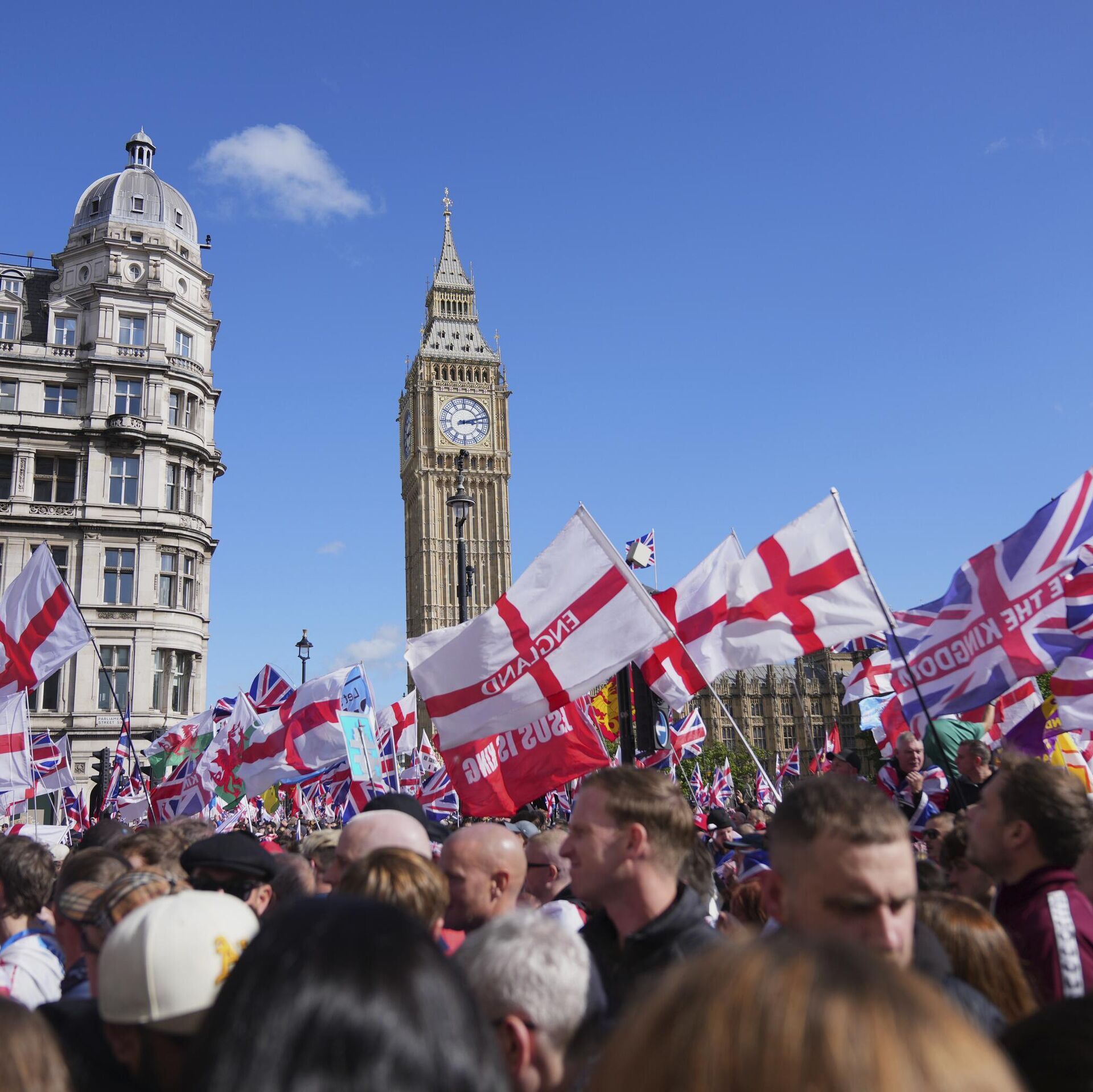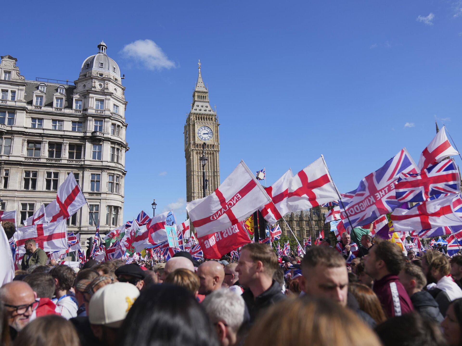 وانطلقت الحشود من ساحة راسل سكوير باتجاه الحي الحكومي في وايتهول، رافعين أعلام إنجلترا التي تحمل صليب القديس جورج و"يونيون جاك"، فيما هتفوا بشعارات مناوئة لرئيس الوزراء كير ستارمر.
