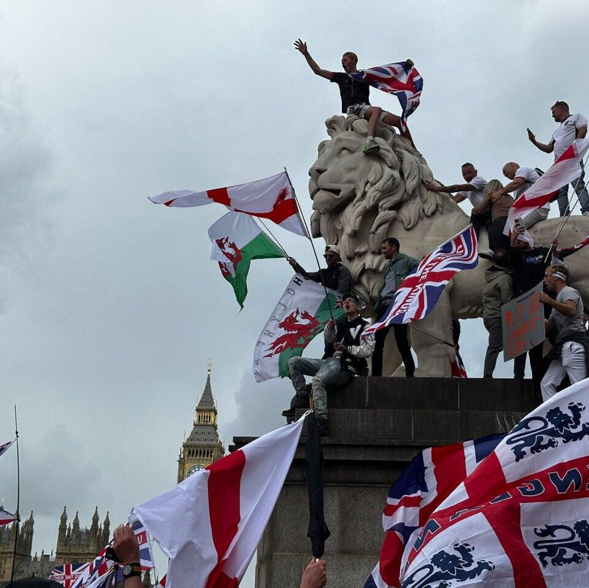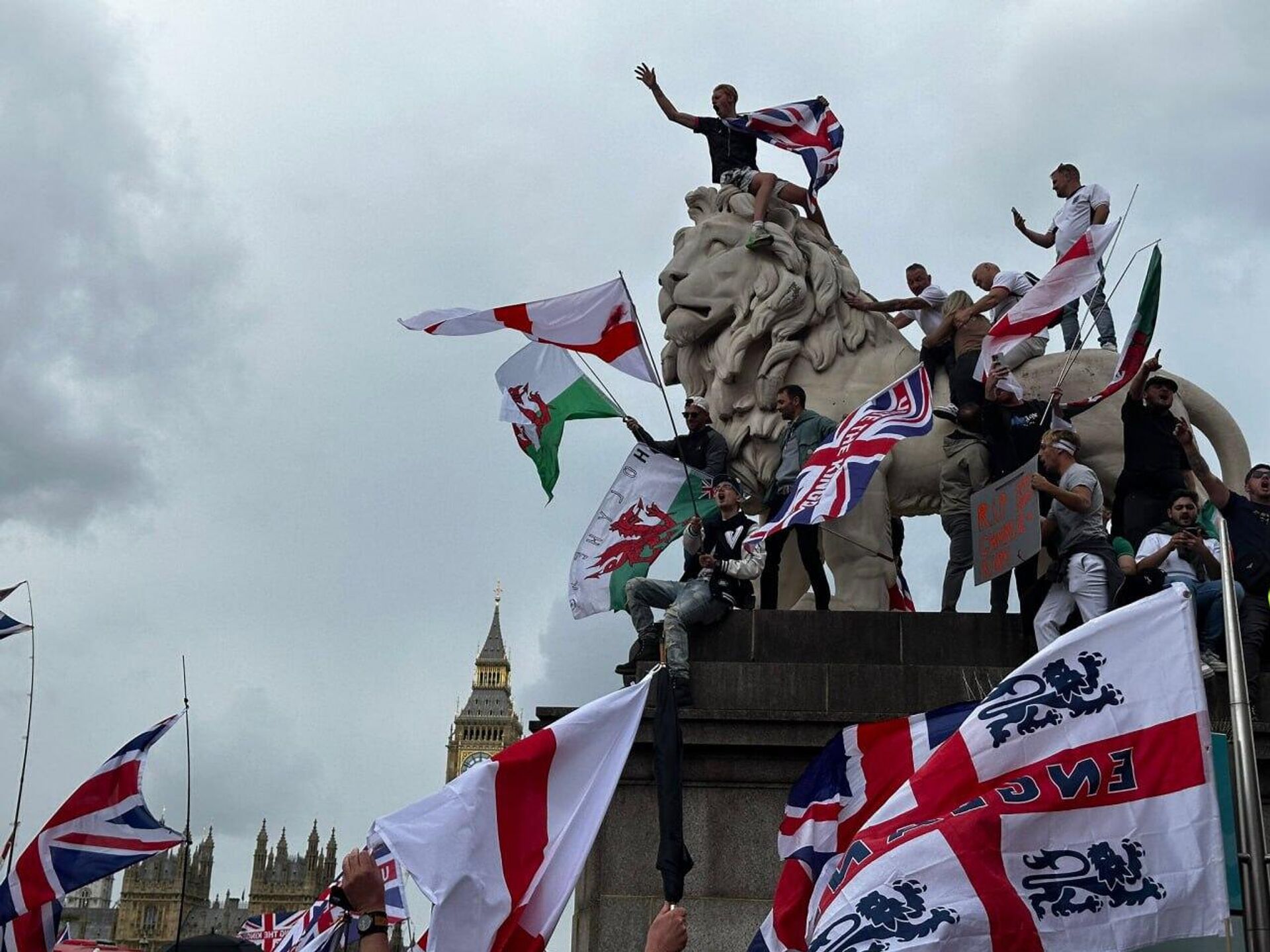 وتجمع المتظاهرون في ساحة "راسل"، اليوم السبت، ثم توجهوا من هناك إلى الحي الحكومي في وايتهول، ورفع العديد منهم العلم الوطني لإنجلترا، مزينا بصليب القديس جورج و"علم الاتحاد"، وهتف المتظاهرون بشعارات ضد رئيس الوزراء كير ستارمر، منتقدين سياسة الحكومة في الهجرة وما يعتبرونه قيودا على حرية التعبير.