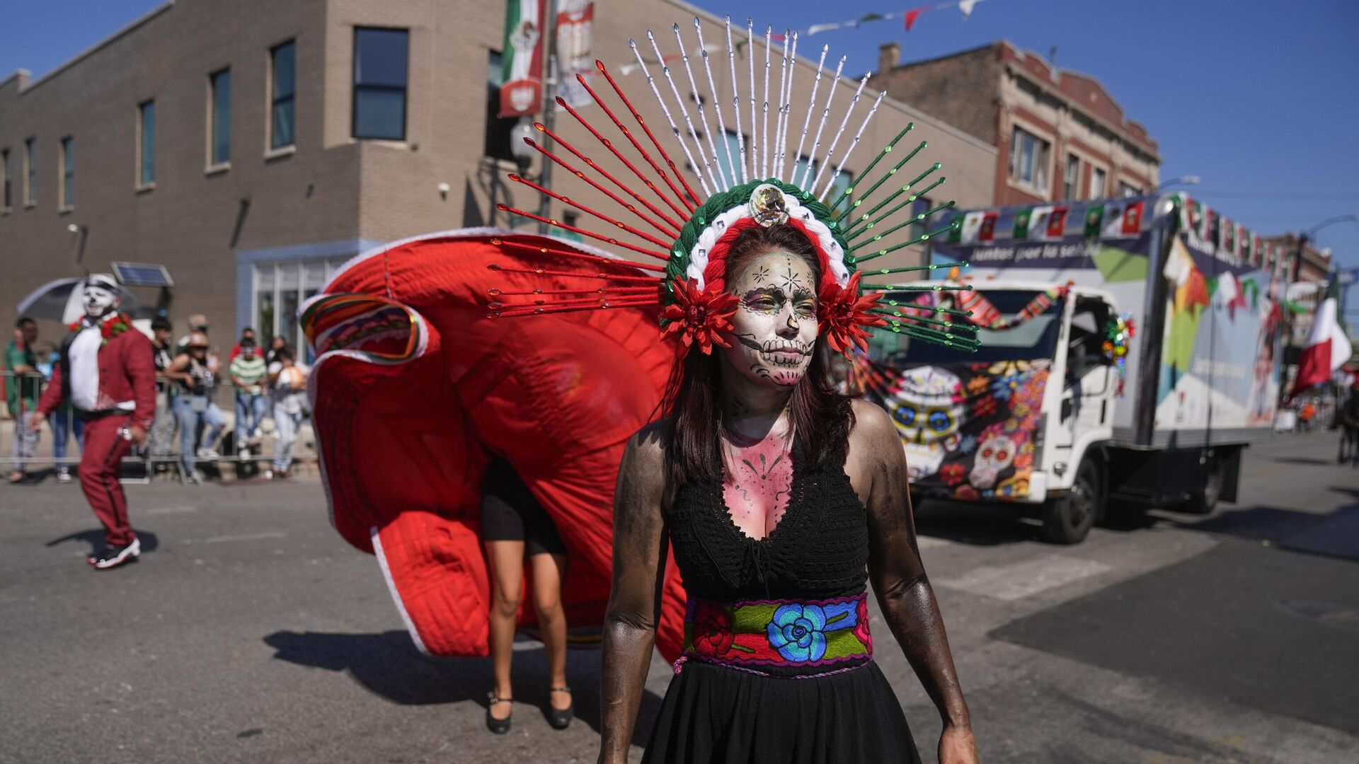 © AP Photo / Erin Hooley فتاة ترتدي زي يوم الأموات أثناء مشاركتها في موكب يوم الاستقلال المكسيكي، في حي ليتل فيليج في شيكاغو، الولايات المتحدة.