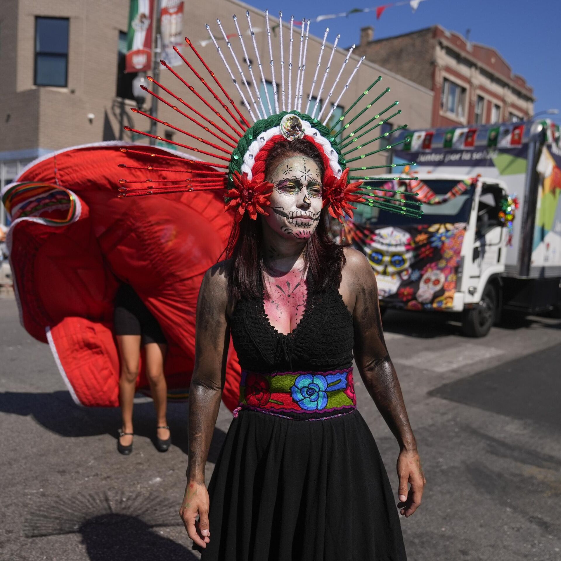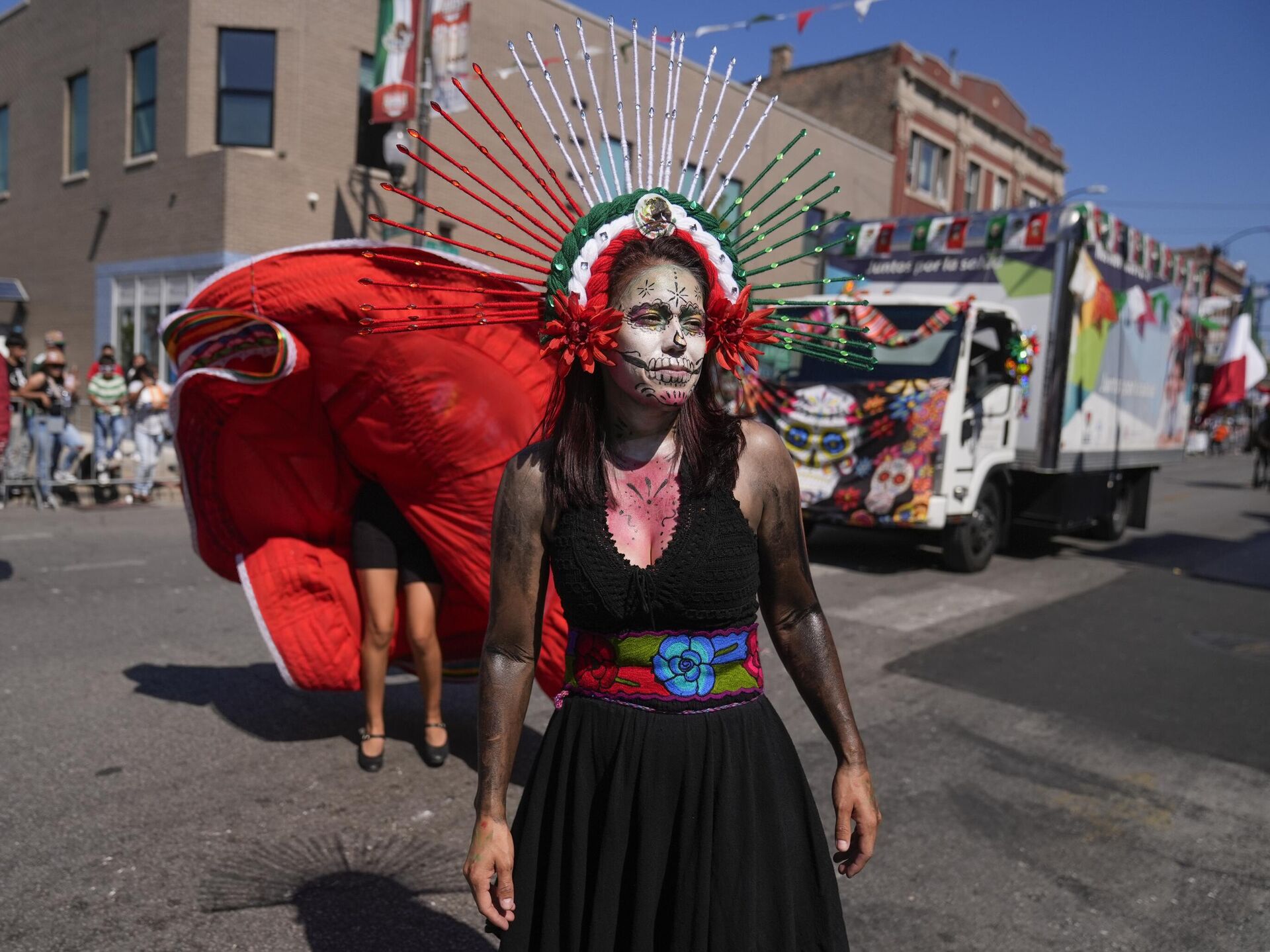 فتاة ترتدي زي يوم الأموات أثناء مشاركتها في موكب يوم الاستقلال المكسيكي، في حي ليتل فيليج في شيكاغو، الولايات المتحدة.