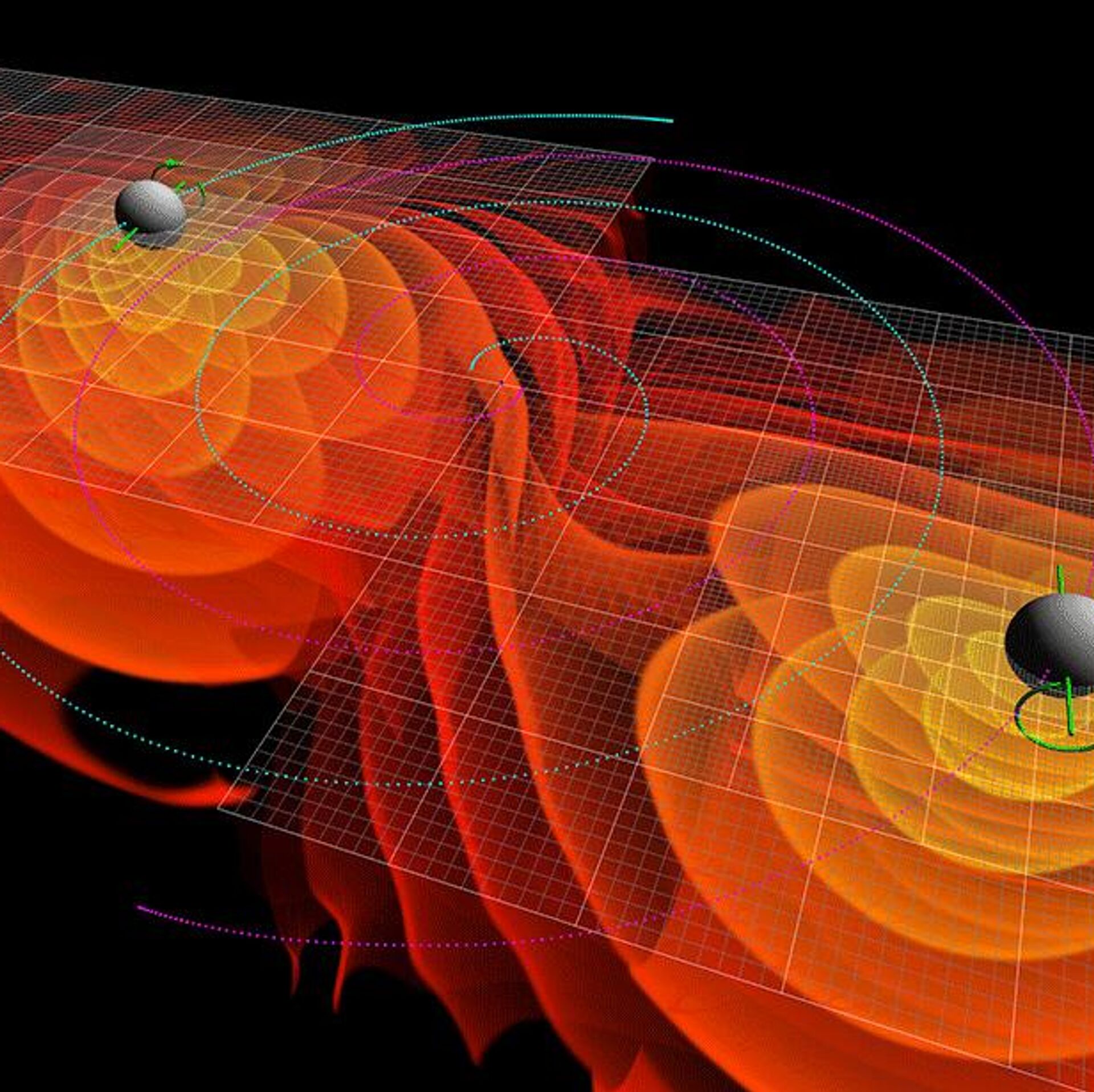 محاكاة عددية للموجات الثقالية المنبعثة من اندماج ثقبين أسودين. تمثل الخطوط الملونة حول كل ثقب أسود سعة الإشعاع الثقالي، بينما تمثّل الخطوط الزرقاء مدارات الثقوب السوداء، وتمثّل الأسهم الخضراء دورانها.