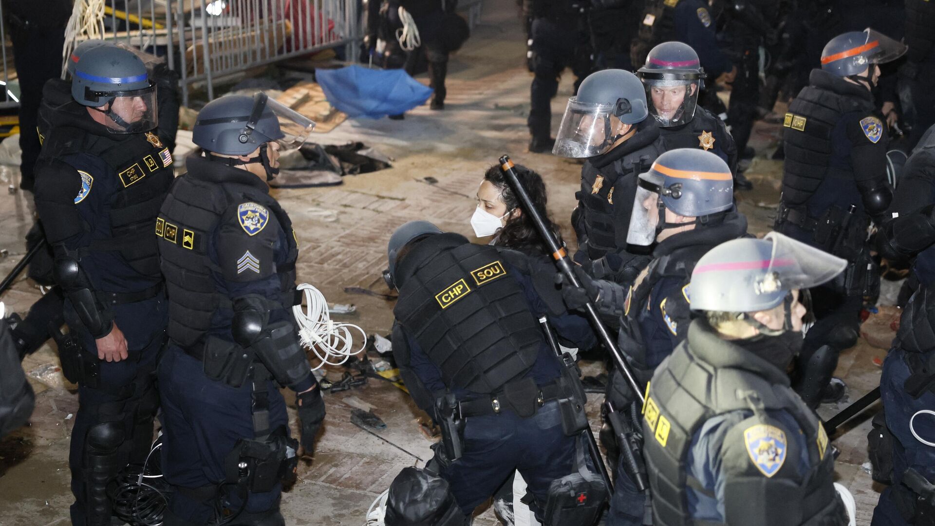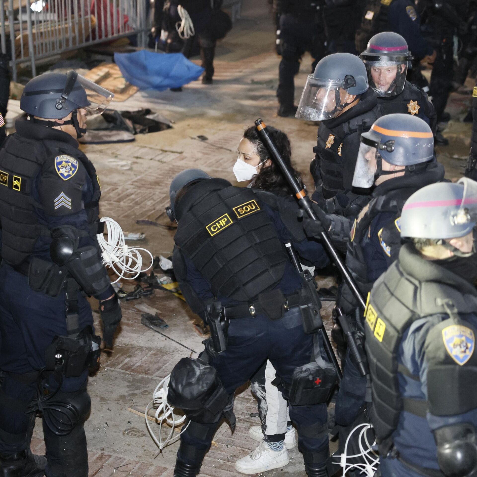 الشرطة الأمريكية تعتقل أحد المؤيدين لفلسطين في حرم جامعة كاليفورنيا، لوس أنجلوس في 2 مايو، 2024 - سبوتنيك عربي, 1920, 28.09.2025
