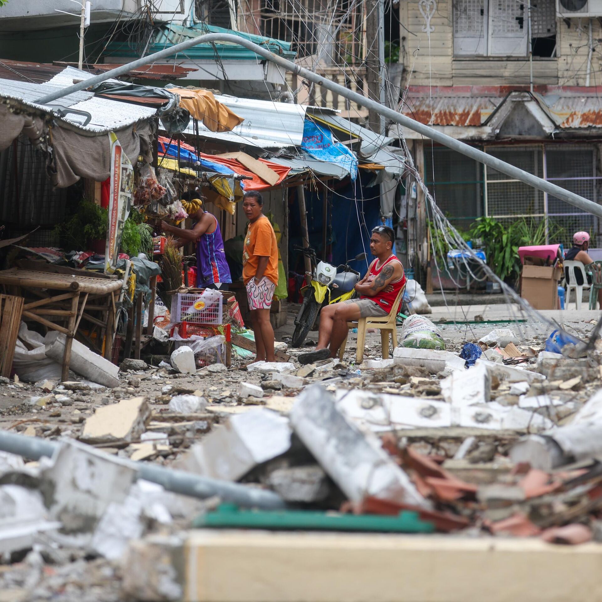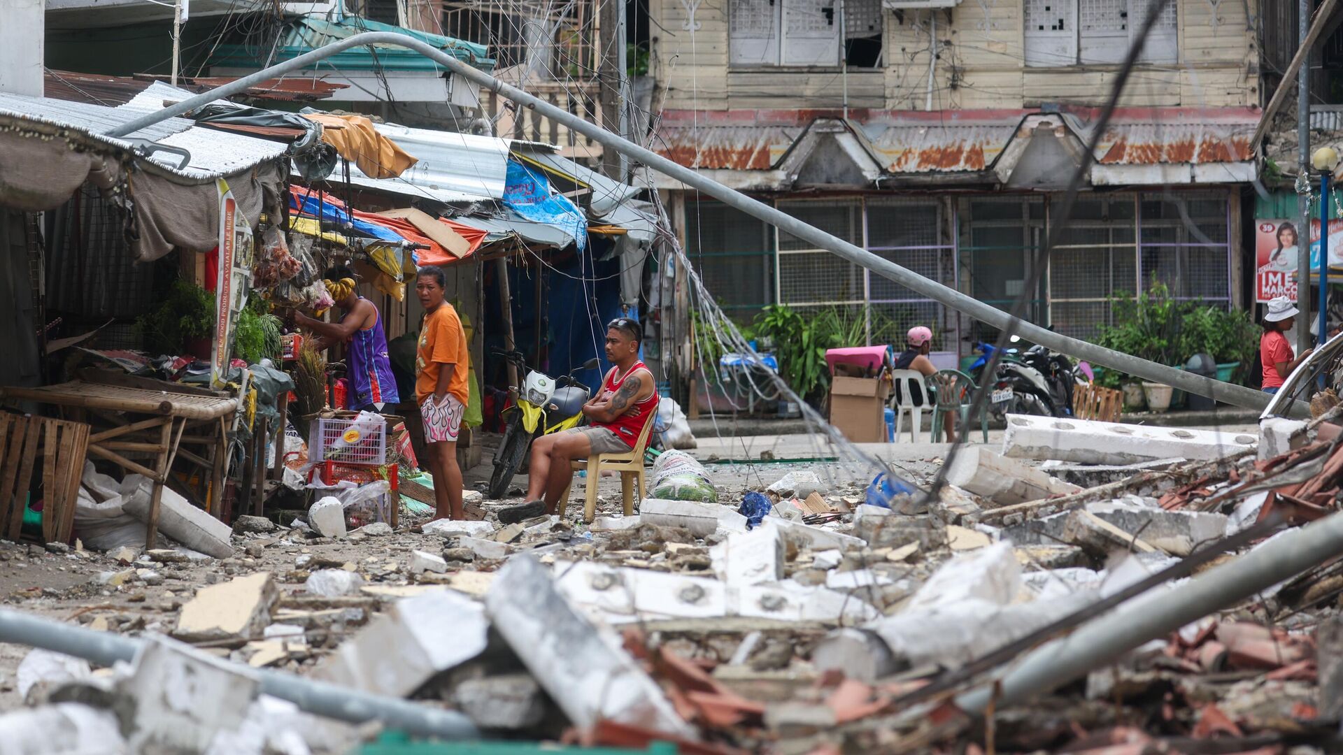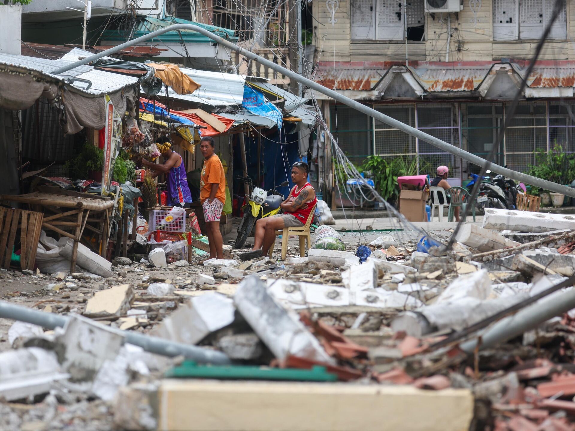 سكان مدينة بوغو بالفلبين، بالقرب من أنقاض المباني المتضررة نتيجة الزلزال المدمر الذي ضرب البلاد.