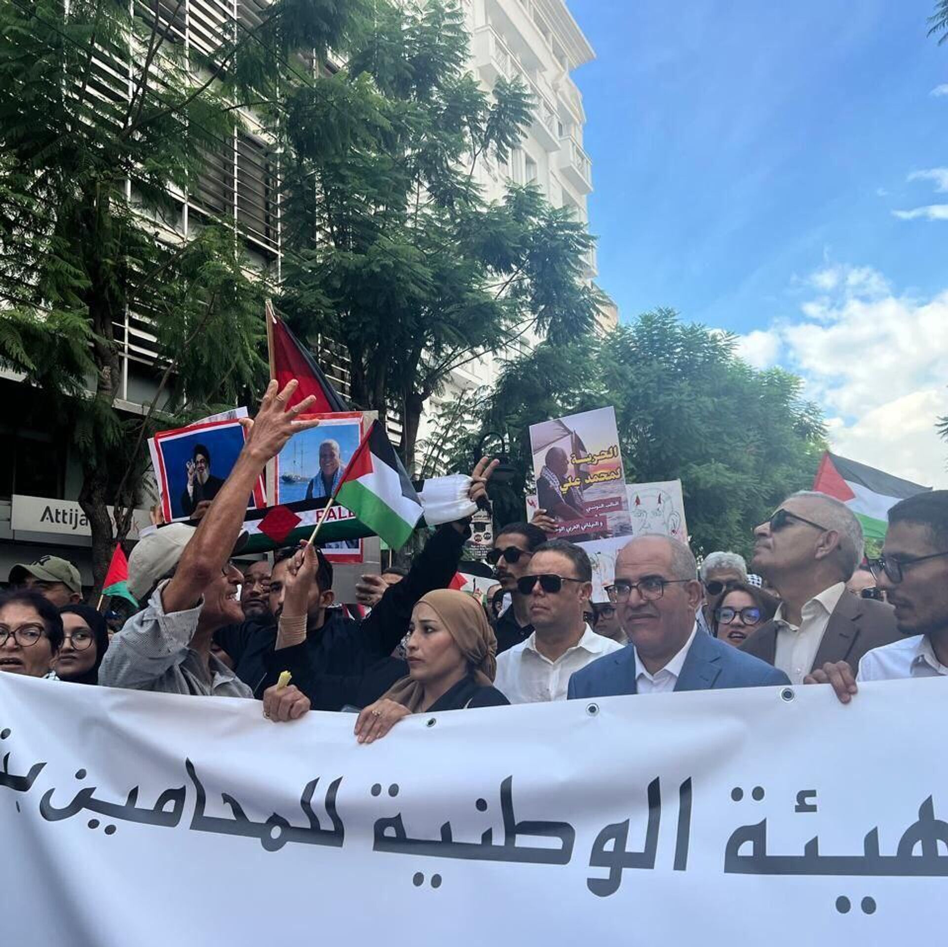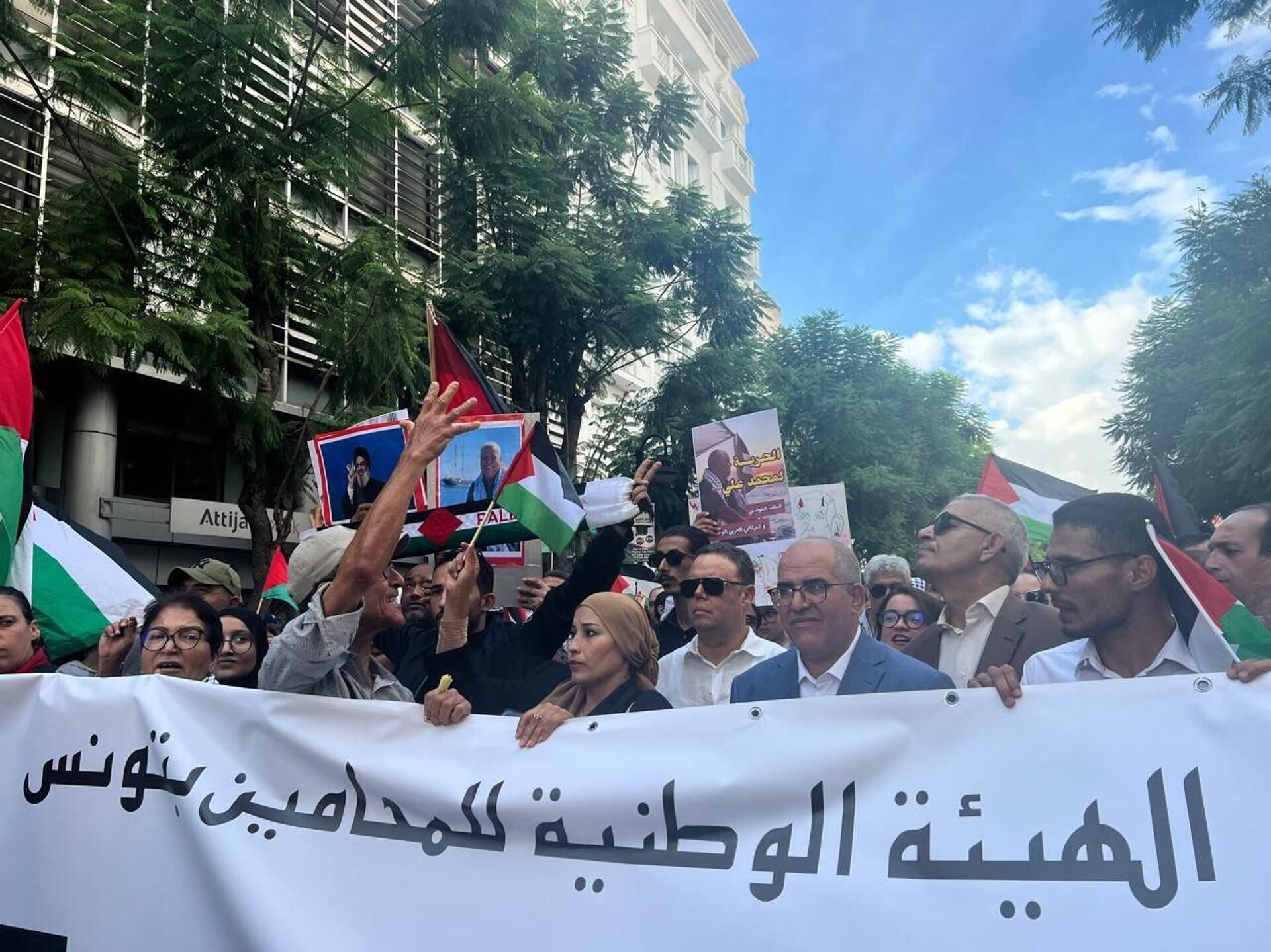 في قلب المسيرة التي جابت شارع الحبيب بورقيبة، برز الحضور اللافت للحركة الطلابية التونسية التي قاد أفرادها الصفوف الأمامية رافعين الرايات الفلسطينية ومرددين شعارات تنادي بالحرية لنشطاء أسطول الصمود.