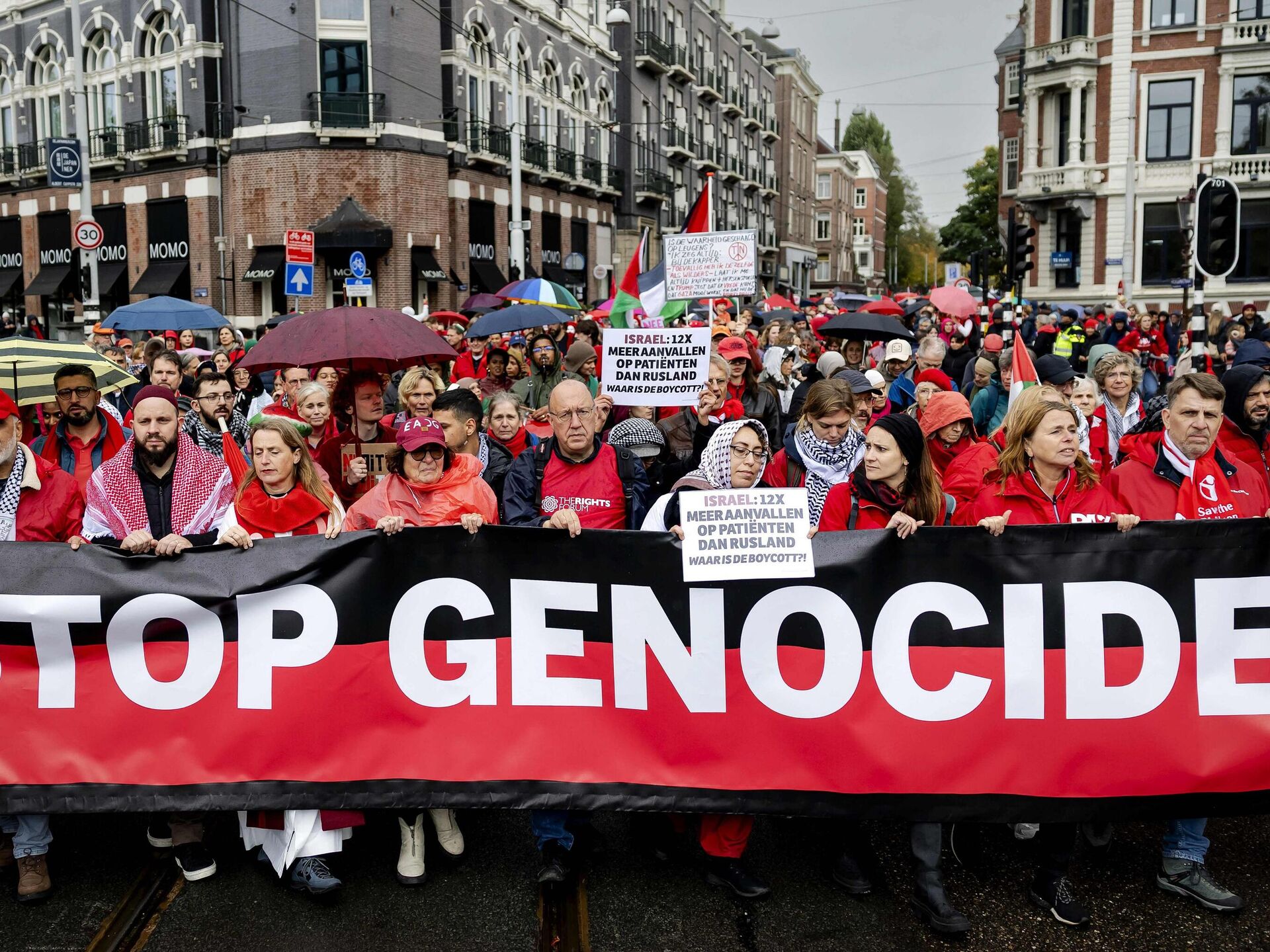 المتظاهرون السلطات الهولندية إلى استخدام كافة الوسائل الاقتصادية والدبلوماسية لزيادة الضغط على إسرائيل، بحسب منظمة العفو الدولية.