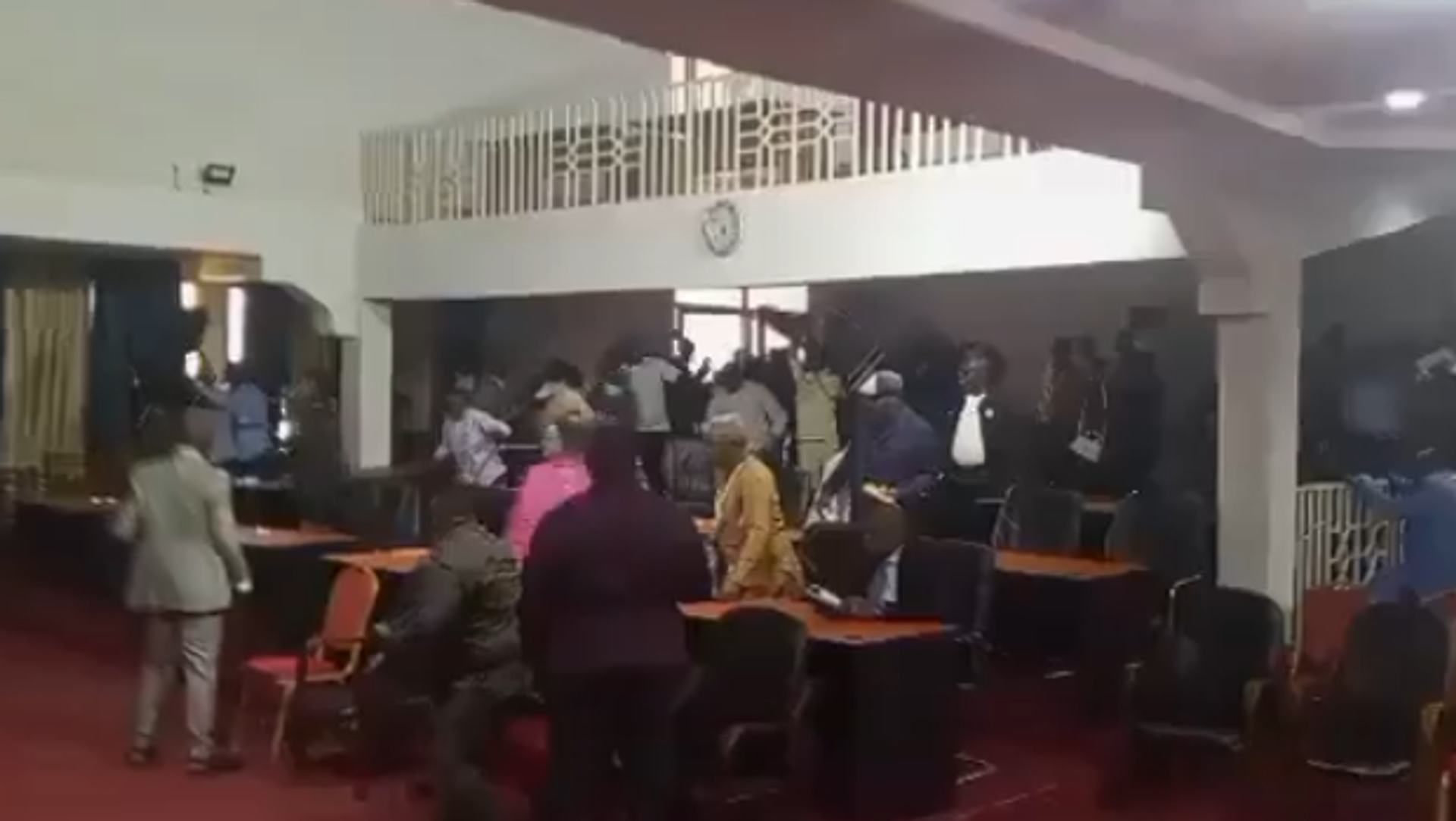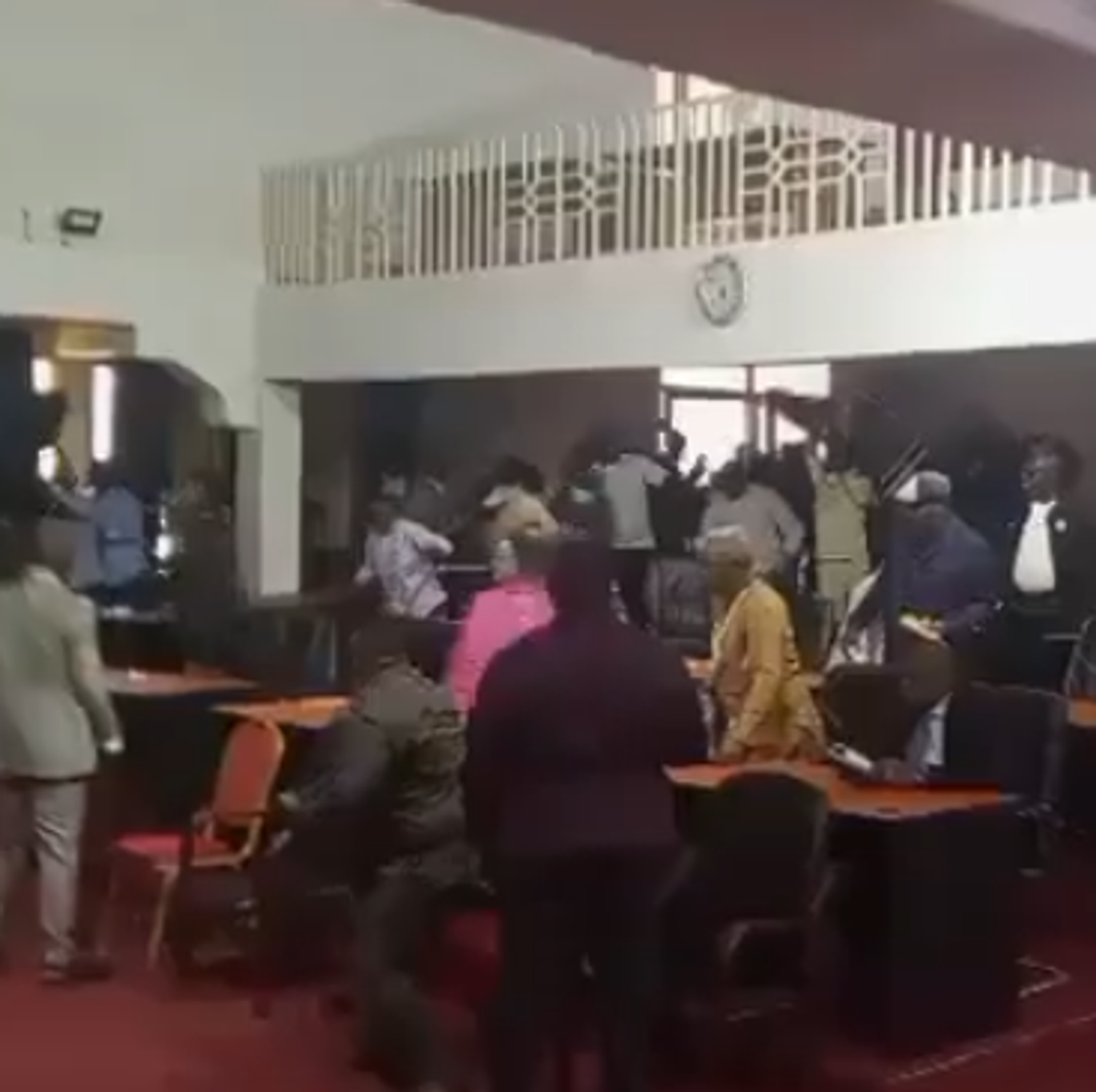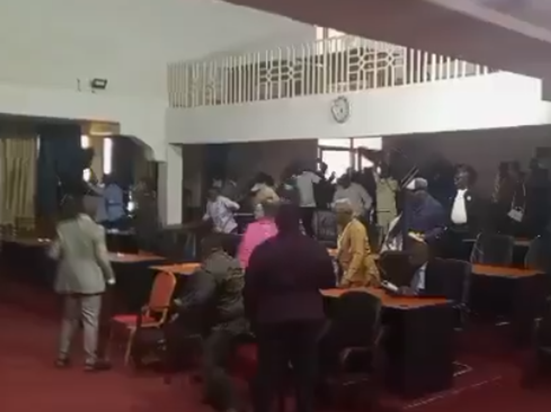 وشهدت القاعة حالة من الفوضى العارمة، حيث تبادل النواب الضرب وتكسير الطاولات والكراسي، ما أسفر عن إصابة شخصين وتحطيم عدد من النوافذ وتضرر المعدات داخل القاعة.