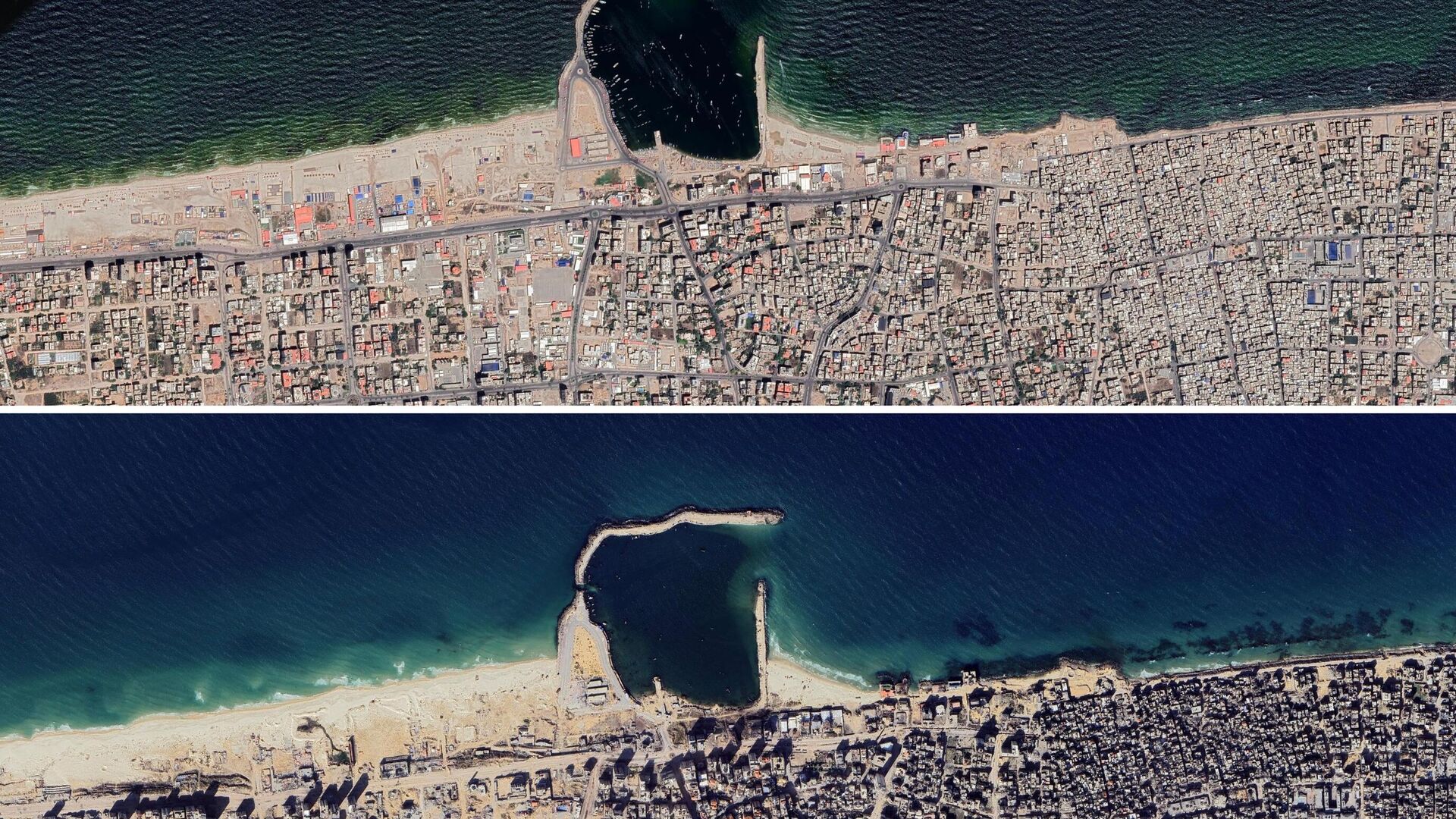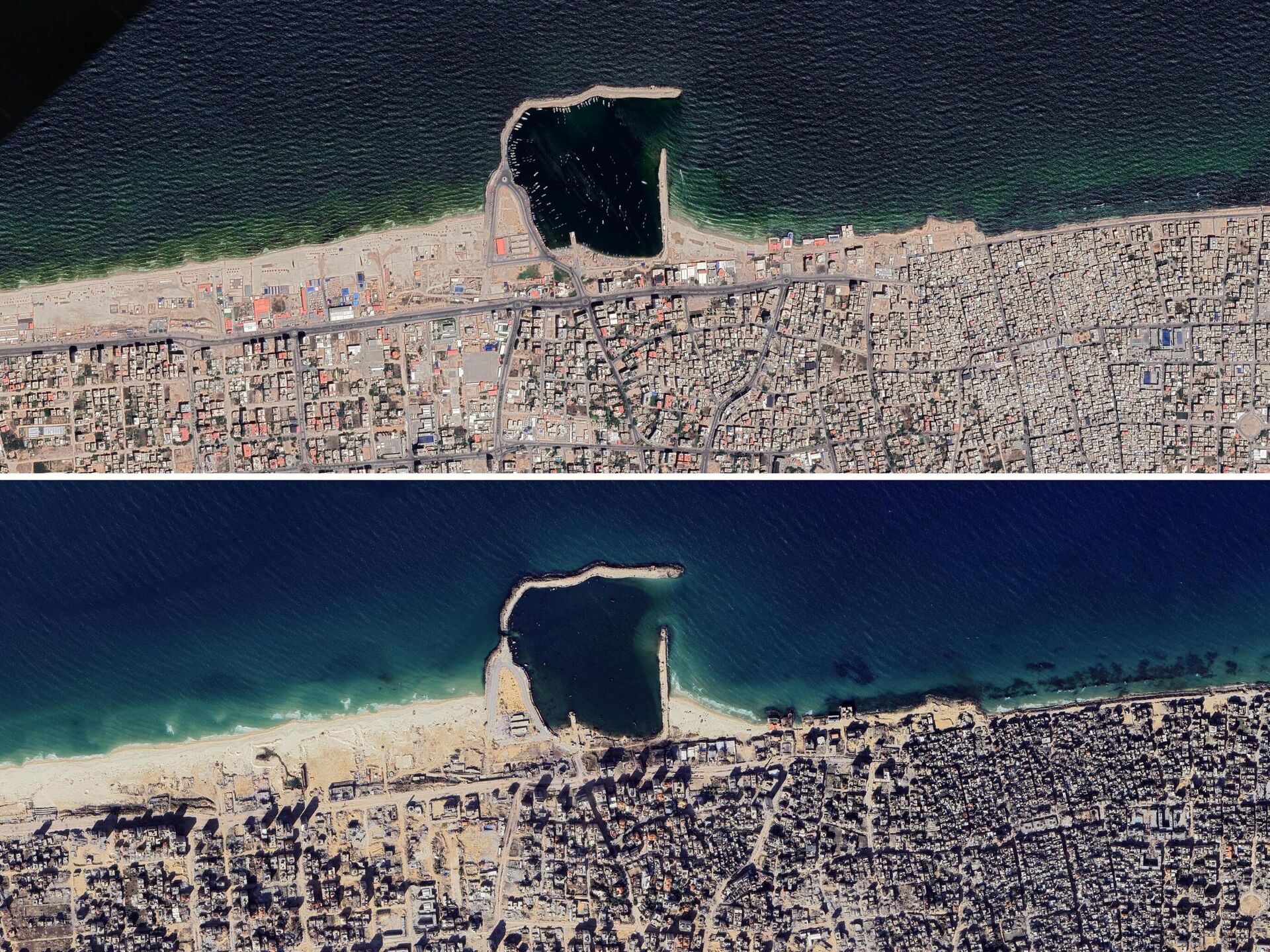 ساحل غزة قبل وبعد الهجمات الإسرائيلية التي بدأت في 7 أكتوبر 2023.