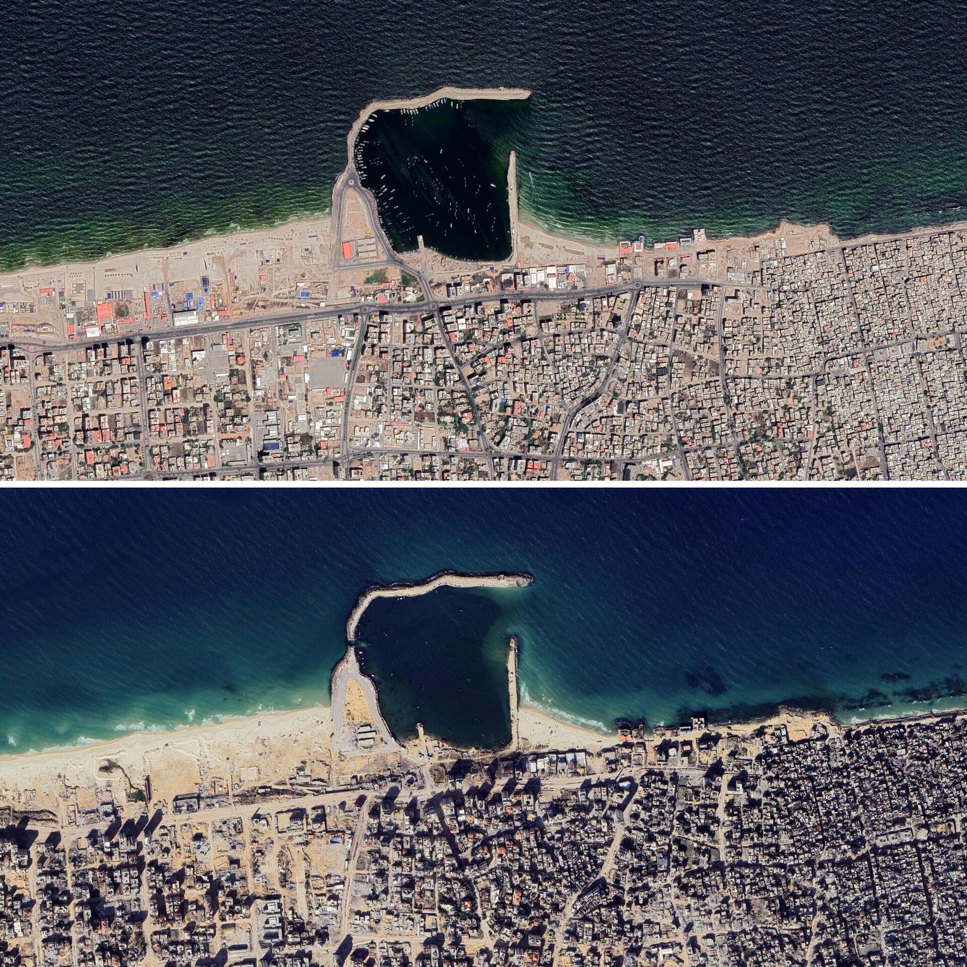 ميناء غزة قبل وبعد الهجمات الإسرائيلية.