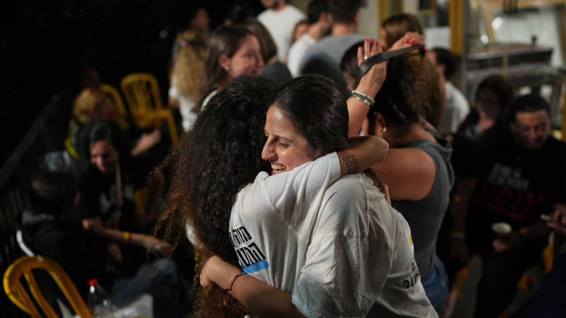 © AP Photo / Emilio Morenattiيحتفل أقارب الإسرى الإسرائيليين لدى حماس في قطاع غزة بالإعلان عن اتفاق إسرائيل وحماس على المرحلة الأولى من خطة السلام في في تل أبيب 9 أكتوبر 2025