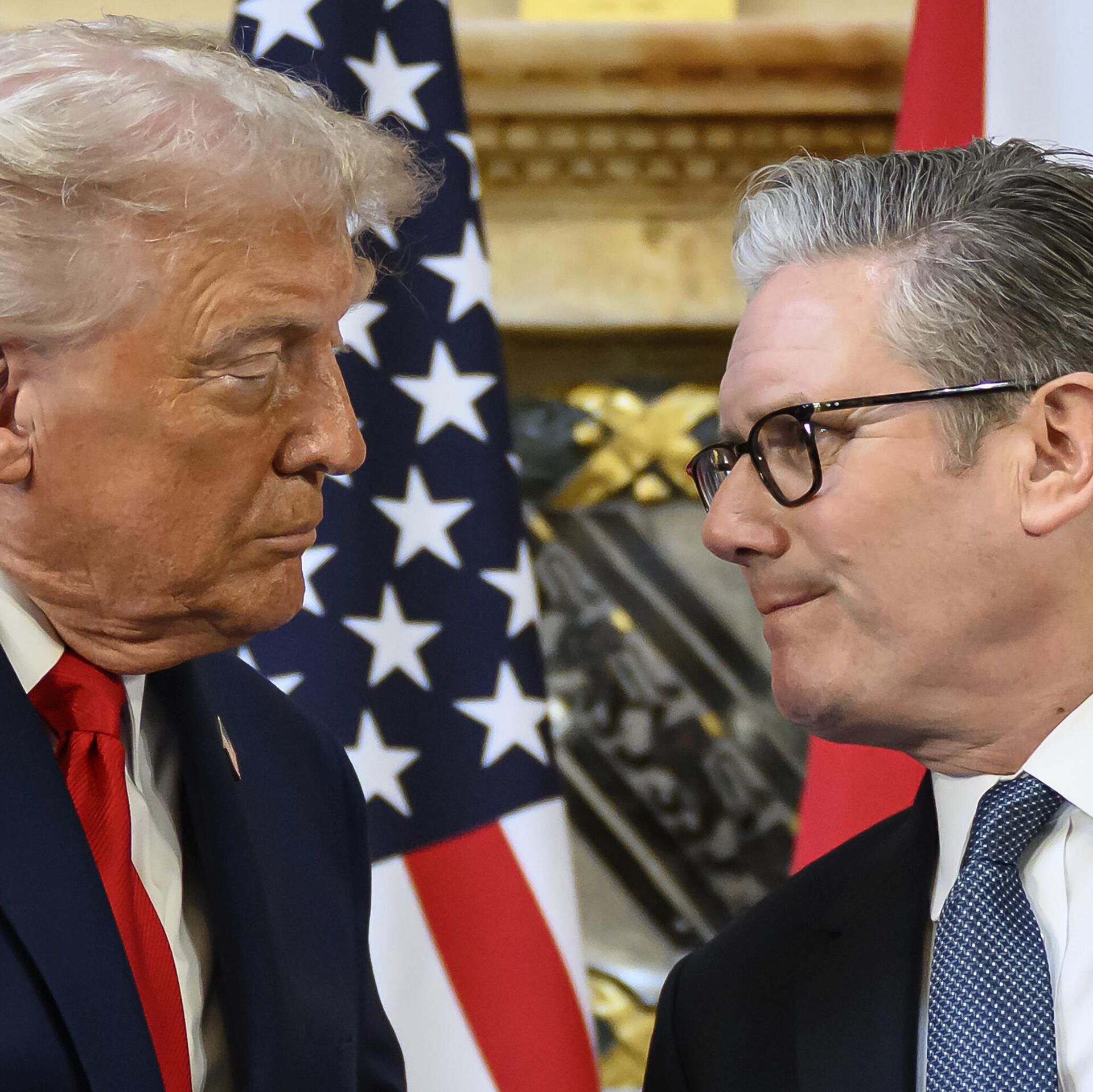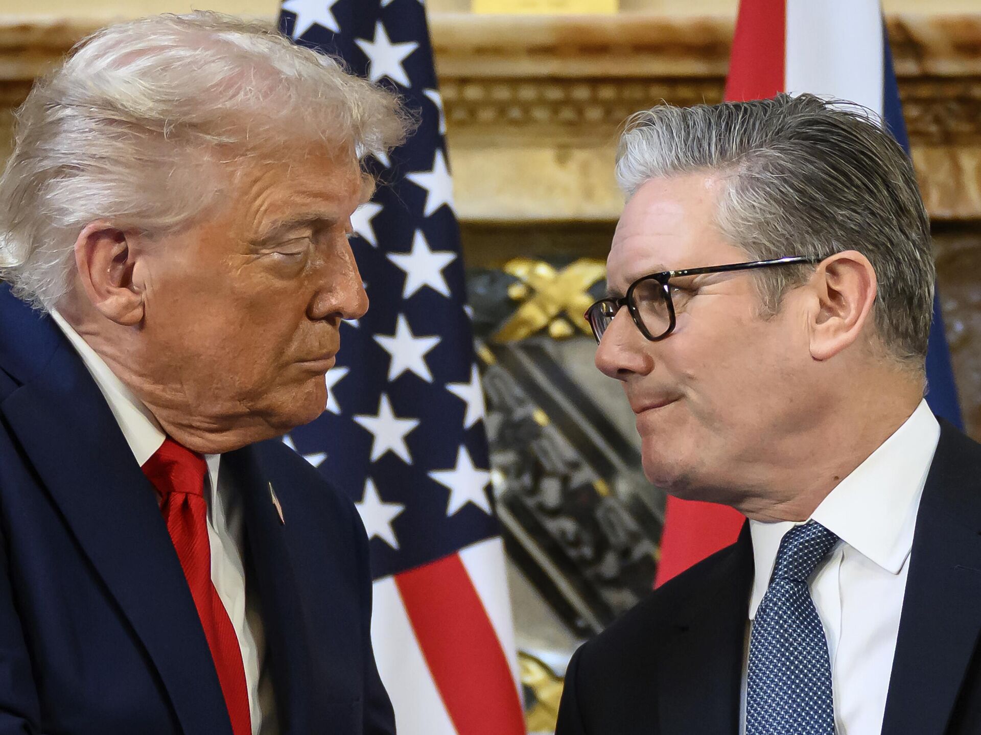 © AP Photo / Leon Nealالرئيس الأمريكي دونالد ترامب (يسارًا) ورئيس الوزراء البريطاني كير ستارمر يتبادلان النظرات أثناء مصافحتهما خلال مؤتمر صحفي