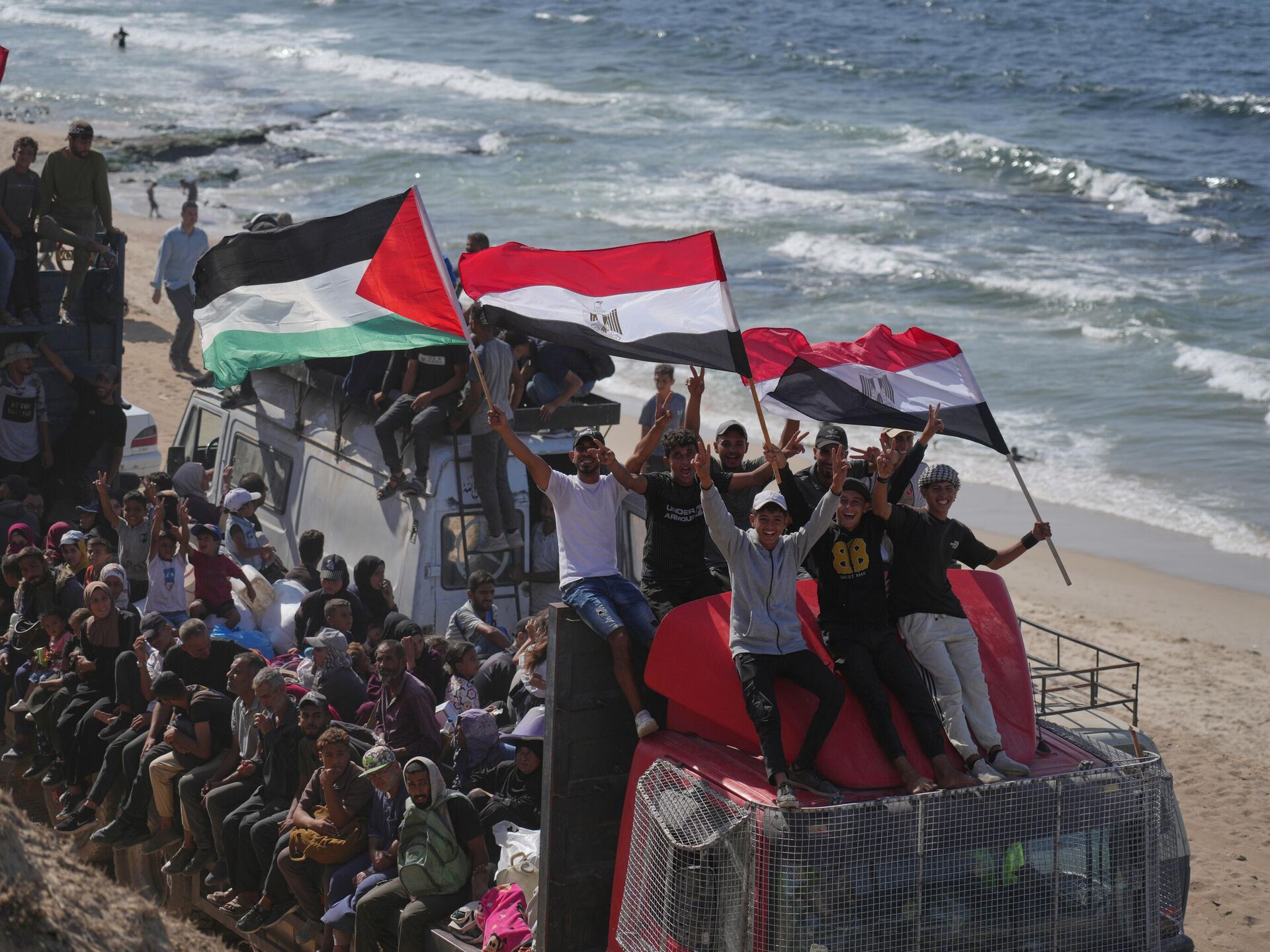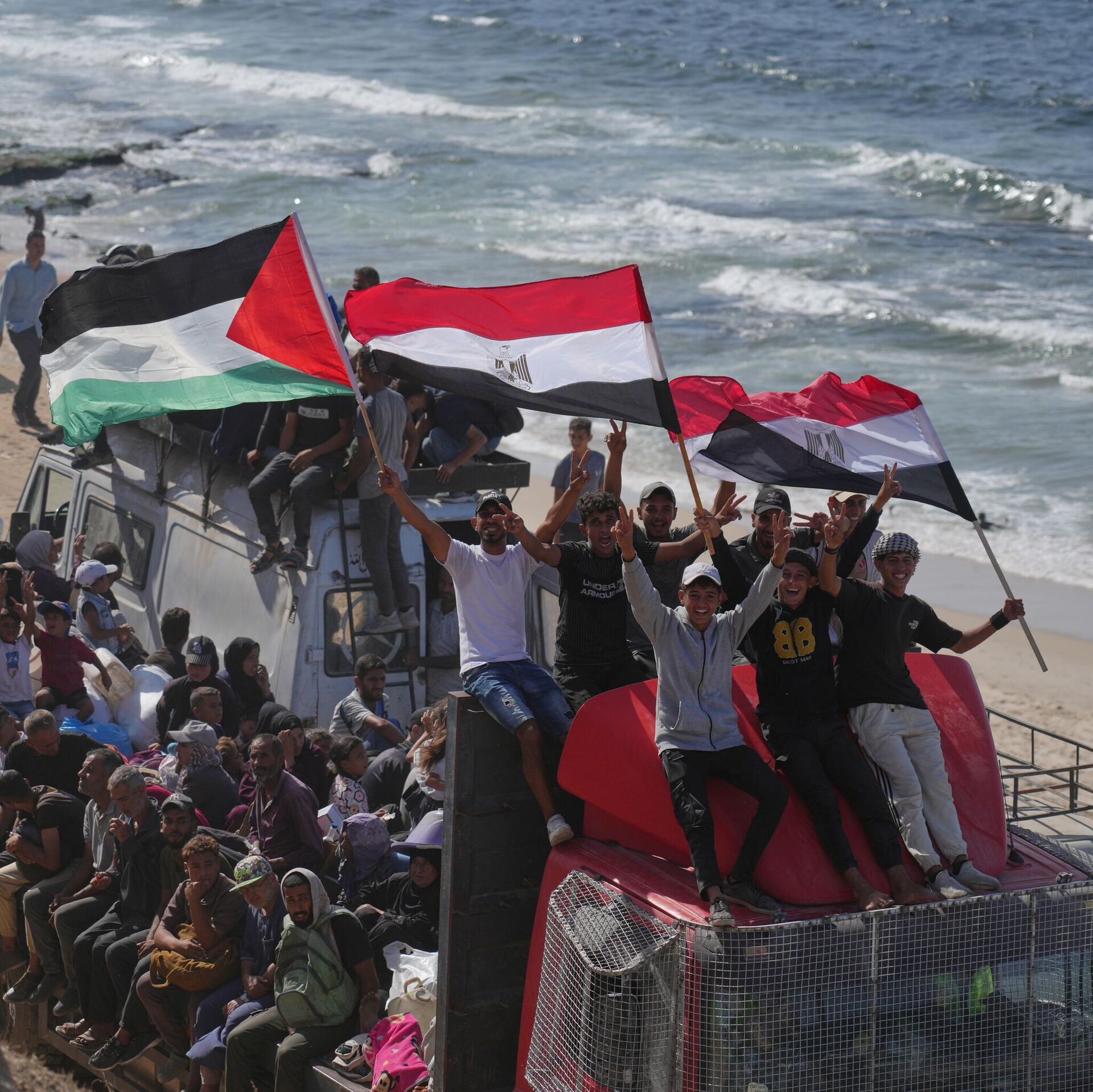 © AP Photo / Jehad Alshrafiنازحون فلسطينيون يركبون شاحنات محملة بأمتعتهم ويلوحون بالأعلام المصرية والفلسطينية أثناء سفرهم على طول الطريق الساحلي بالقرب من وادي غزة في وسط قطاع غزة، متجهين نحو مدينة غزة