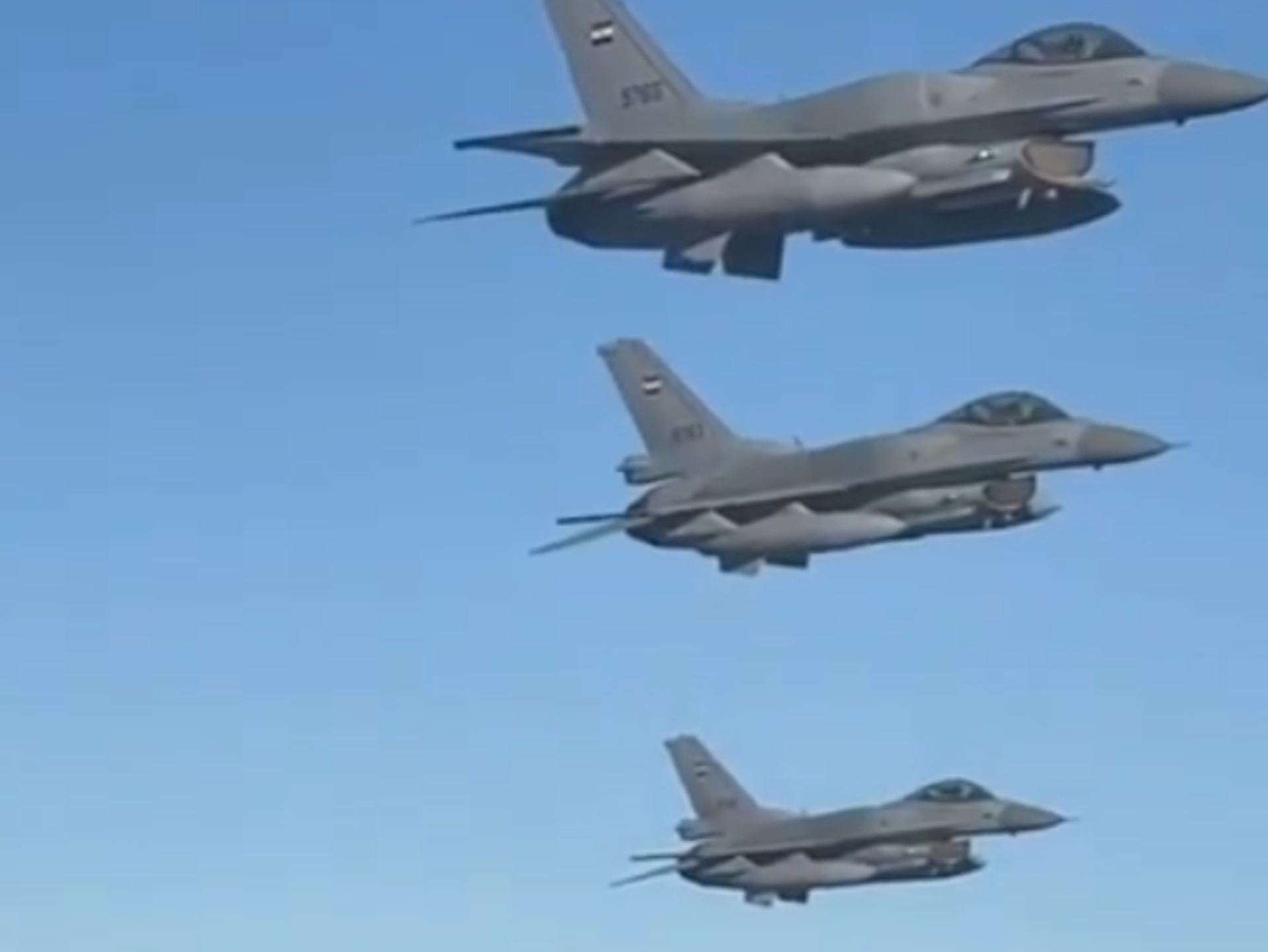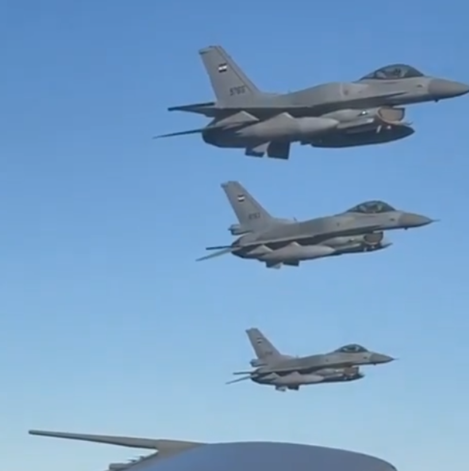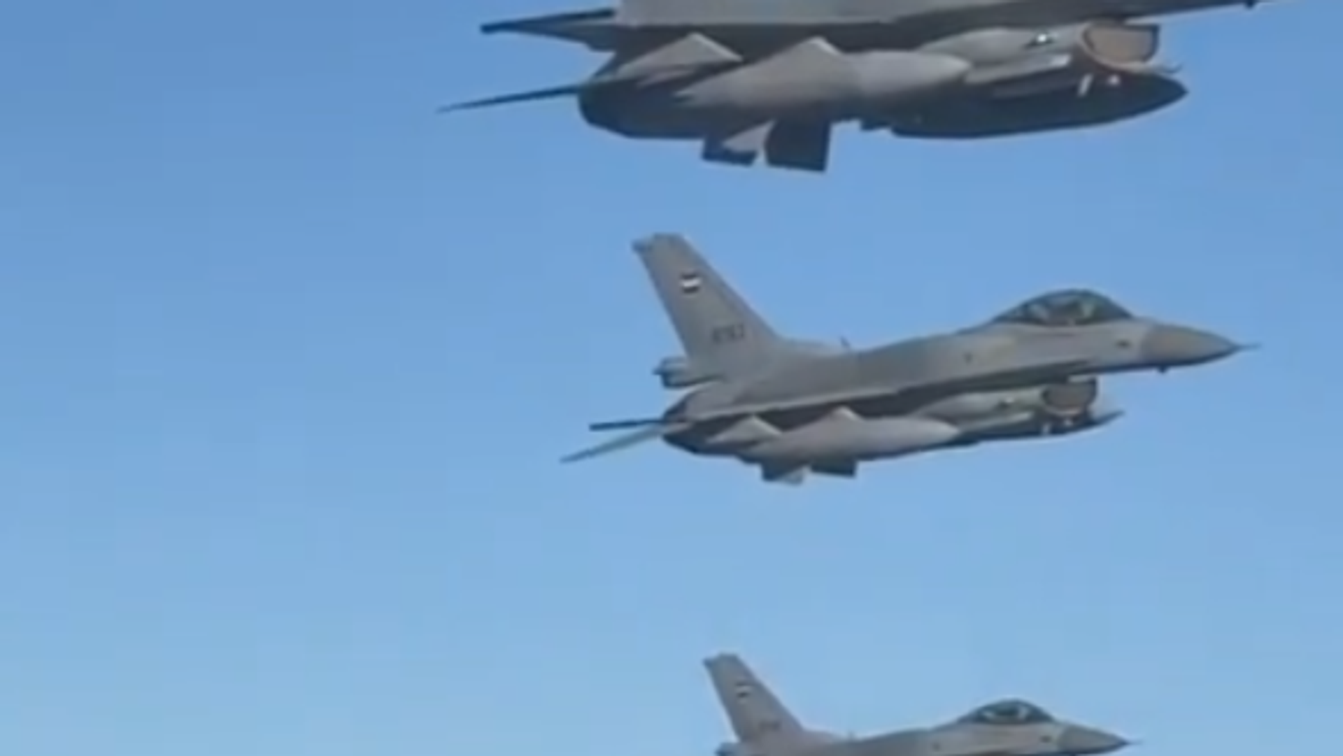 ويظهر في الفيديو 3 مقاتلات مصرية بجانب الطائرة الرئاسية الأمريكية في مشهد يعكس الإجراءات الأمنية العالية ومستوى الجاهزية للقوات المسلحة المصرية.