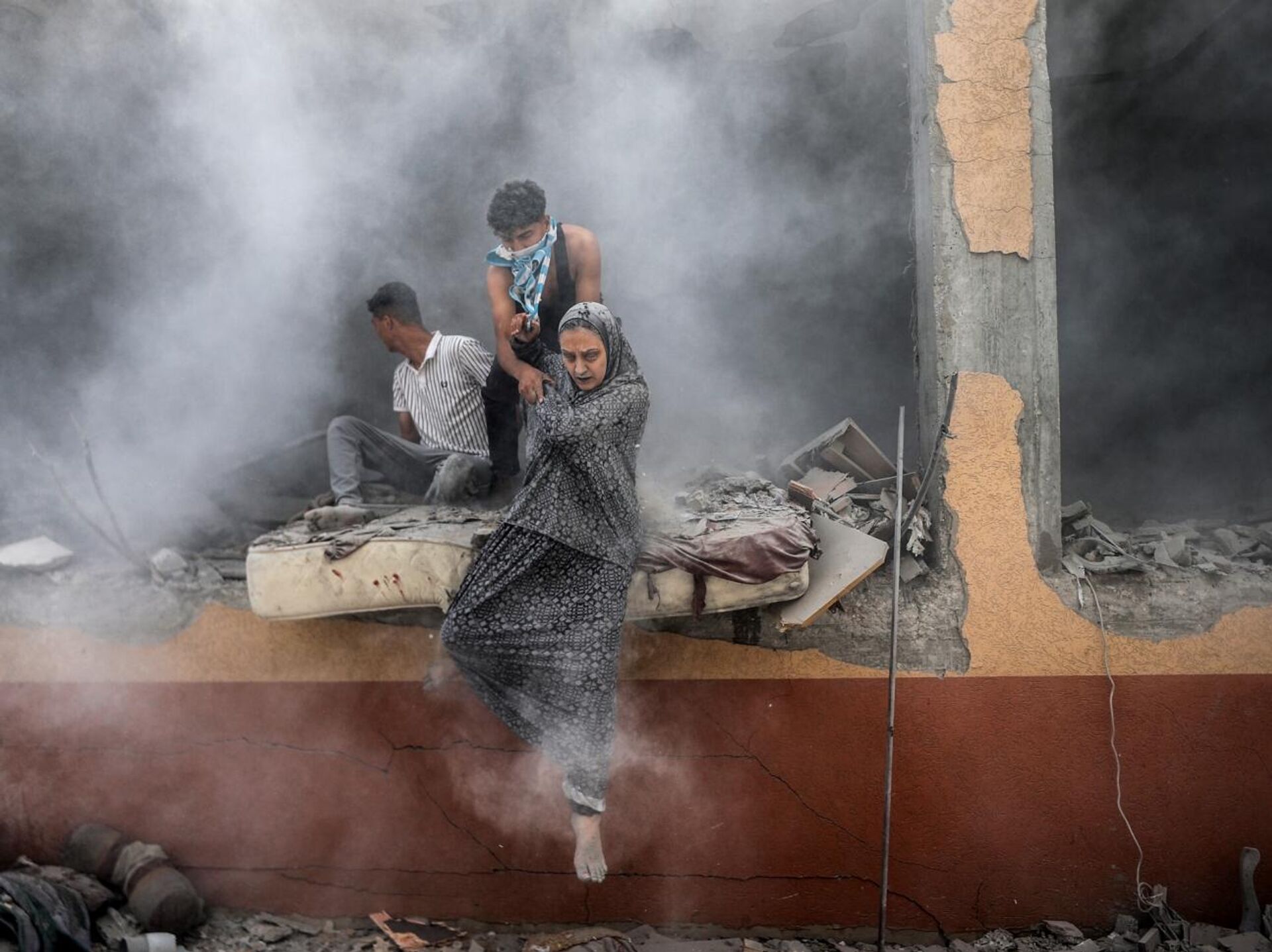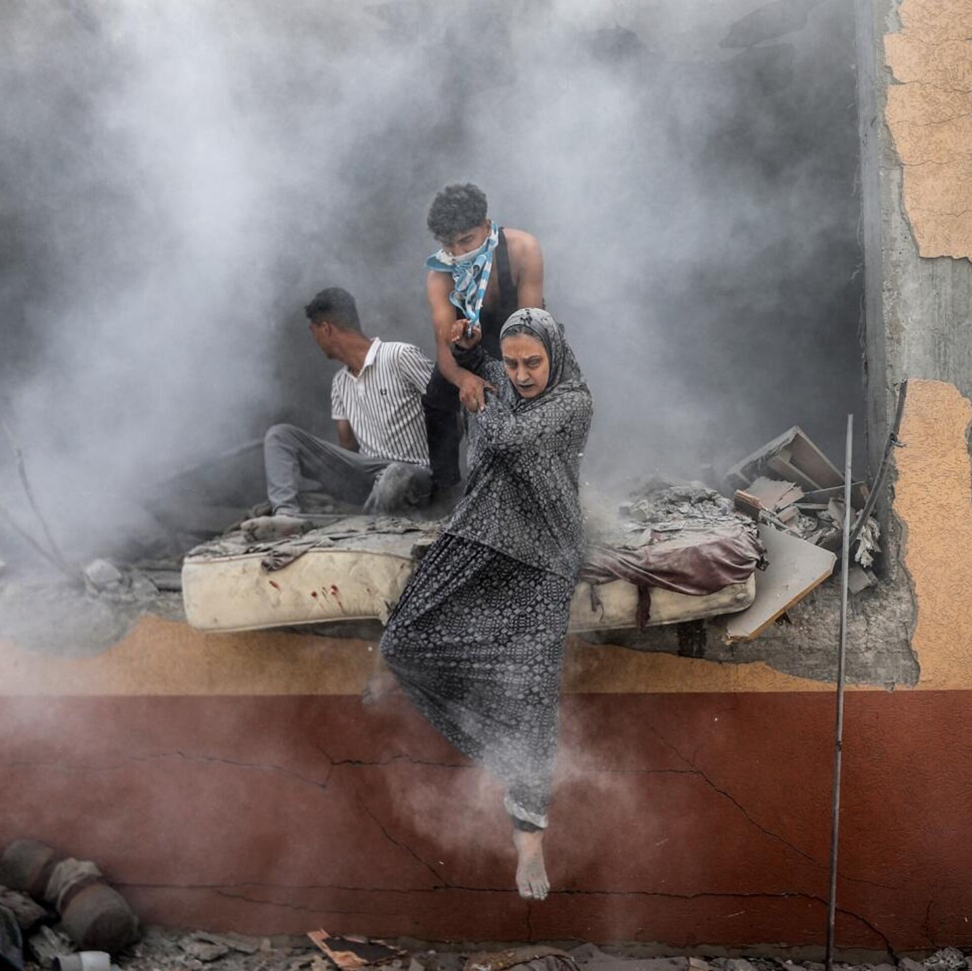 مغادرة المنزل. في أعقاب هجوم إسرائيلي في 14 يونيو/حزيران 2024، يخرج ثلاثة فلسطينيين من بين الأنقاض، ملابسهم ووجوههم مغطاة بالغبار. تدور أحداث المشهد في دير البلح، غزة، حيث تحول منزل عائلة أبو عائشة إلى ركام. وسط الدمار، يمشون بين الأنقاض، يتنقلون بين الخرسانة المحطمة، وتعابير وجوههم تعكس الصدمة والصمود. يبقى الهواء مليئًا بالغبار، ليذكرنا بالدمار المفاجئ.