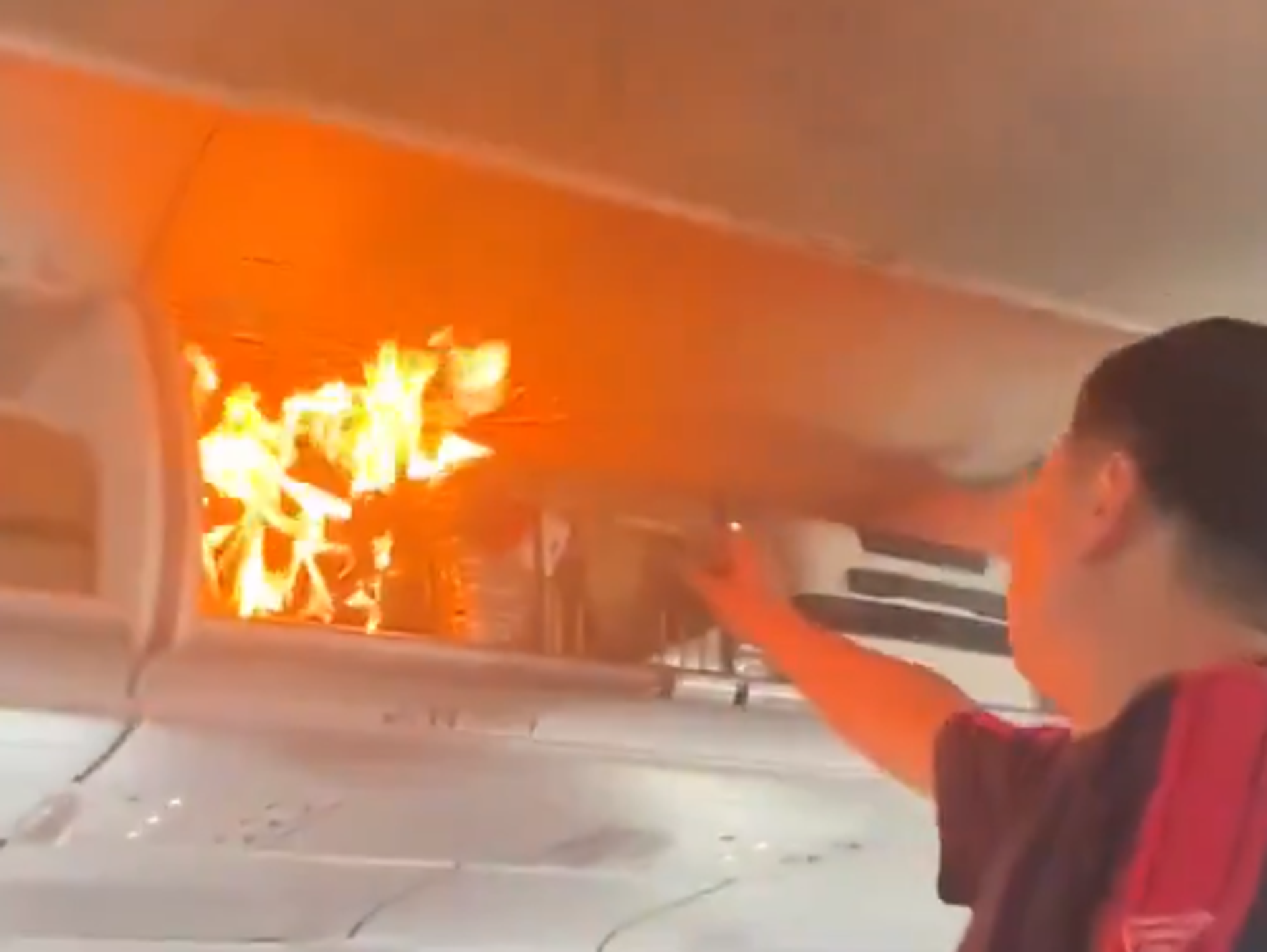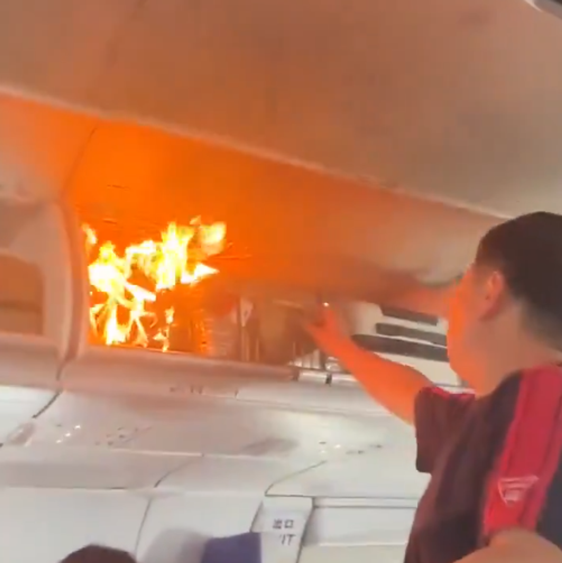 ويظهر في الفيديو ألسنة لهب تتصاعد من حجرة التخزين العلوية مع ذعر وهلع بين الركاب نتيجة انفجار بطارية ليثيوم في حقيبة أحد الركاب، ما أدى إلى حريق في صندوق الأمتعة العلوي.
