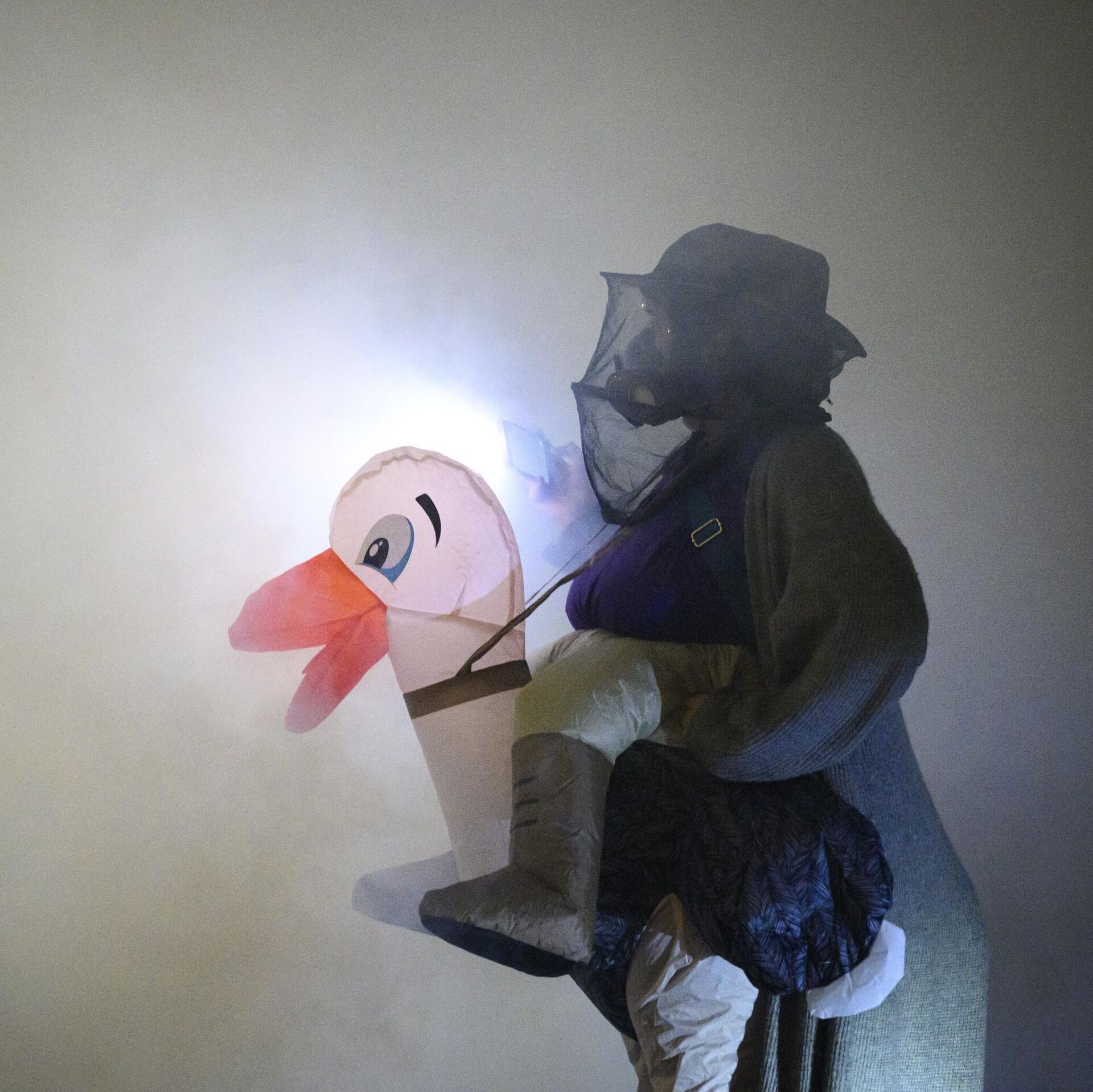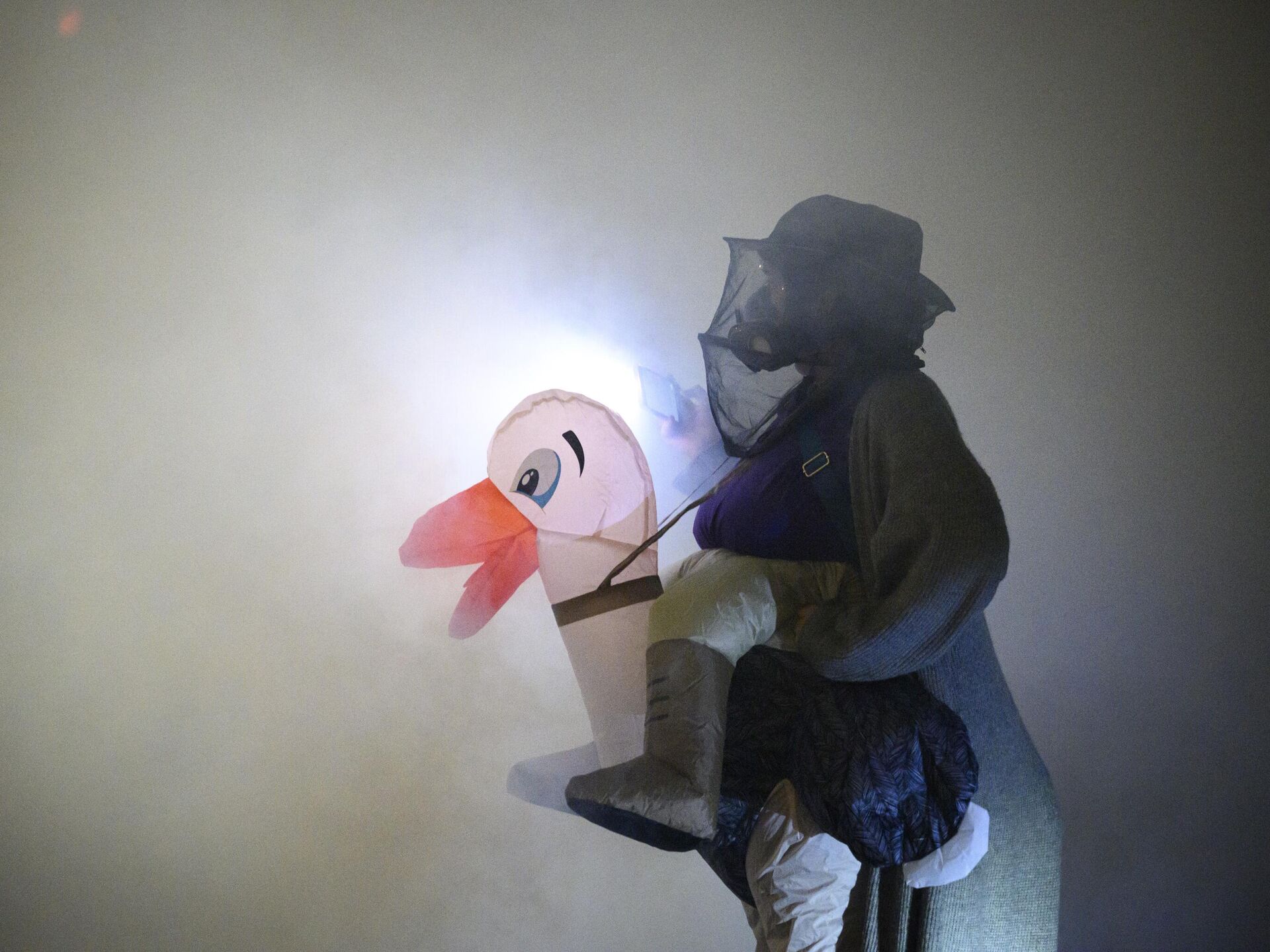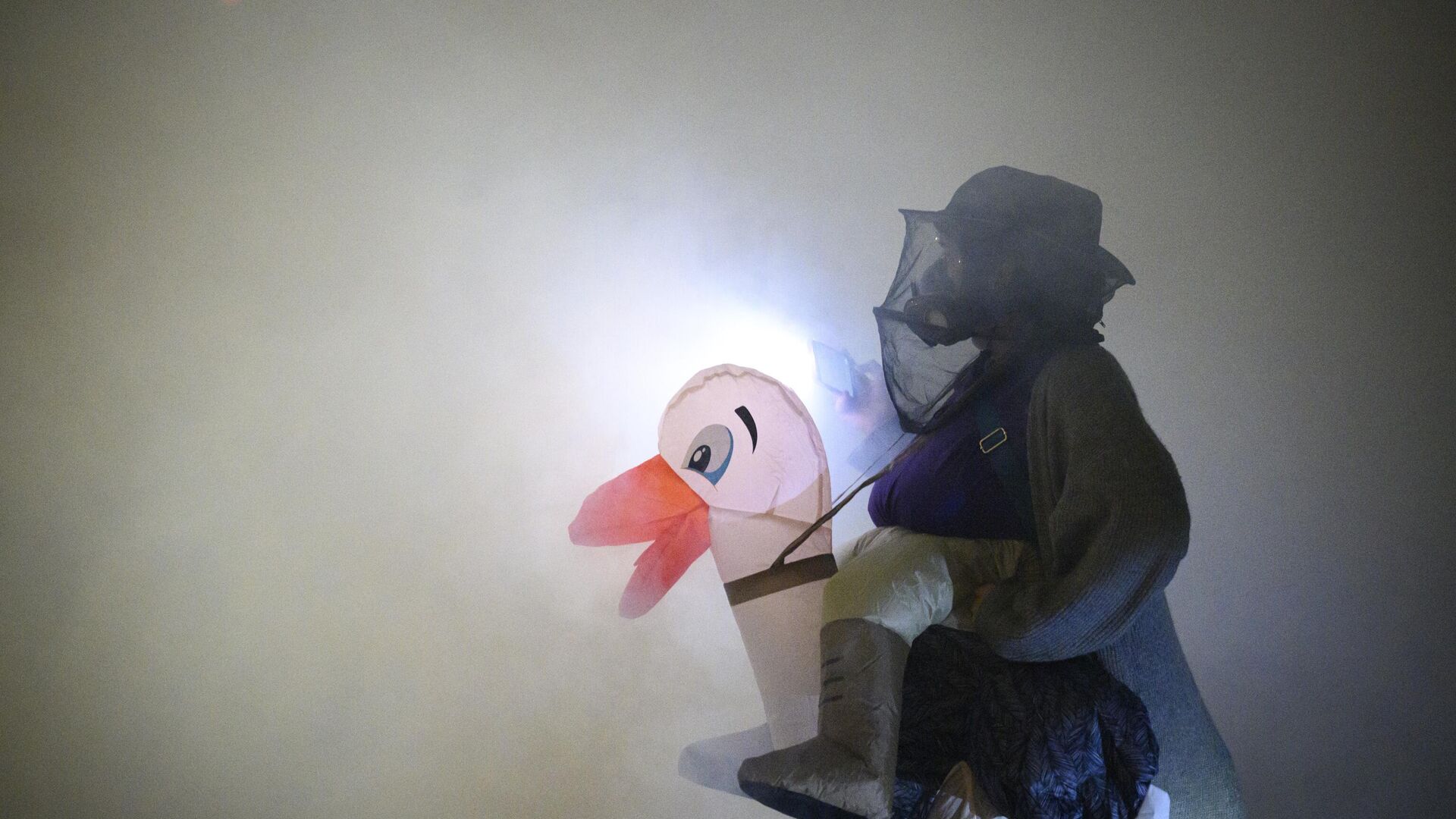 يقف متظاهر مناهض لإدارة الهجرة والجمارك الأمريكية يرتدي بدلة قابلة للنفخ ضمن سحابة من الغاز المسيل للدموع خارج مبنى إدارة الهجرة والجمارك الأمريكية في بورتلاند بولاية أوريغون.