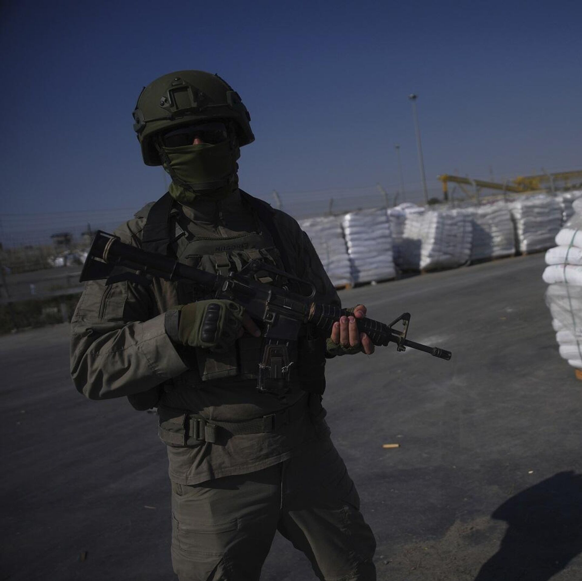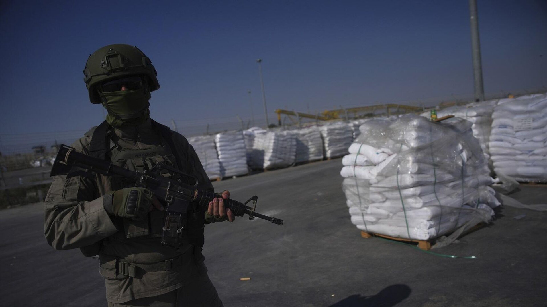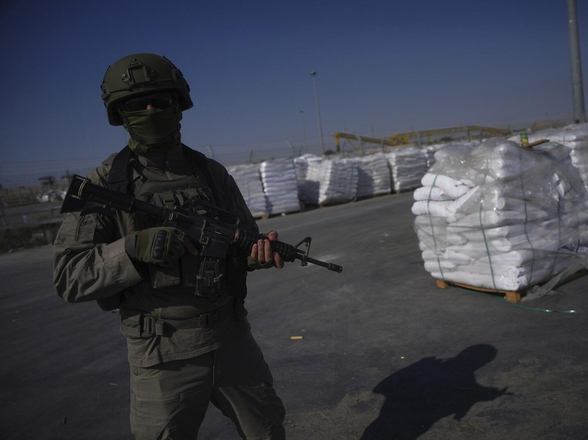 © AP Photo / Ohad Zwigenbergجندي إسرائيلي يقف بجانب طرود مساعدات إنسانية تنتظر الاستلام على الجانب الفلسطيني من معبر كرم أبو سالم في قطاع غزة، 24 يوليو/ تموز 2025.