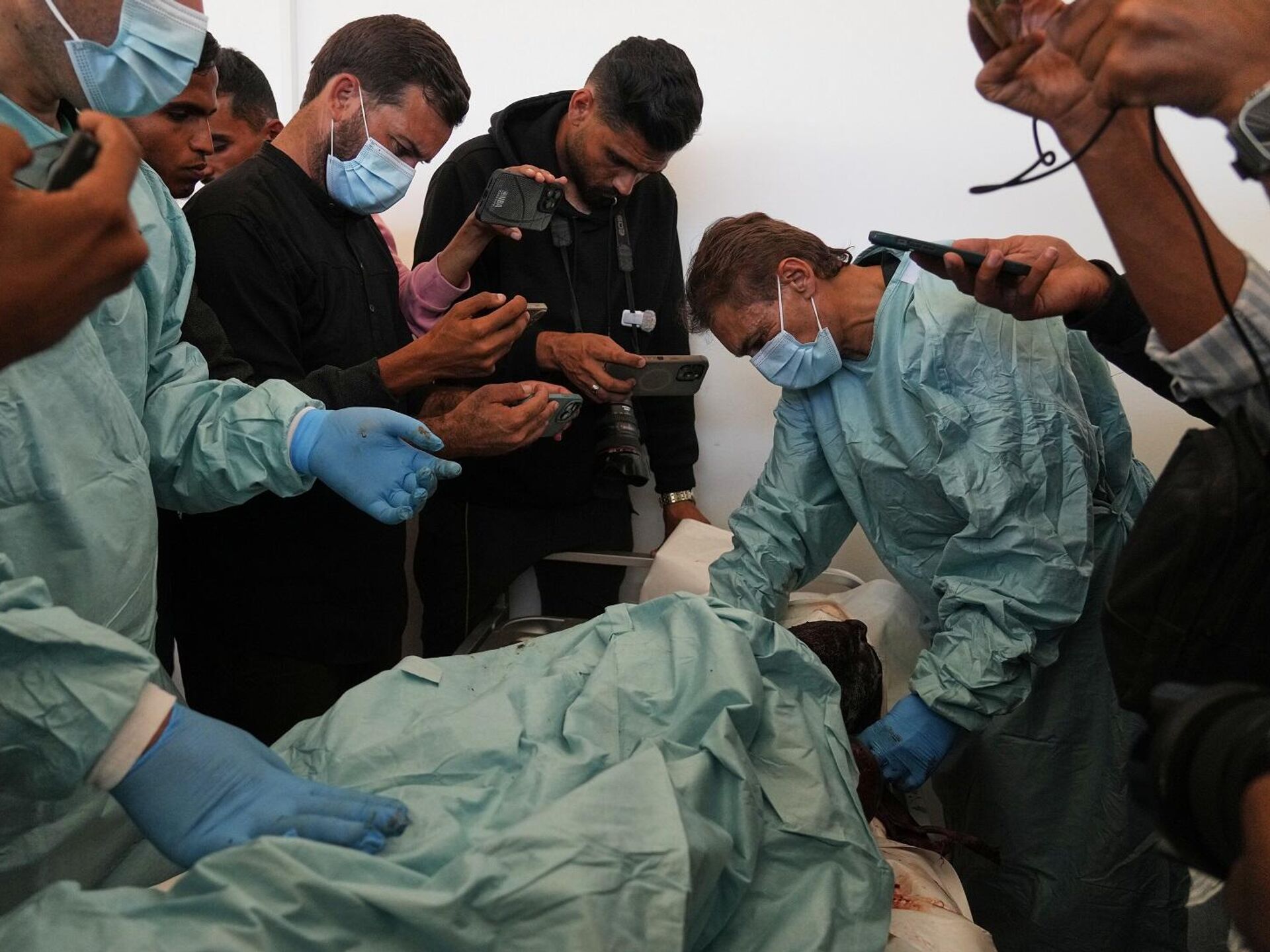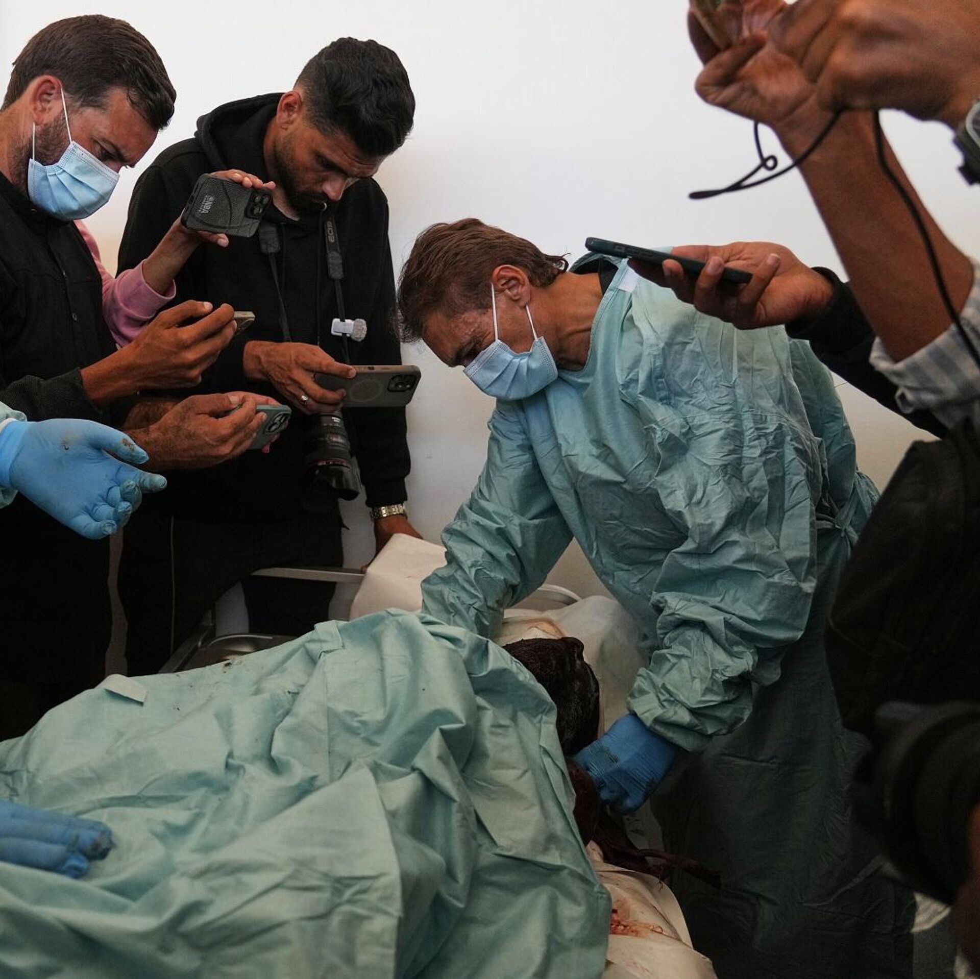 أطباء فلسطينيون يفحصون جثث فلسطينيين احتجزتهم إسرائيل خلال الحرب، كجزء من عملية التعرف على هوياتهم في مستشفى ناصر في خان يونس جنوب قطاع غزة، 18 أكتوبر/ تشرين الأول 2025 - سبوتنيك عربي, 1920, 20.10.2025