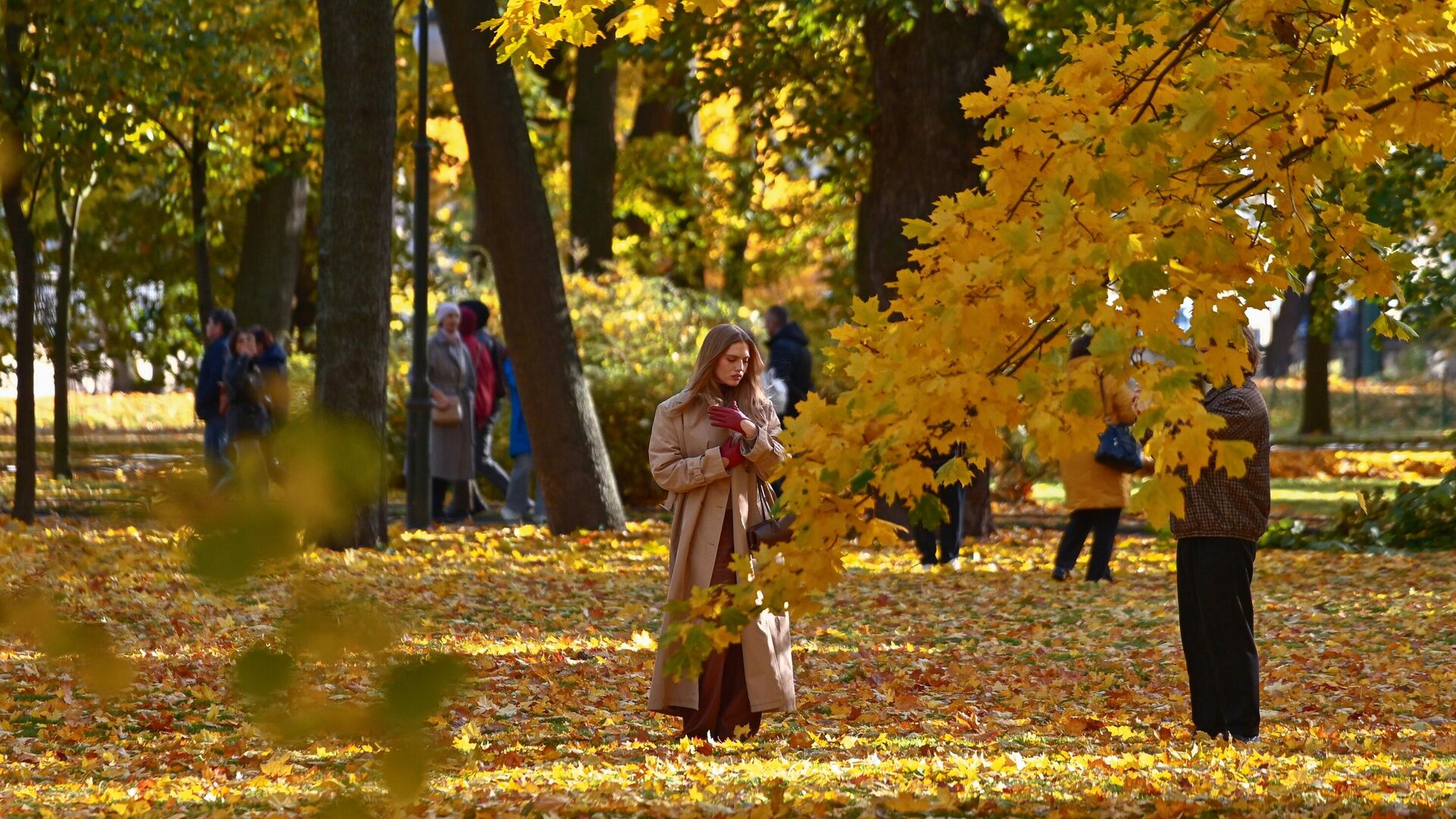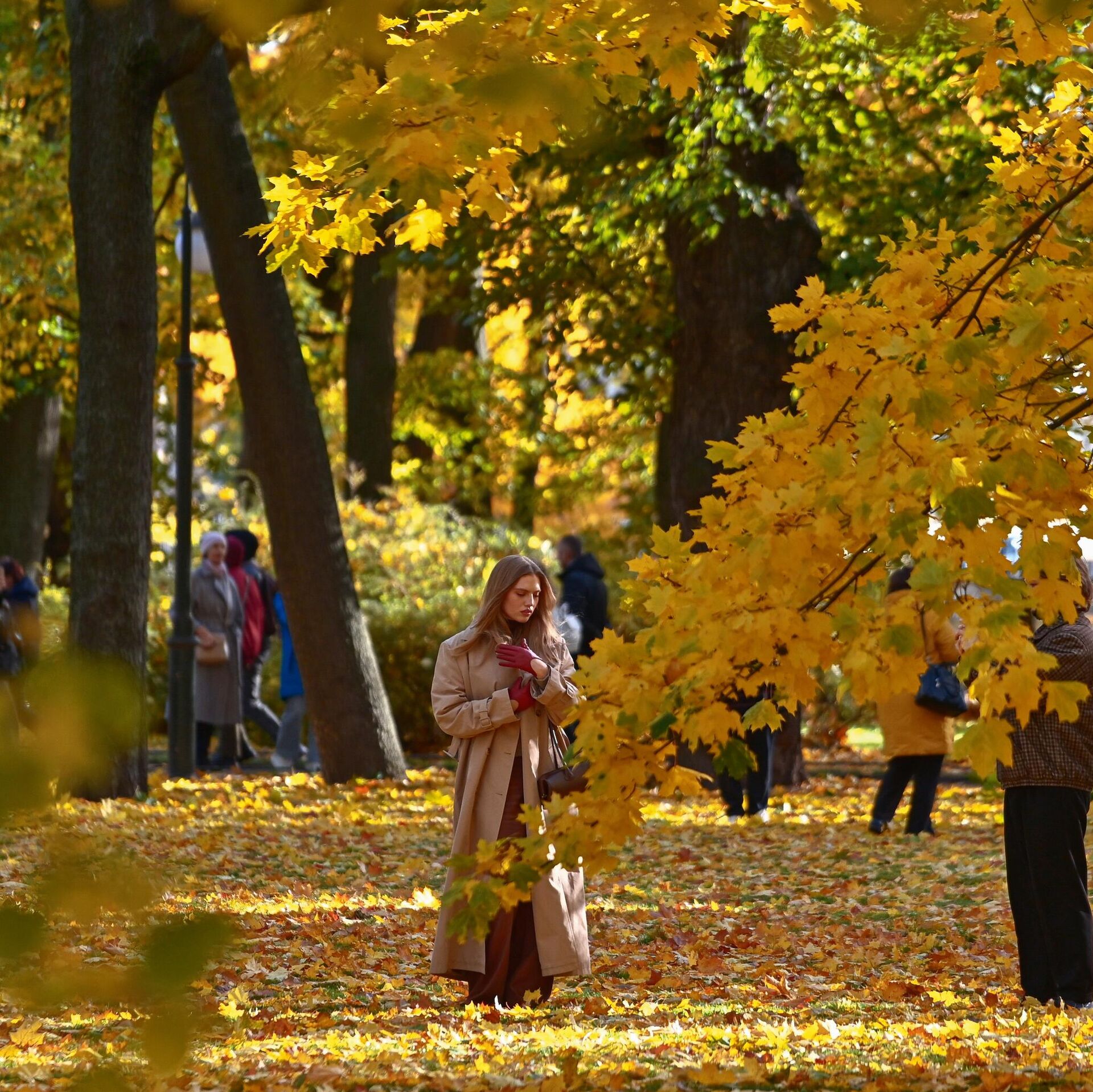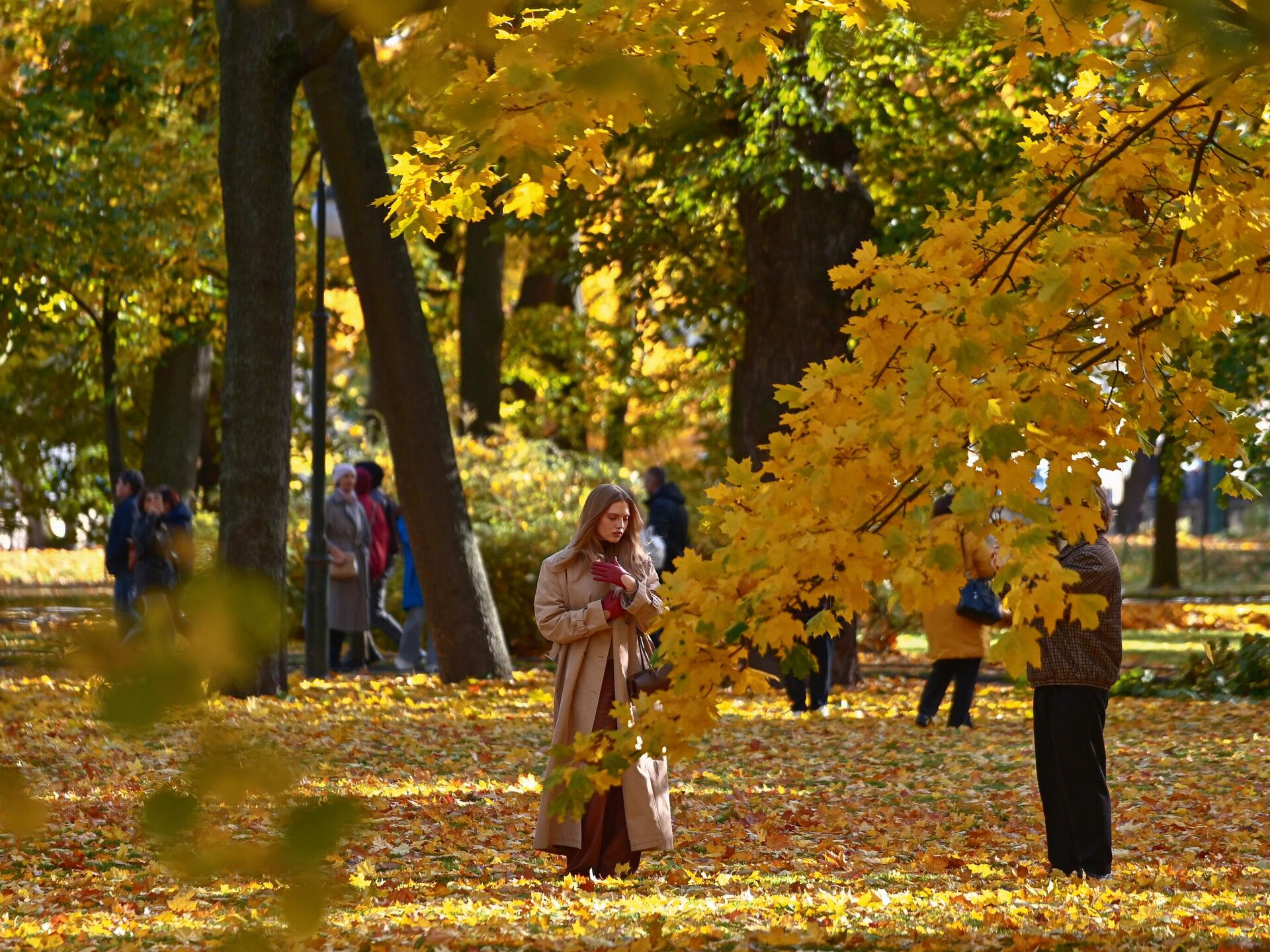 زوار في حديقة "ميخائيلوفسكي" في سان بطرسبورغ يستمتعون بألوان الخريف التي تزين المدينة.