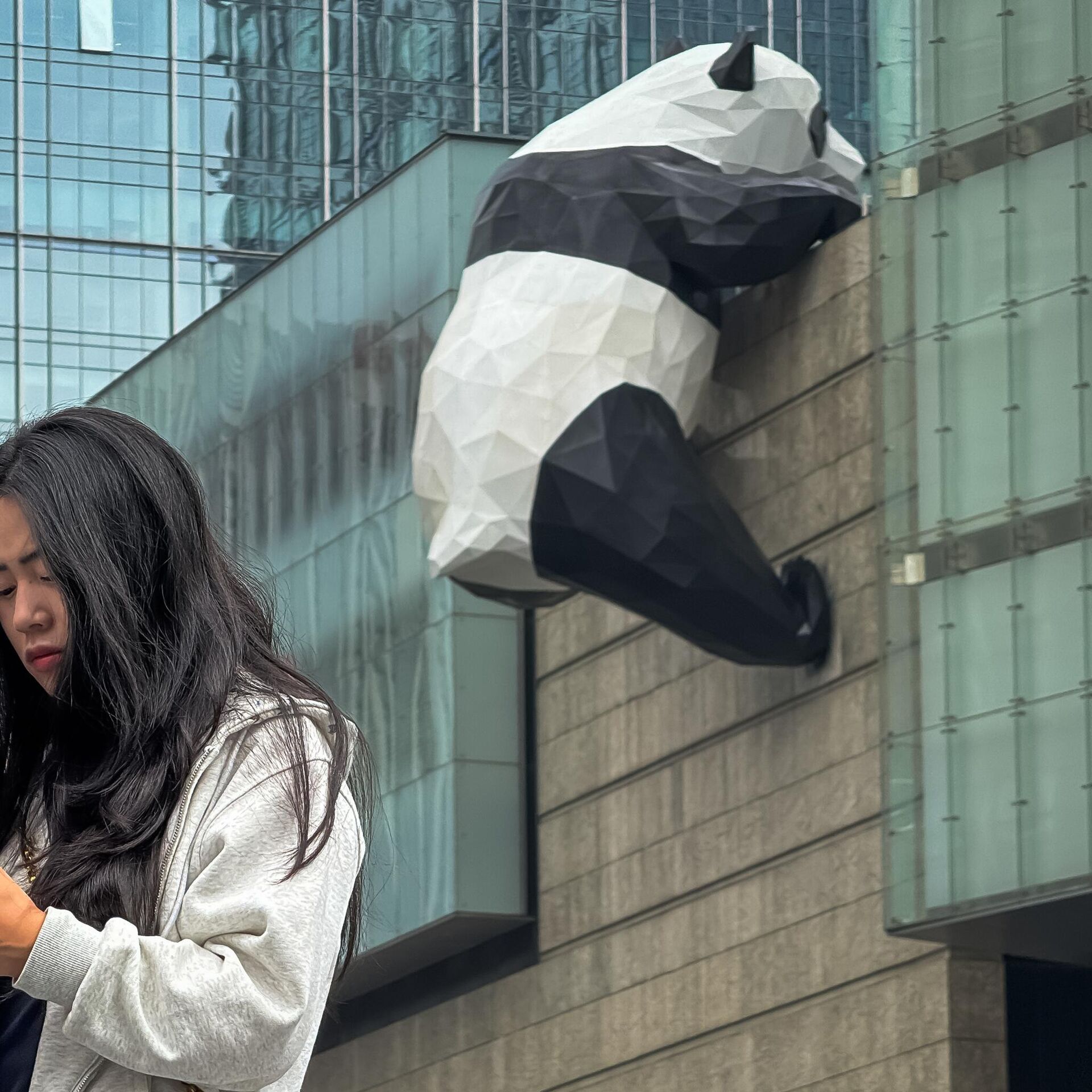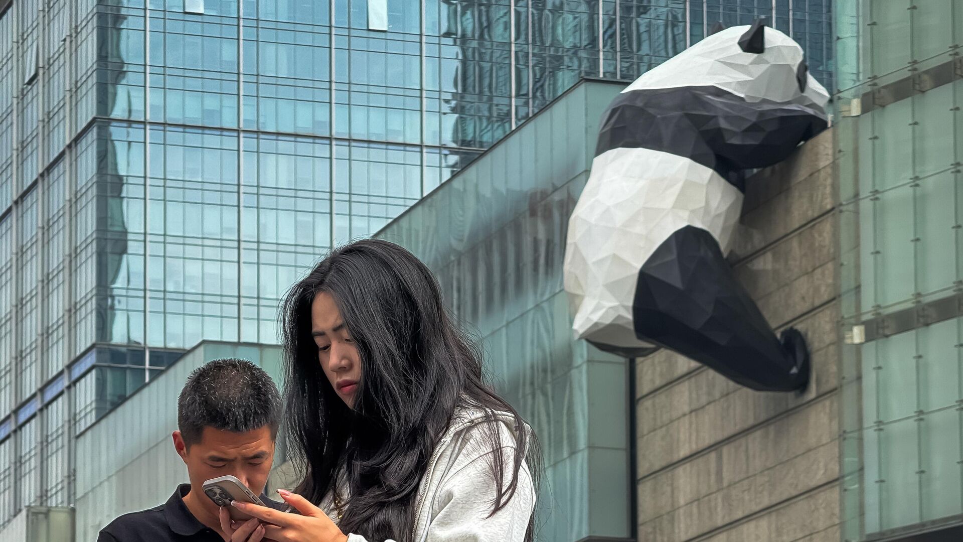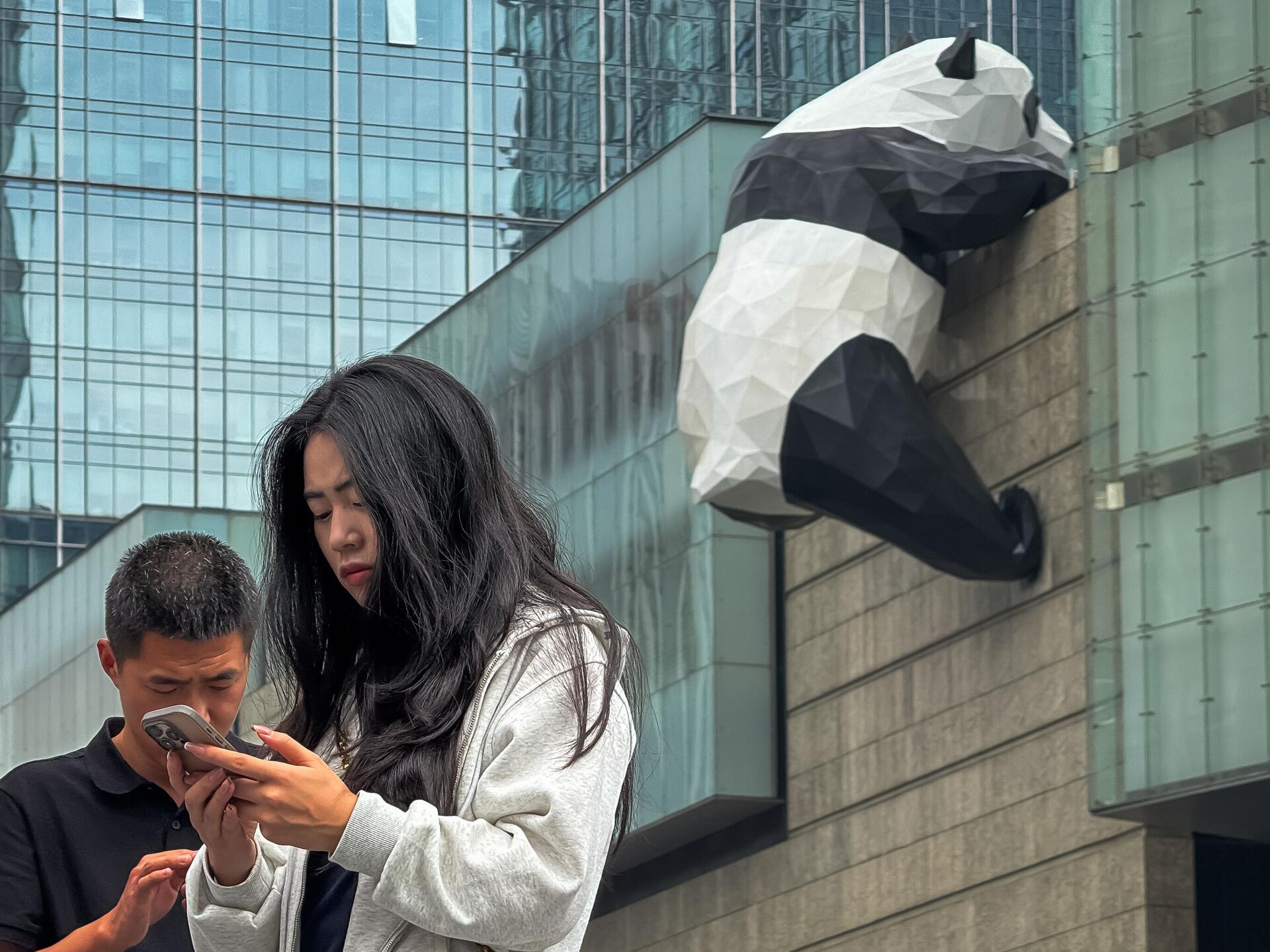 مشاة يتفقدون هواتفهم الذكية بالقرب من تمثال الباندا العملاق الشهير على الجدار الخارجي لمركز التسوق "ساحة تشنغدو المالية الدولية"، أحد معالم المدينة الشهيرة.
