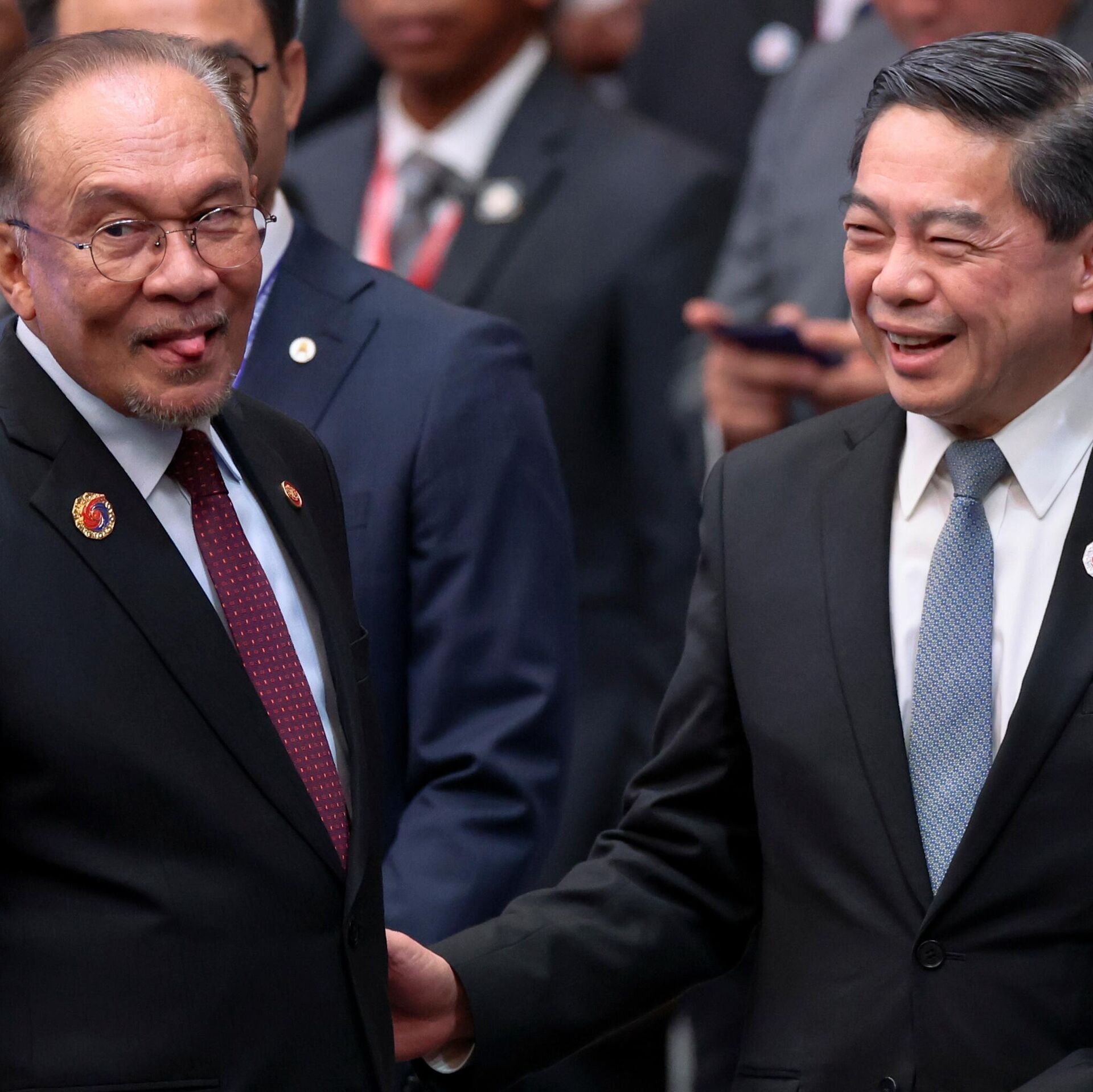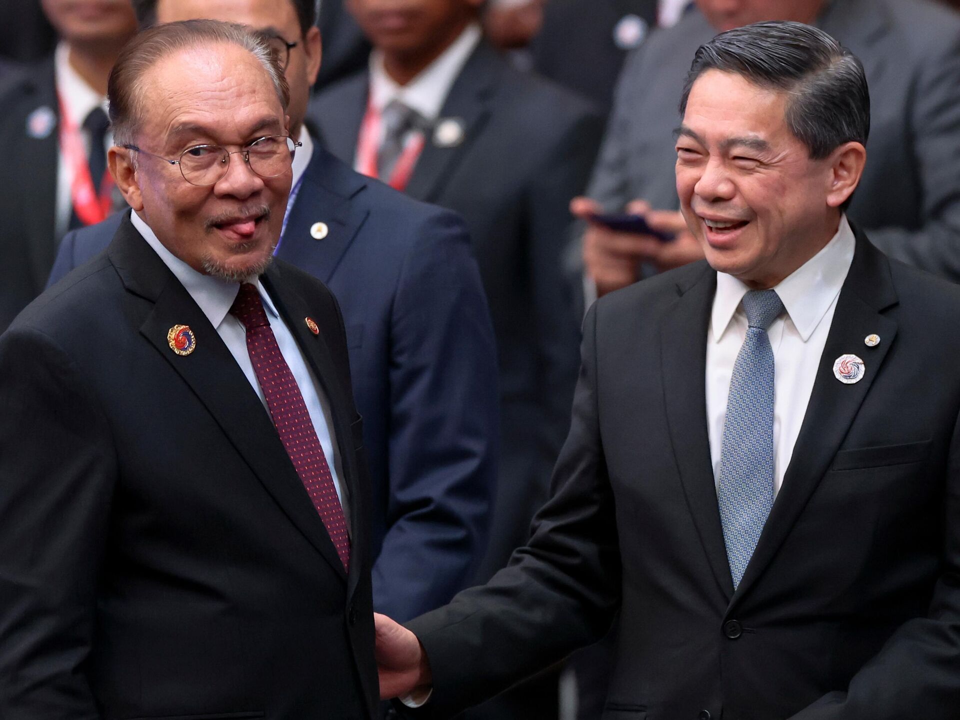 رئيس الوزراء الصيني، لي تشيانغ (يسار)، يصافح رئيس الوزراء الماليزي أنور إبراهيم لدى وصوله إلى مركز مؤتمرات كوالالمبور لحضور القمة الـ47 لرابطة دول جنوب شرق آسيا في ماليزيا