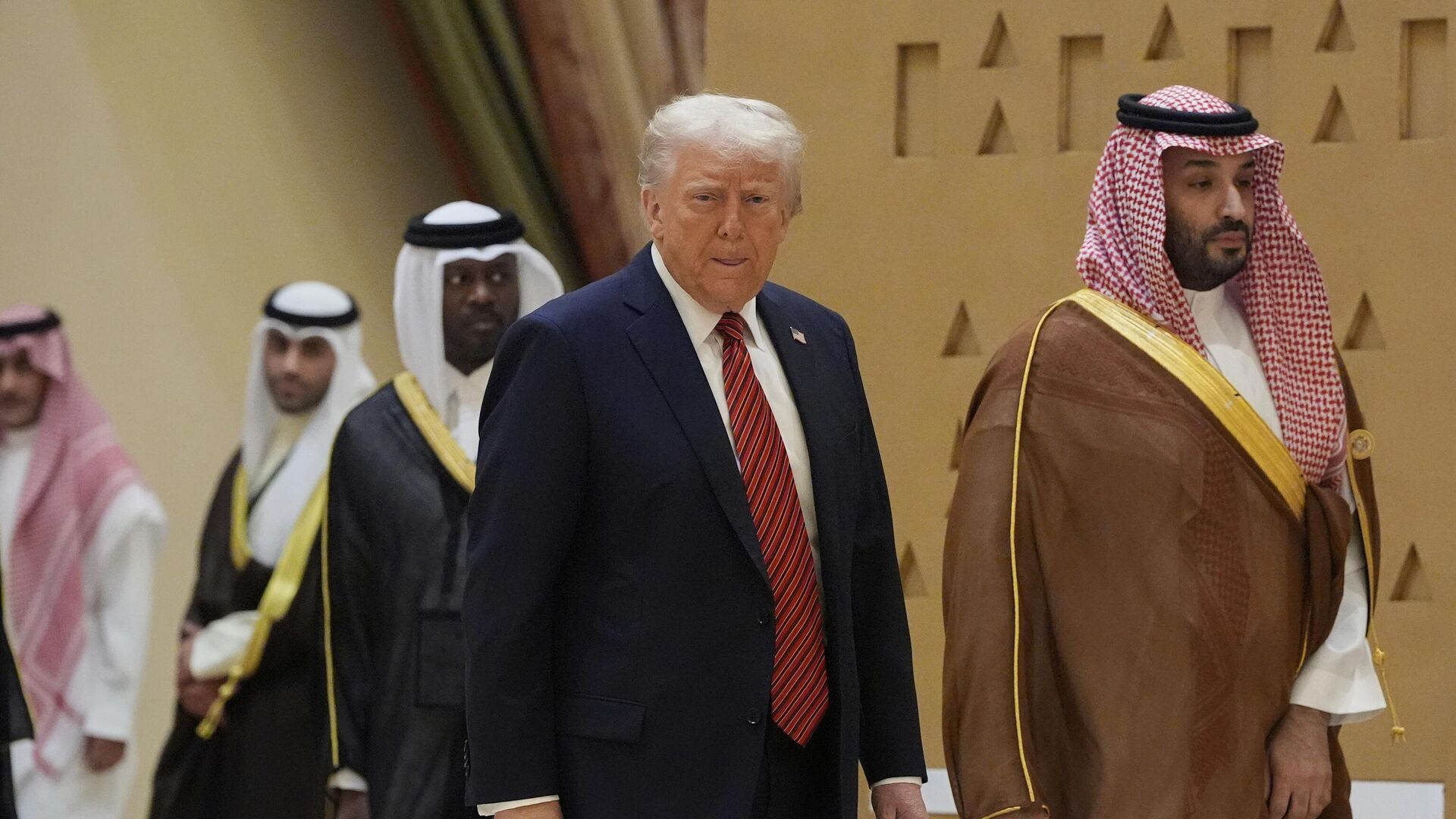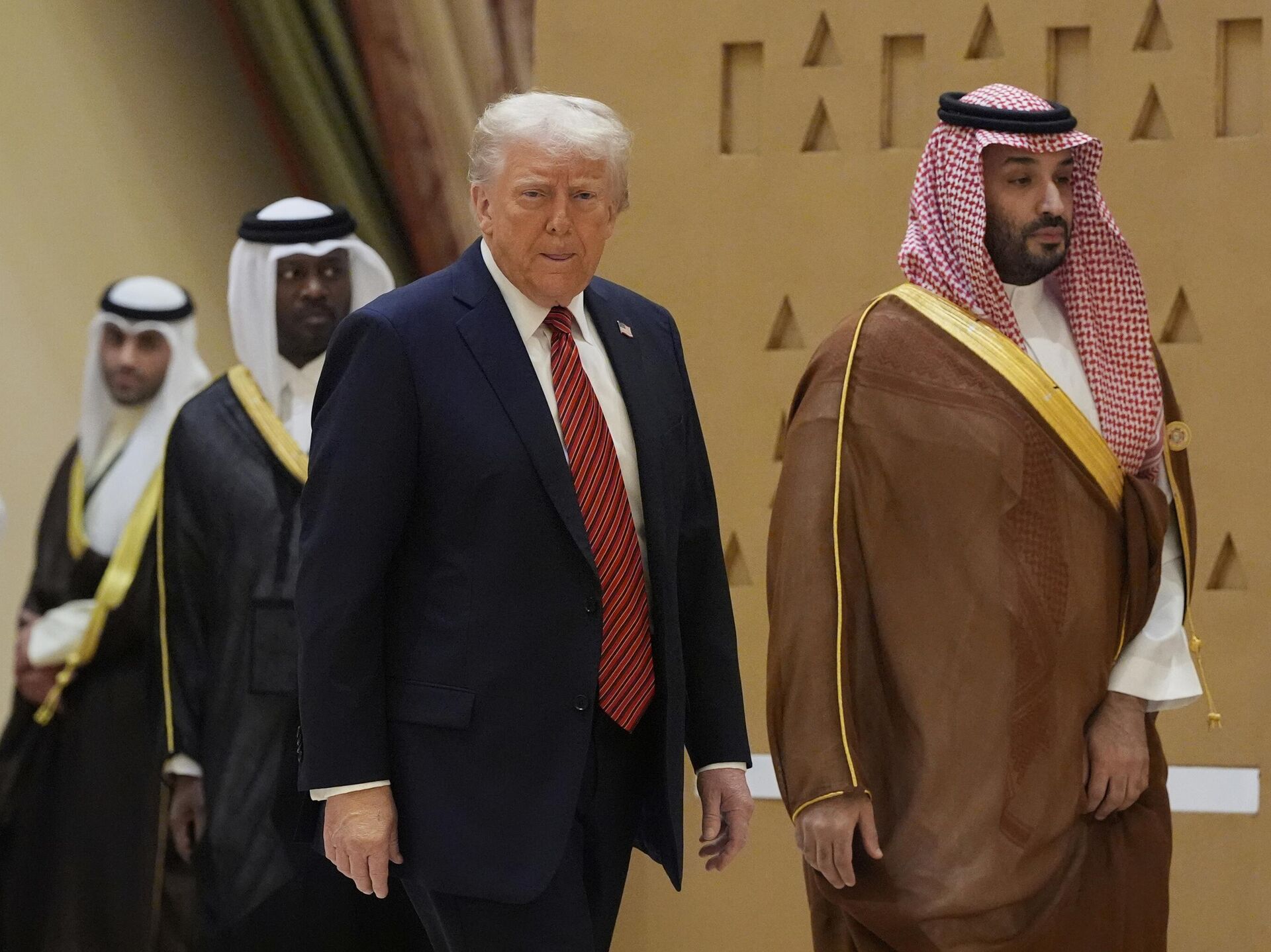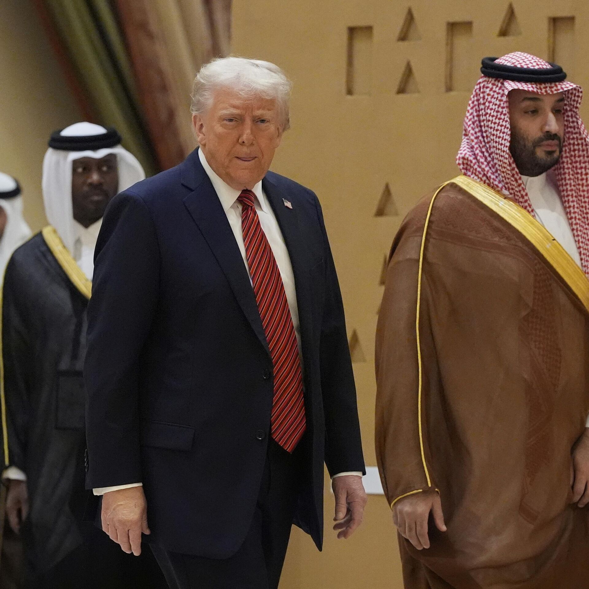 © AP Photo / Alex Brandonالرئيس دونالد ترامب يصل مع ولي العهد السعودي الأمير محمد بن سلمان لالتقاط صورة جماعية مع قادة مجلس التعاون الخليجي خلال قمة مجلس التعاون الخليجي في الرياض، المملكة العربية السعودية