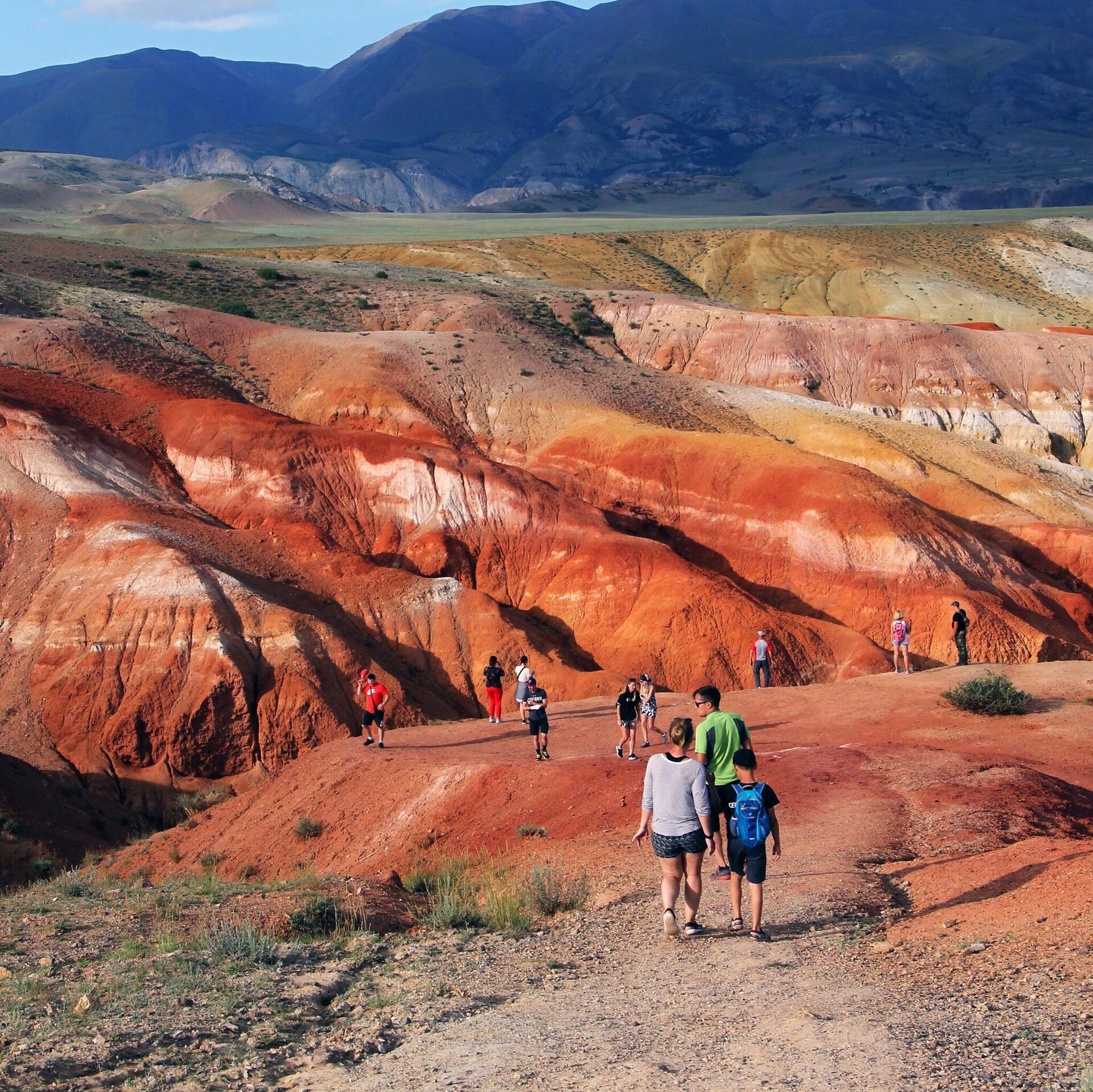 سياح في وادي كيزيل تشين في سهوب تشويا بجمهورية ألتاي. يُضفي ارتفاع نسبة الزئبق في الصخور لونًا أحمر.