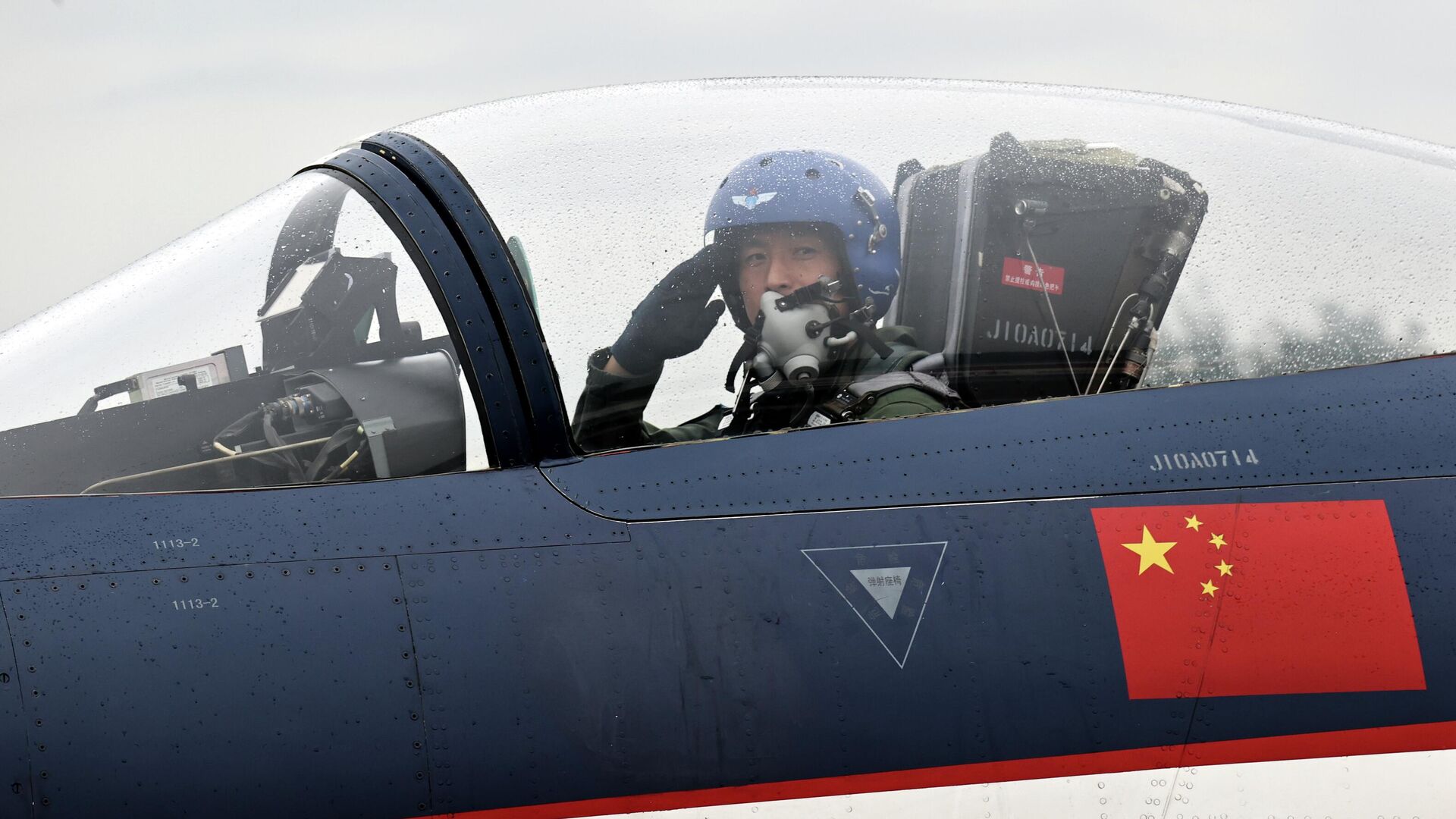 أعضاء فريق الاستعراض الجوي "الأول من أغسطس" التابع لجيش التحرير الشعبي الصيني يؤدون عرضًا جويًا بالقرب من طائرة حربية إلكترونية صينية من طراز "J-16D" خلال معرض الصين الدولي 13 للطيران والفضاء، في تشوهاي جنوبي الصين.