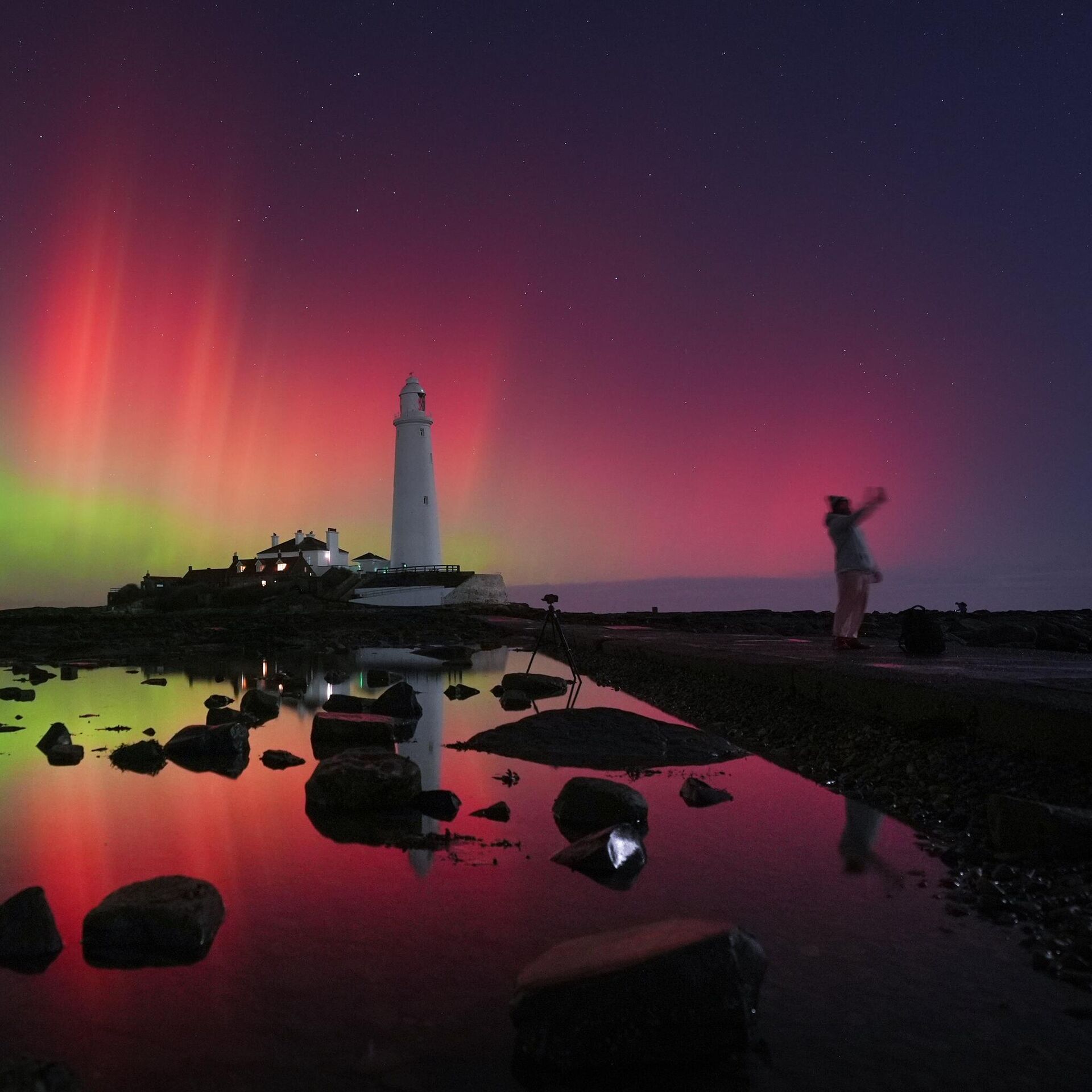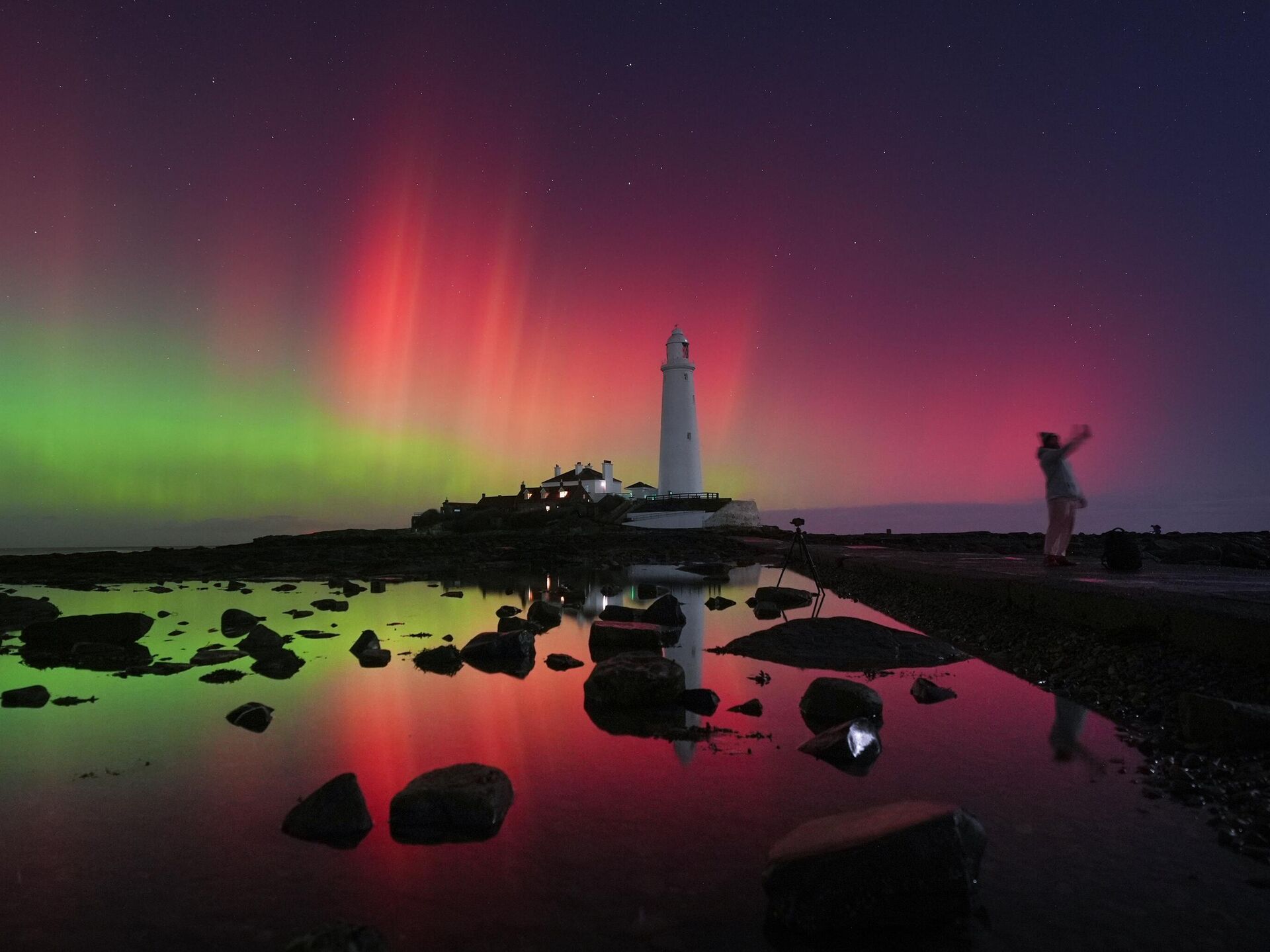 الشفق القطبي، يتوهج في السماء فوق منارة سانت ماري في وايتلي باي، ليصل إلى عاصفة جيومغناطيسية من المستوى G4، مقدّمًا عرضًا مذهلاً في الساعات الأولى من الصباح.