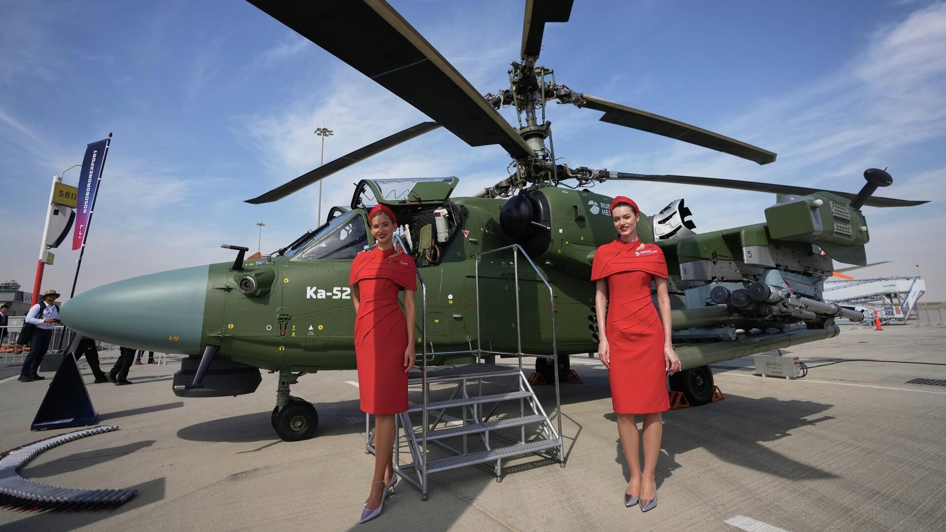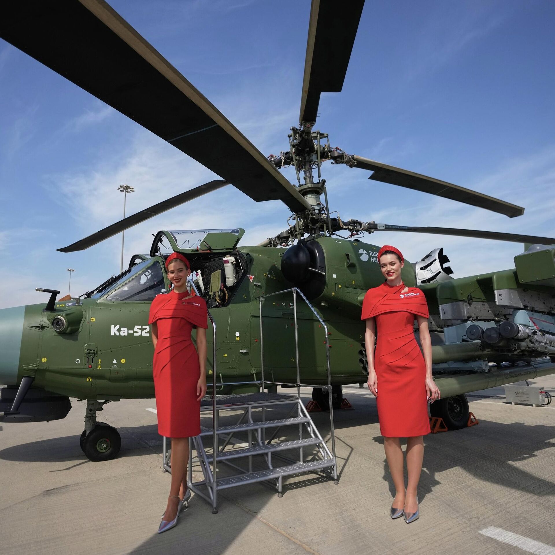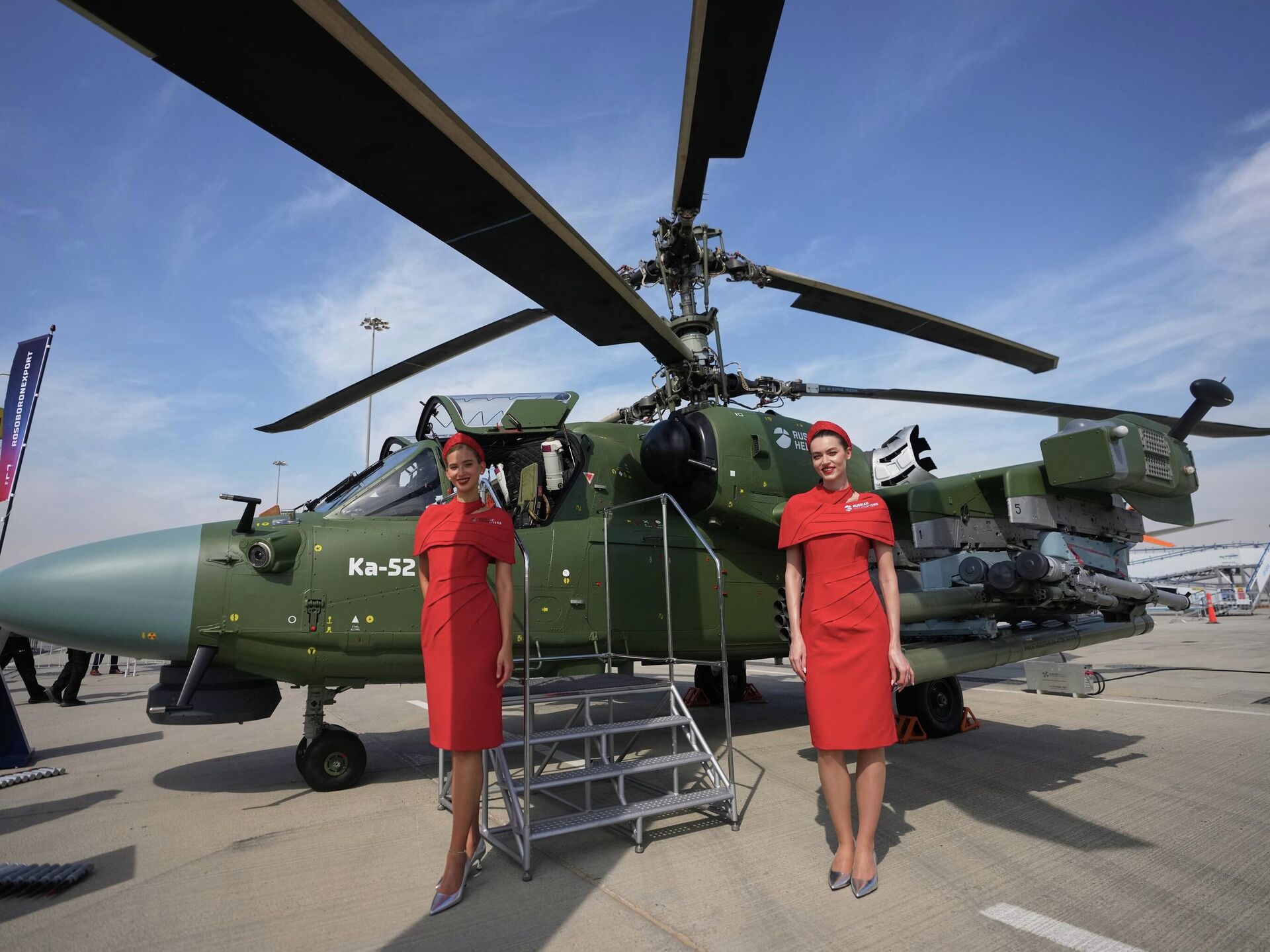 © AP Photo / Fatima Shbair مضيفات روسيات يقفن بجانب مروحية هجومية روسية من طراز"KA-52" في معرض دبي للطيران في دبي.