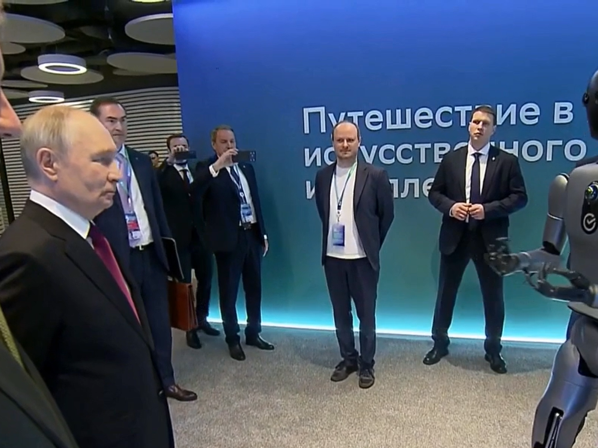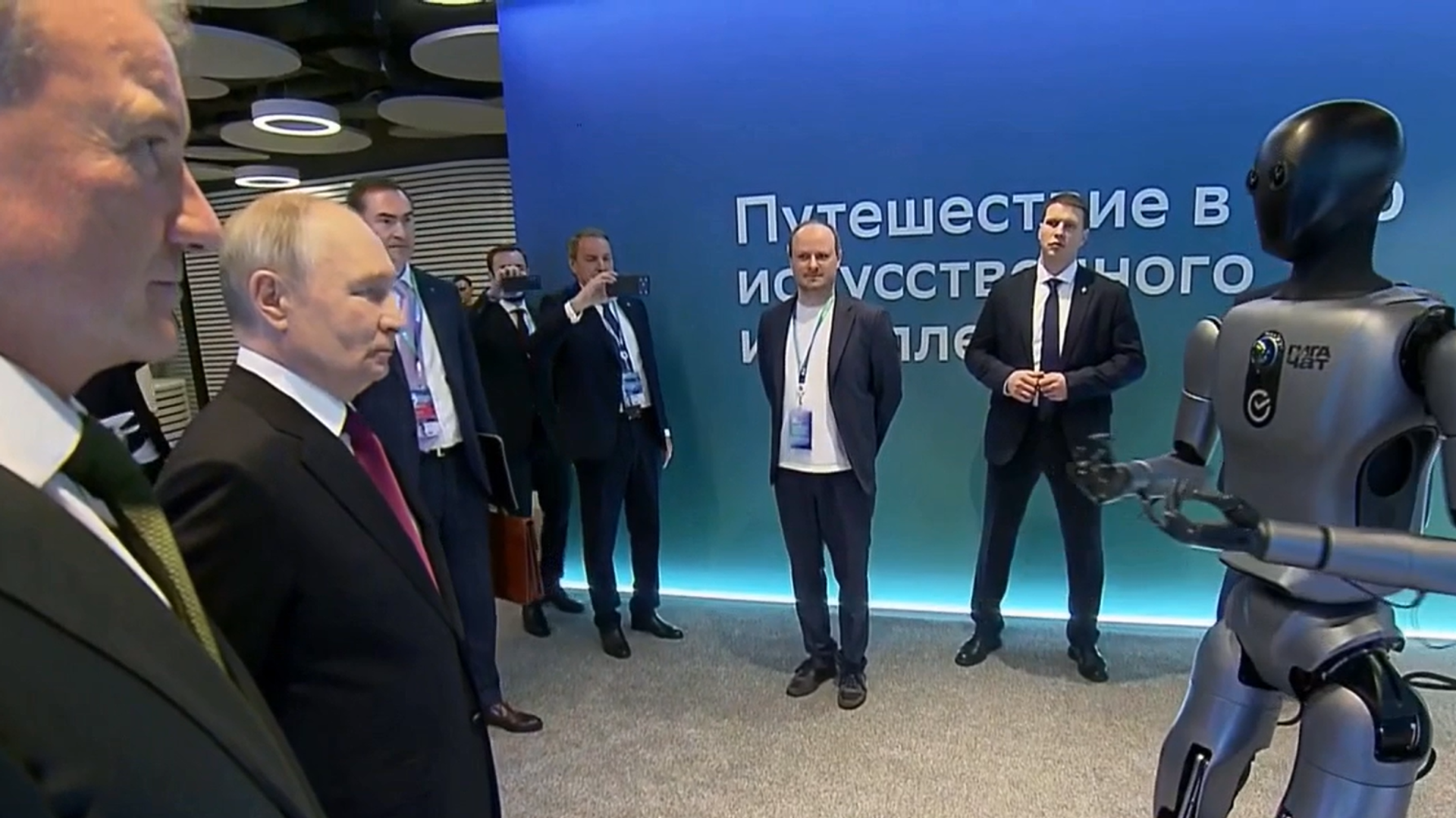 وخلال جولته في المعرض، عرض على بوتين أول روبوت ذكاء اصطناعي مجسم، يشبه في بنيته الإنسان يُدعى "غرين"، والذي صممه وجمعه مهندسو سبيربنك ليصبح مساعدا عالميا،
