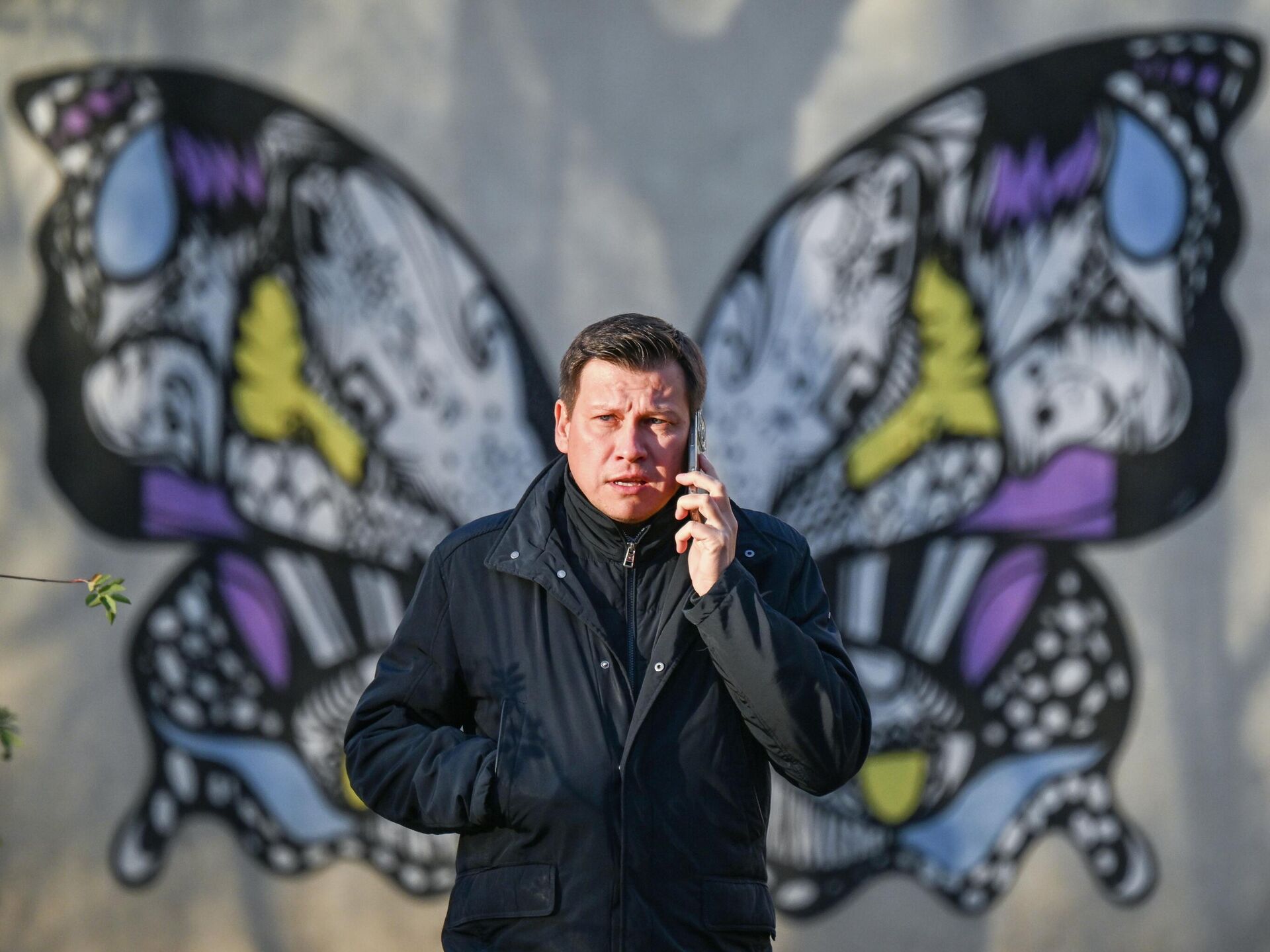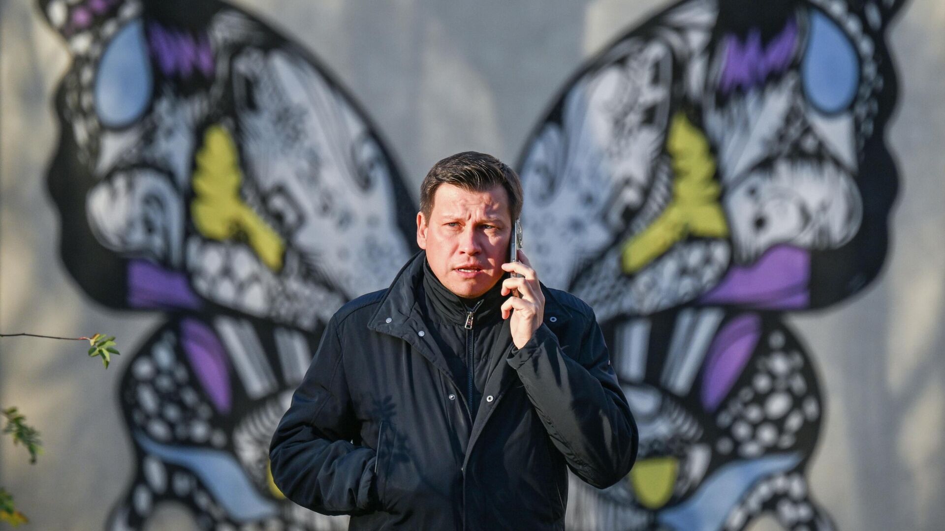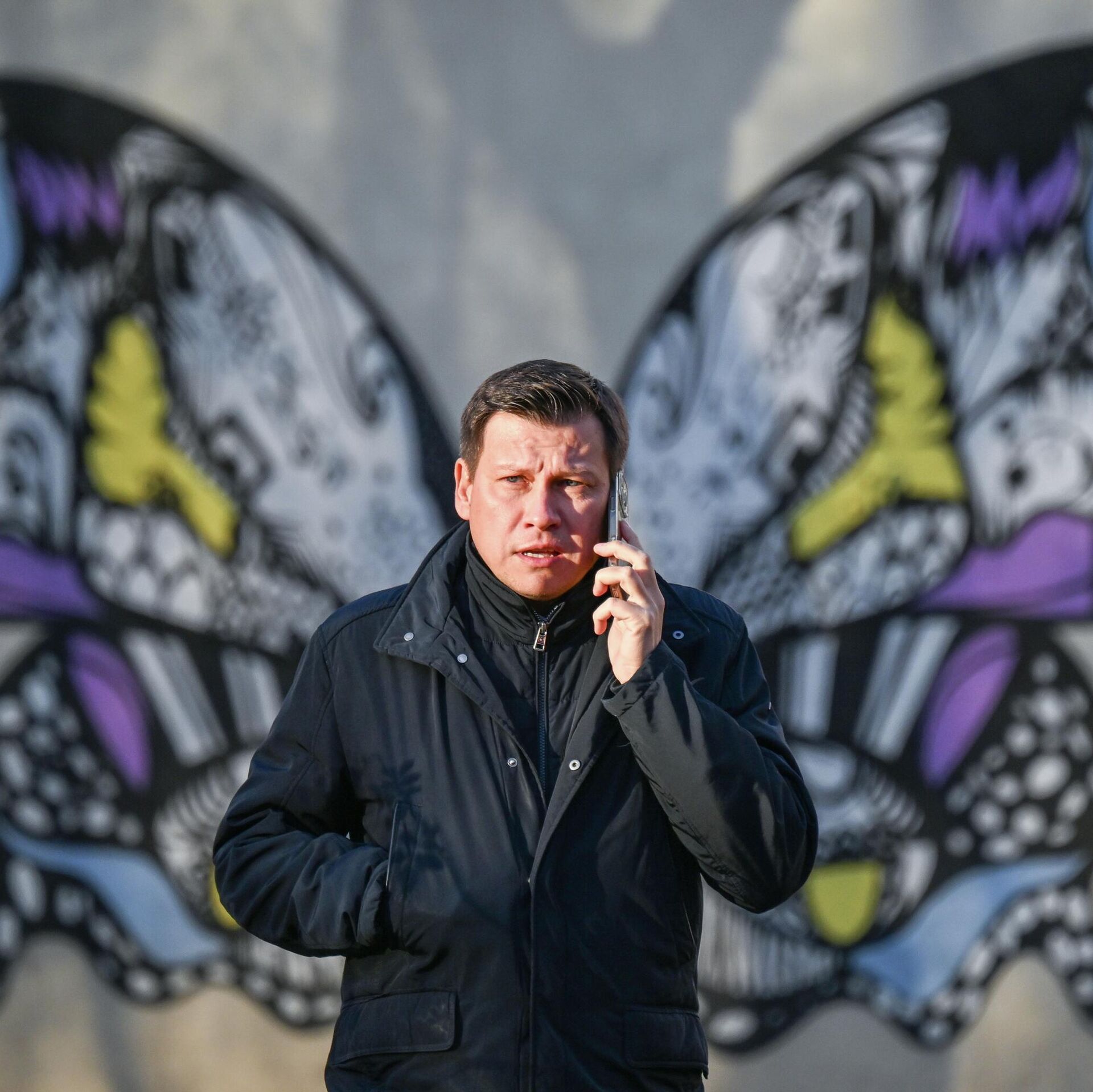 رجل يتحدث على الهاتف في حديقة في موسكو وكأن لديه جناحي فراشة