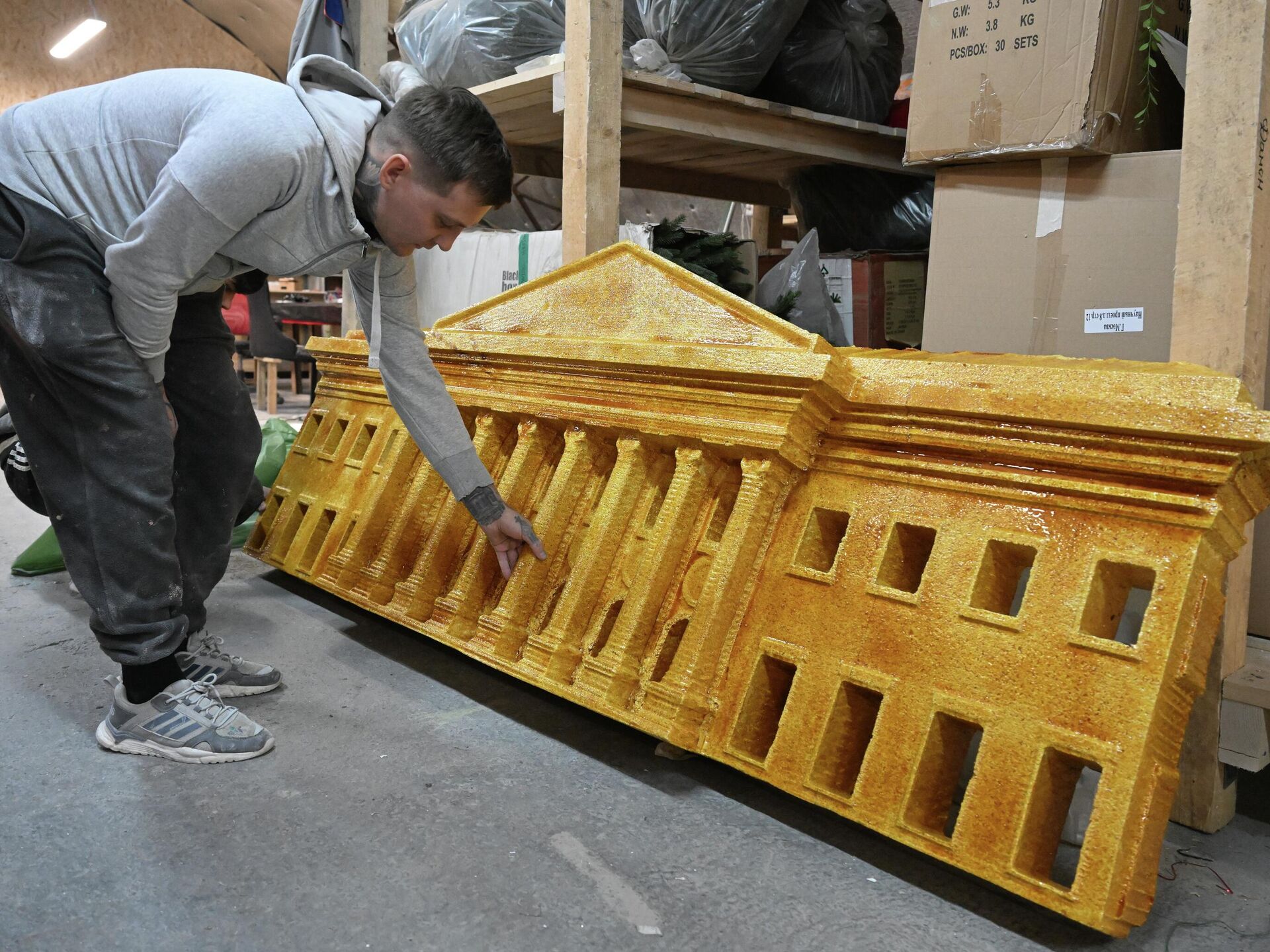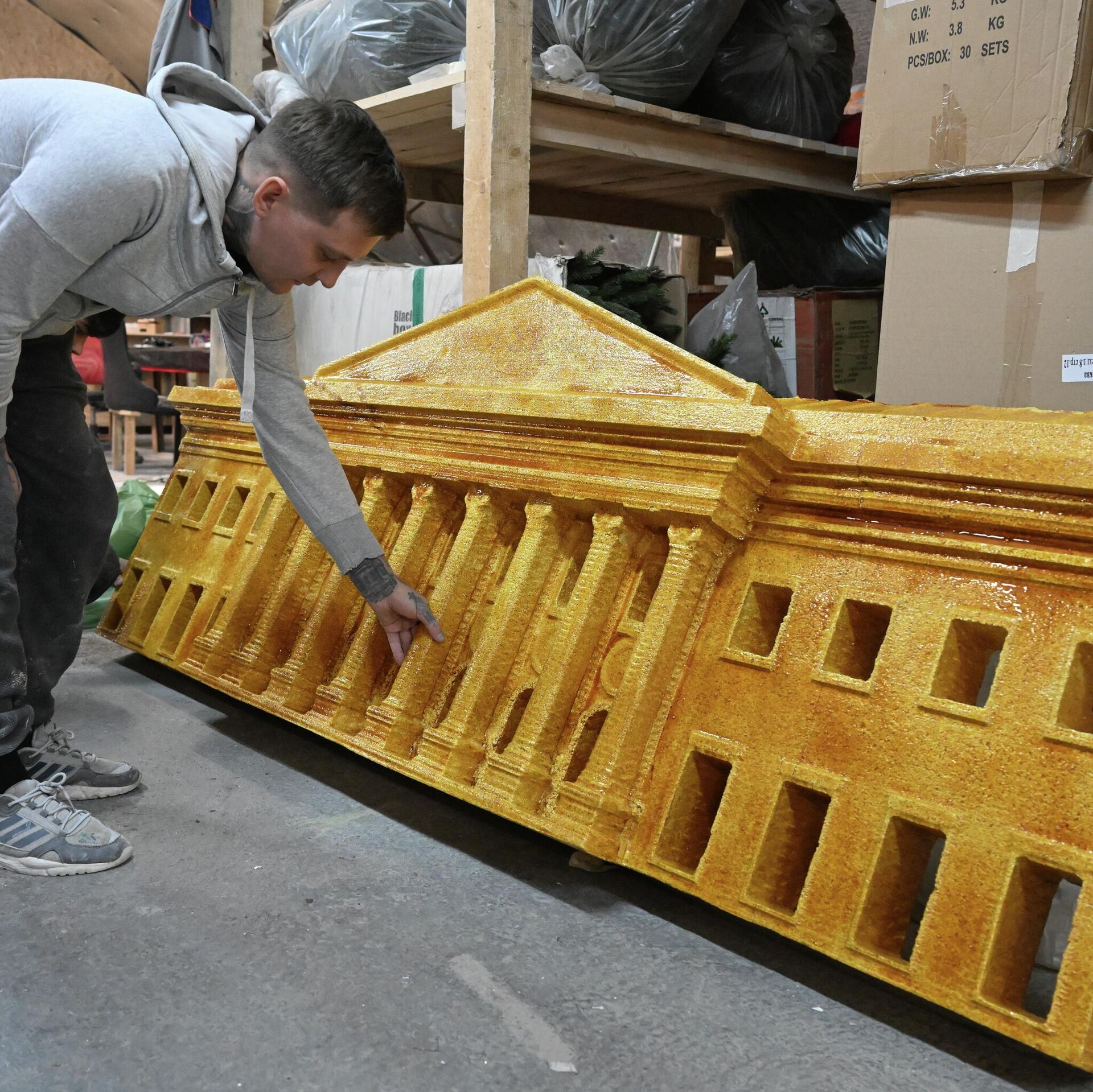 وضع الرتوش الأخيرة على مجسم أحد المباني المطلية باللون الأبيض، والذي ستزيّن به شجرة عيد الميلاد.