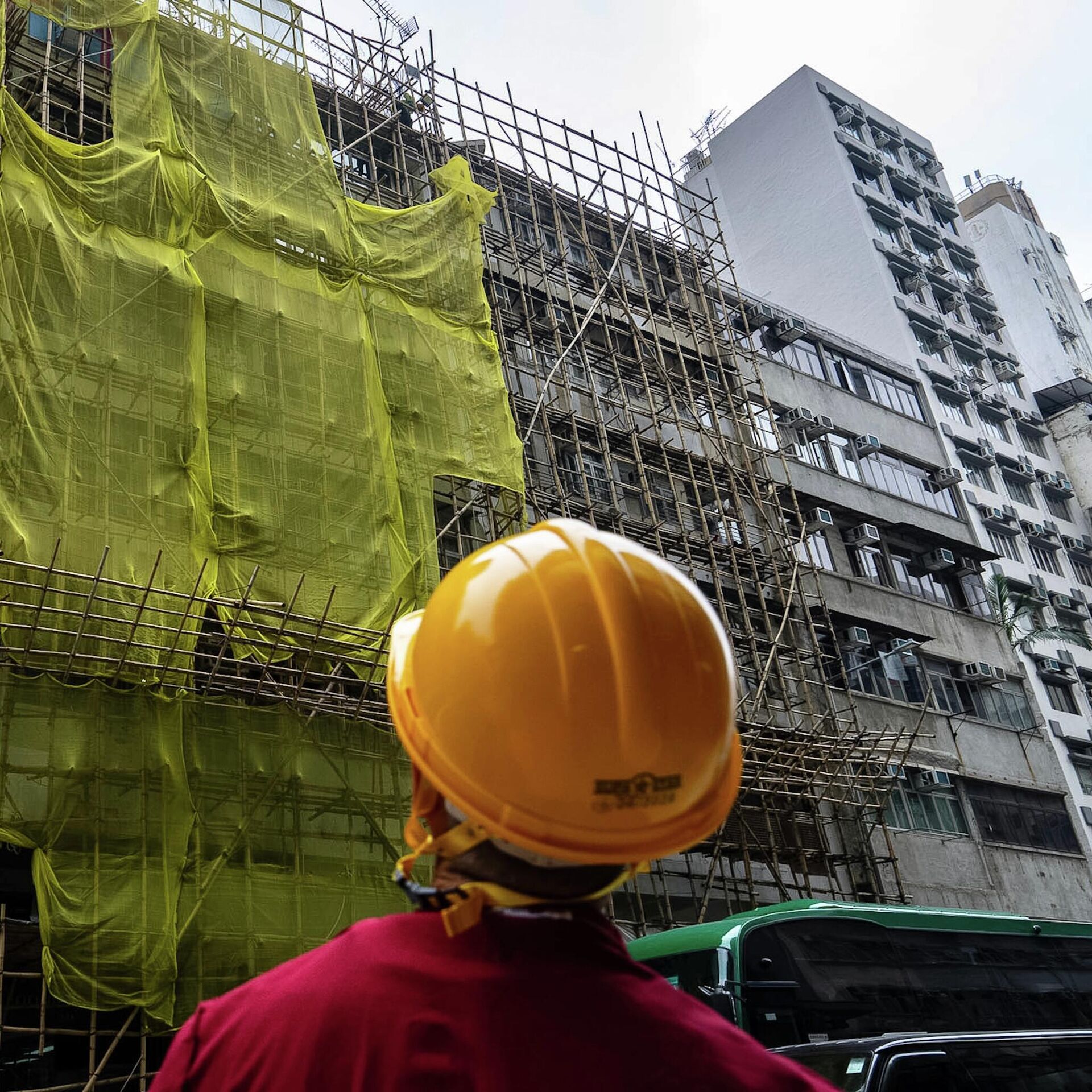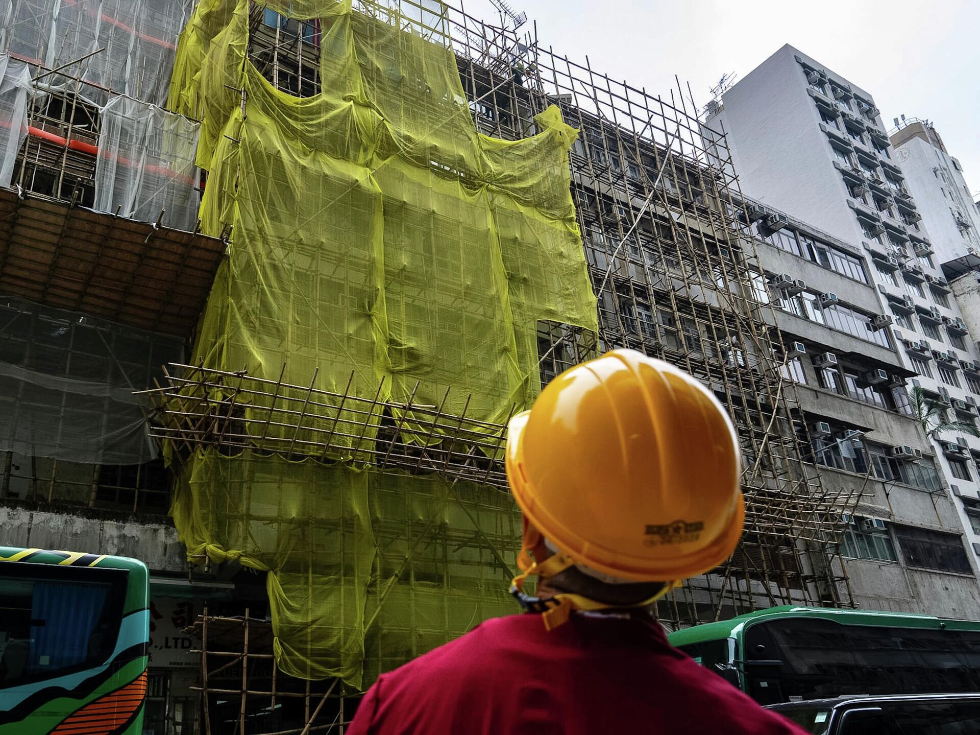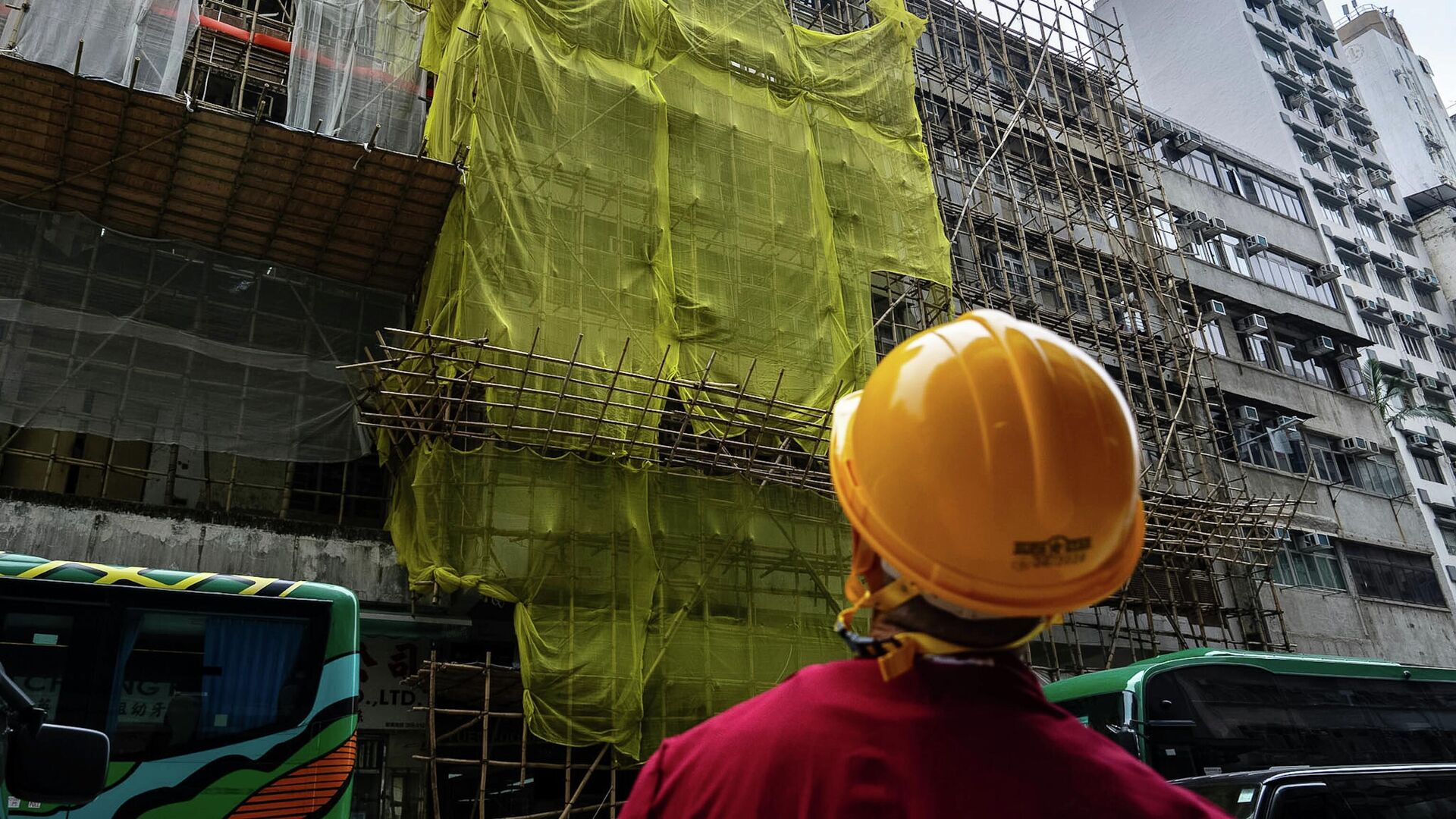 © AP Photo / Chan Long Hei عامل بناء يقف بالقرب من مبنى قيد التجديد في منطقة هونغ كونغ وينظر باتجاه الأعلى.
