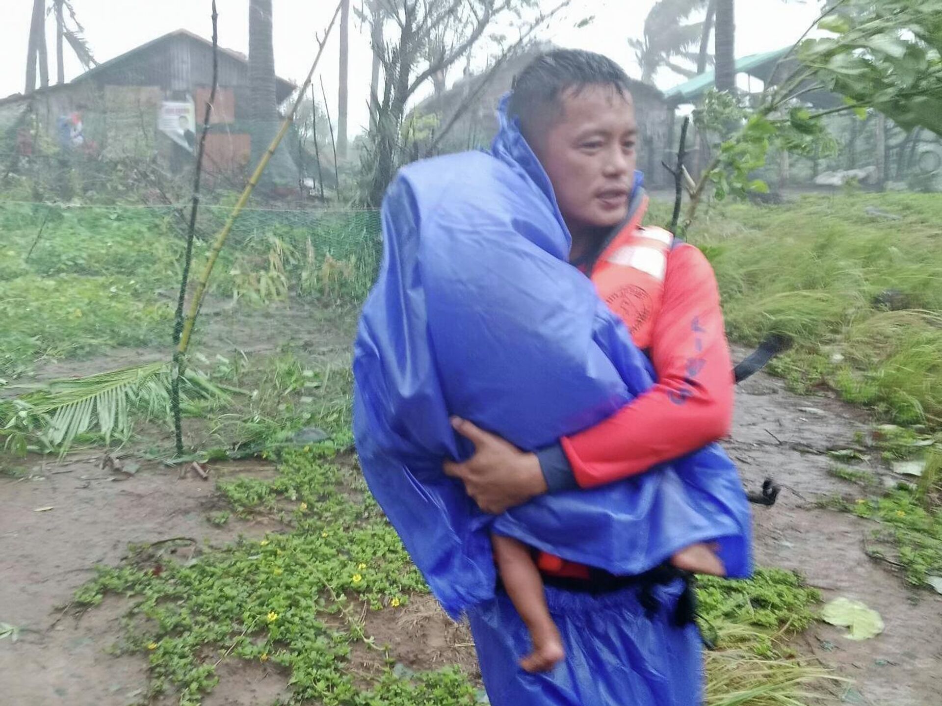 في هذه الصورة، يظهر رجل من فرق الإنقاذ التابعة لخفرالسواحل الفلبيني، وهو يحمل طفلًا صغيرًا، ليأخذه إلى مكان أكثر أمانا، وذلك بعد إعصار"راجاسا" في الفلبين.