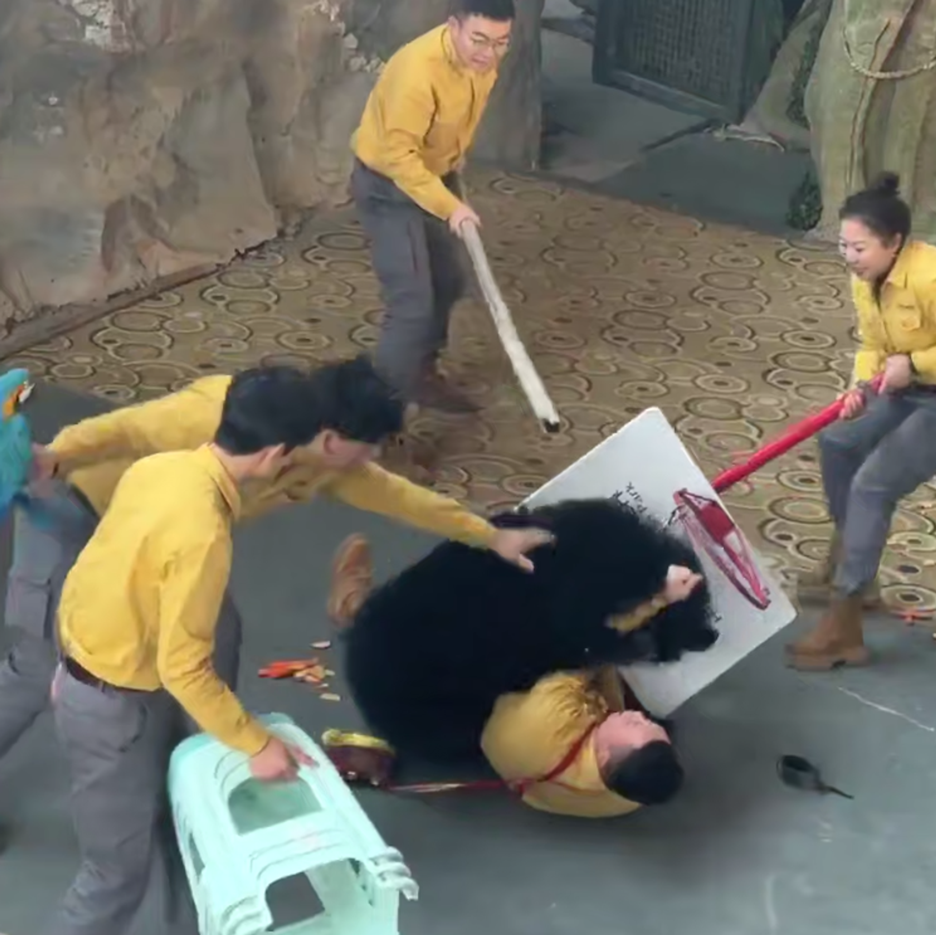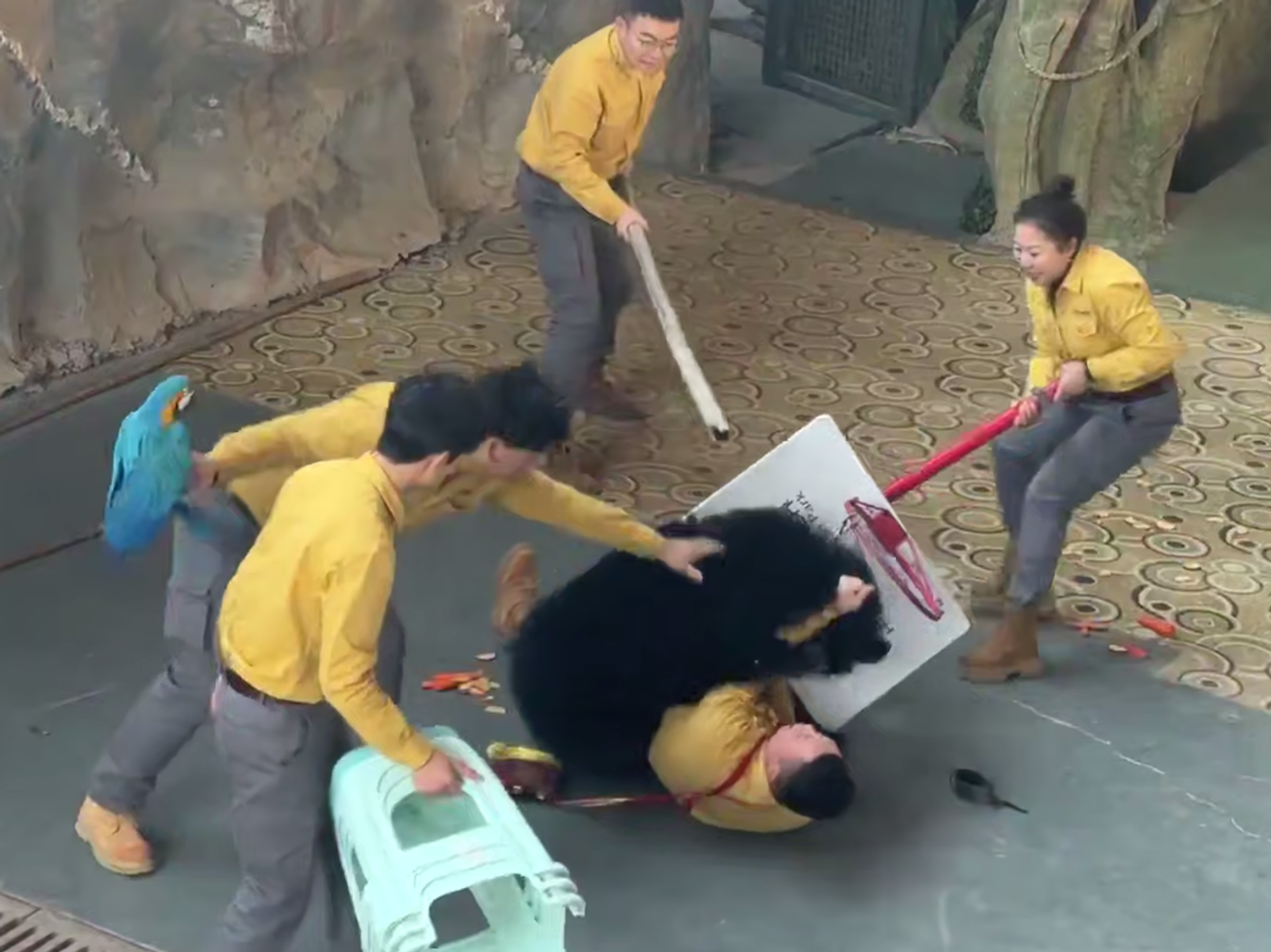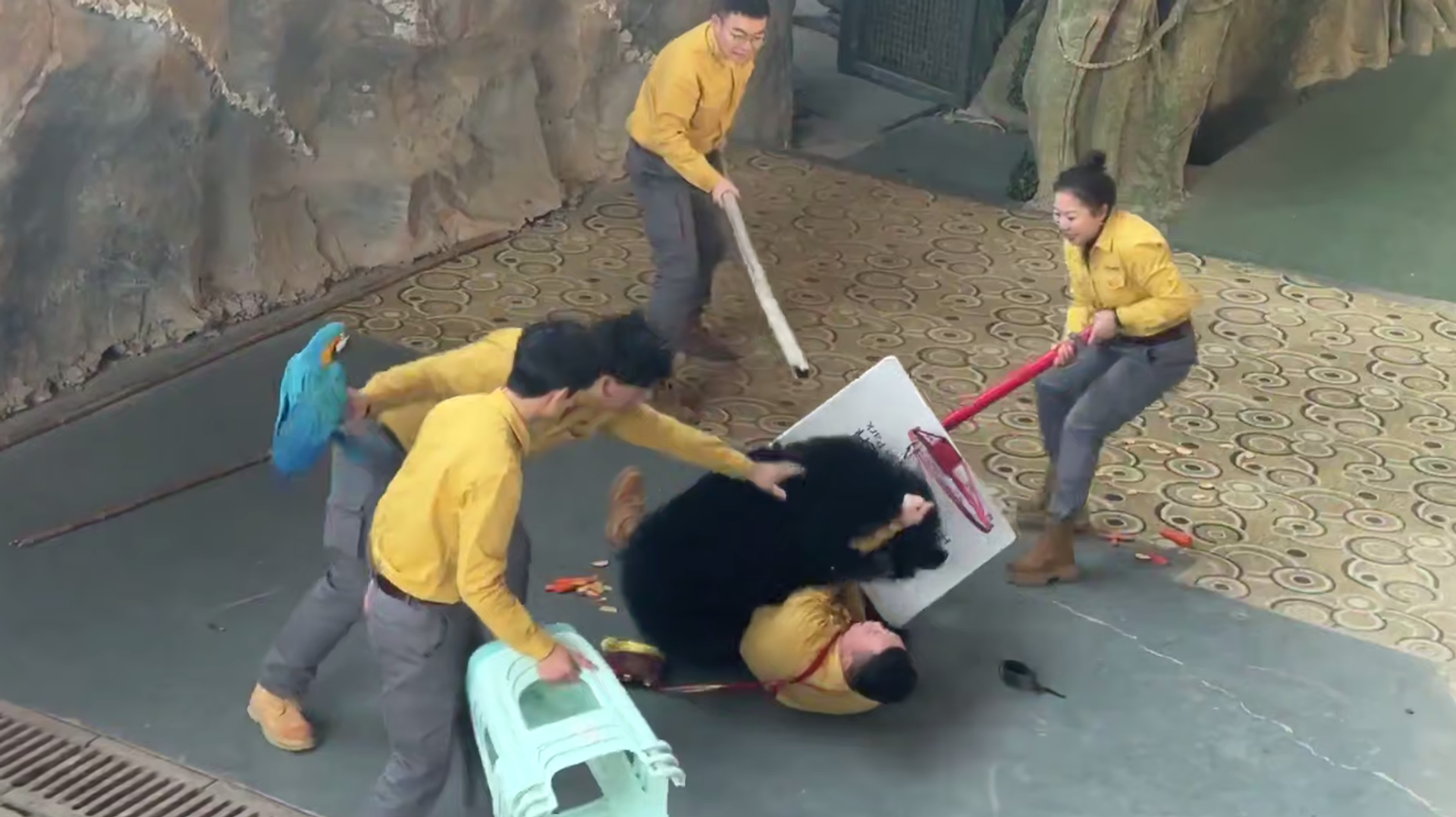 شهد زوار حديقة "هانغتشو" في الصين، لحظات من التوتر، بعد أن باغت أحد الدببة مدربه وهاجمه أثناء عرض حي أمام الجمهور، ما أثار حالة من الذعر بين الحاضرين.