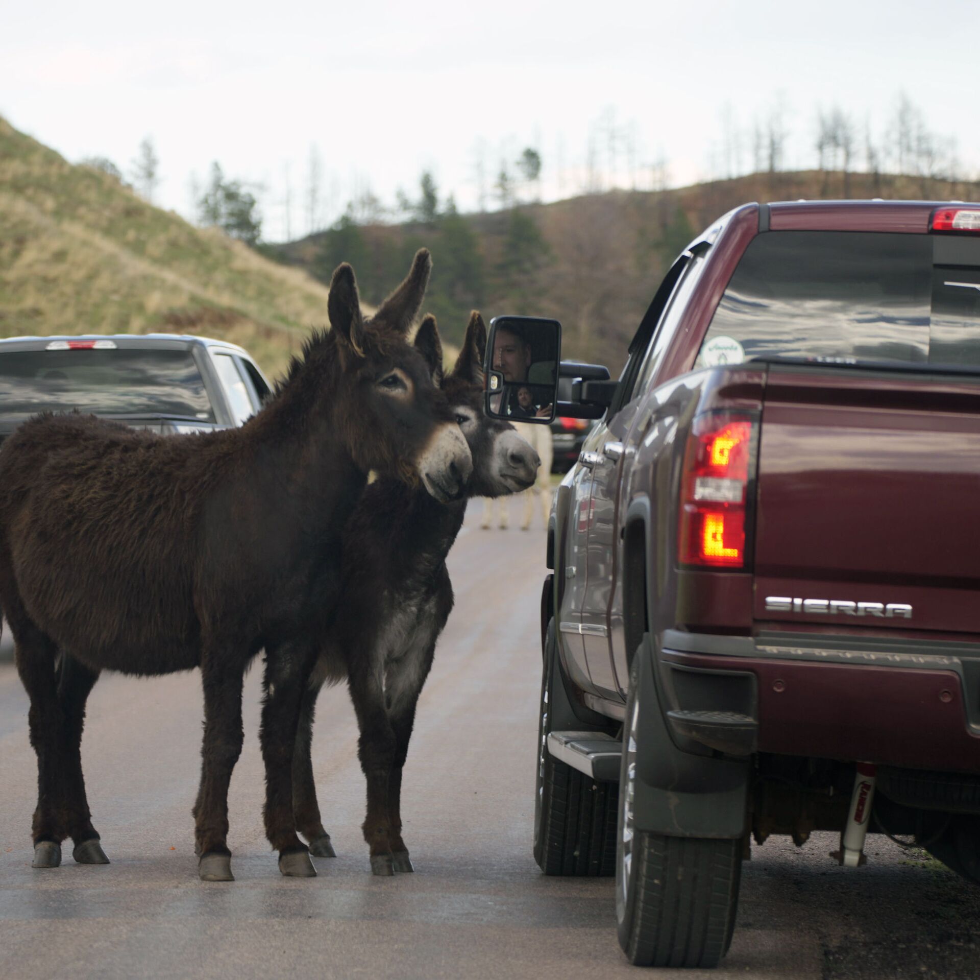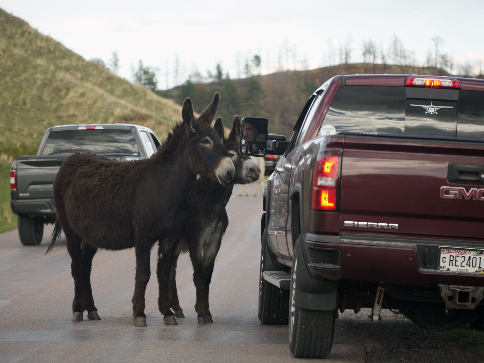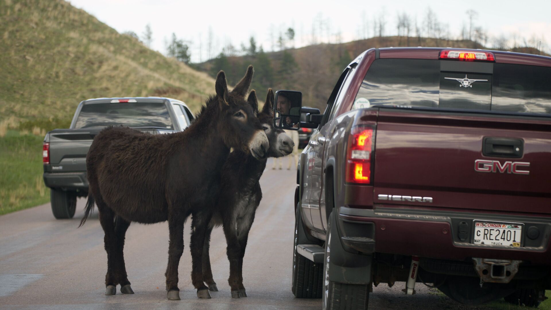© AP Photo / David Zalubowskiزوج من حيوان الجحش يوقف سائق سيارة لتناول وجبة خفيفة على طريق حلقة الحياة البرية في حديقة كستر ستيت، بالقرب من كاستر، جنوب ولاية داكوتا الأمريكية 25 مايو 2021