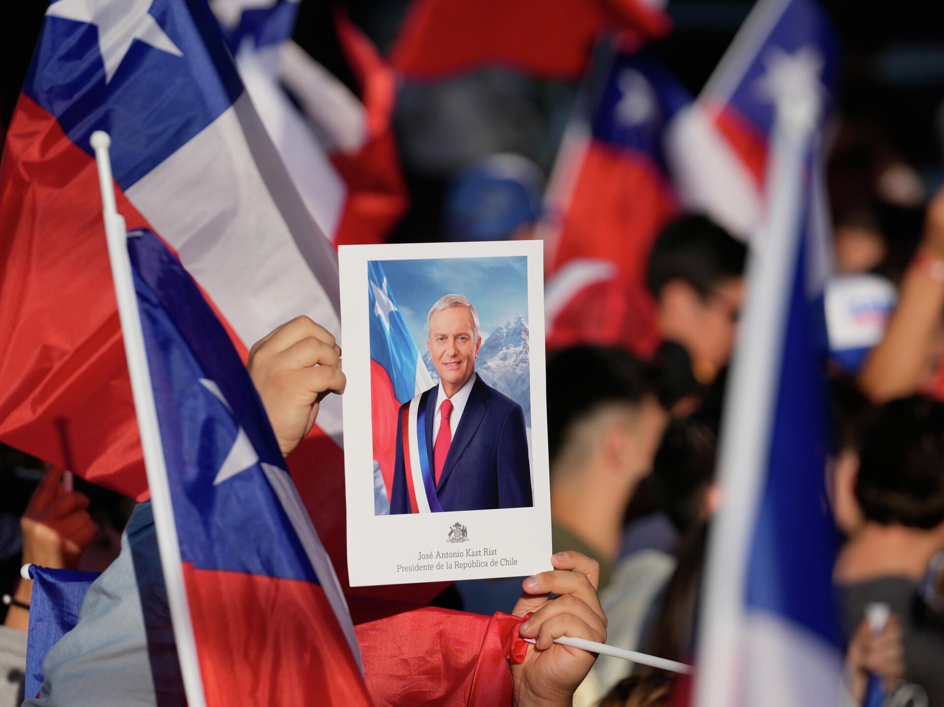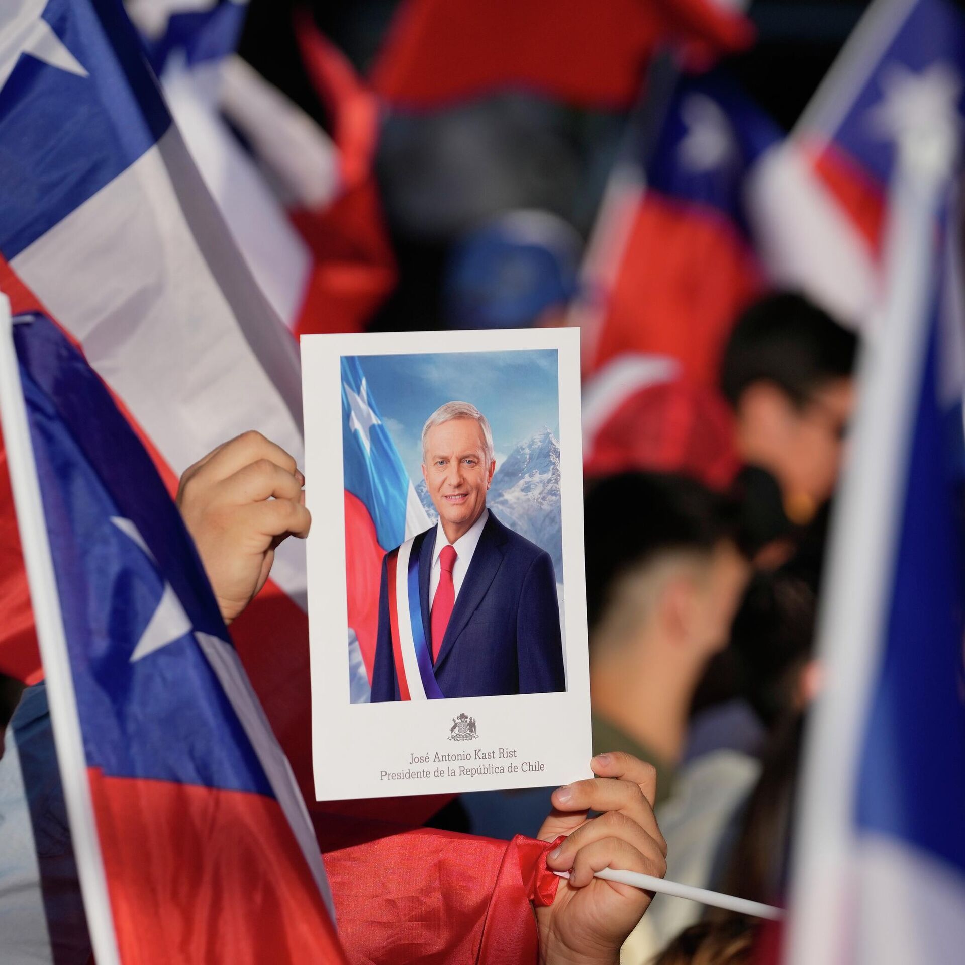 © AP Photo / Matias Delacroixأنصار يحملون صورة خوسيه أنطونيو كاست، مرشح الحزب الجمهوري المعارض للرئاسة، بعد أن أظهرت النتائج تقدمه في جولة الإعادة للانتخابات الرئاسية في سانتياغو، تشيلي، الأحد 14 ديسمبر 2025.