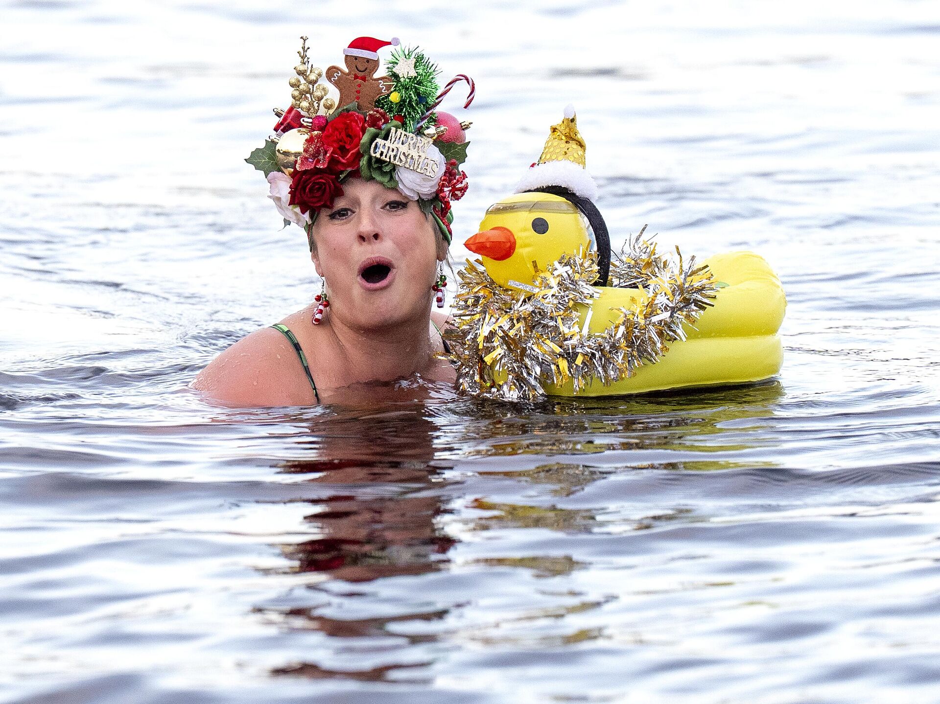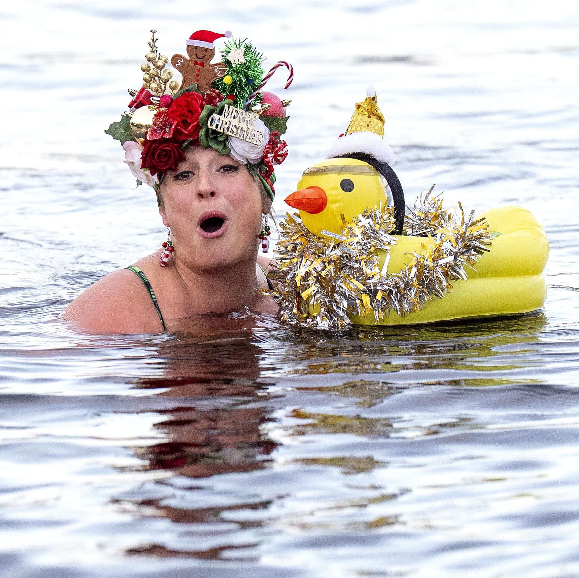 أليس غودريدج، عضوة في مجموعة "لوخ إنش ديبرز" للسباحة في المياه المفتوحة، تشارك في سباحة ذات طابع عيد الميلاد في بحيرة "لوخ إنش"، بالقرب من كينغوسي، في منتزه "كيرنغورمز" الوطني.