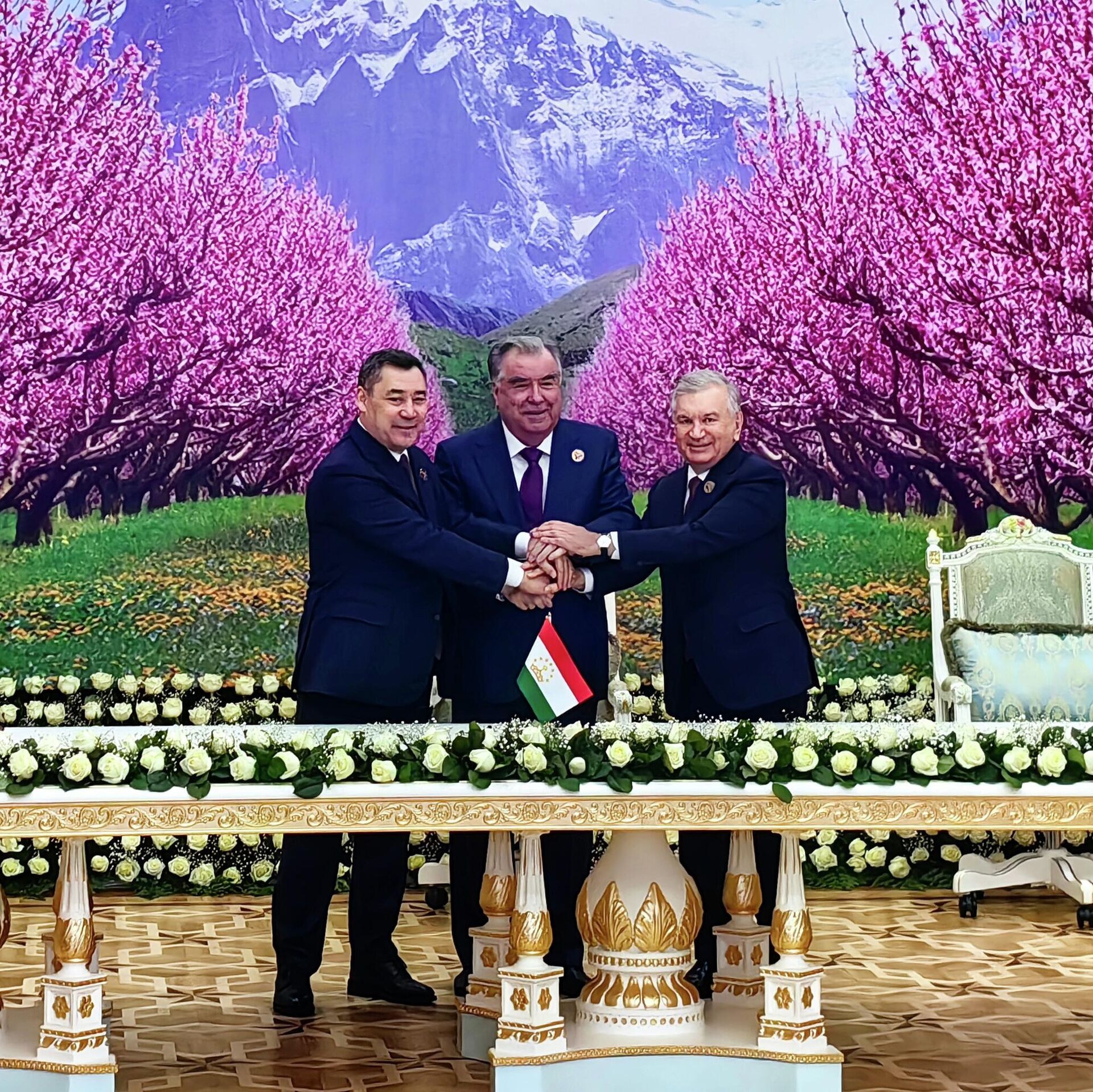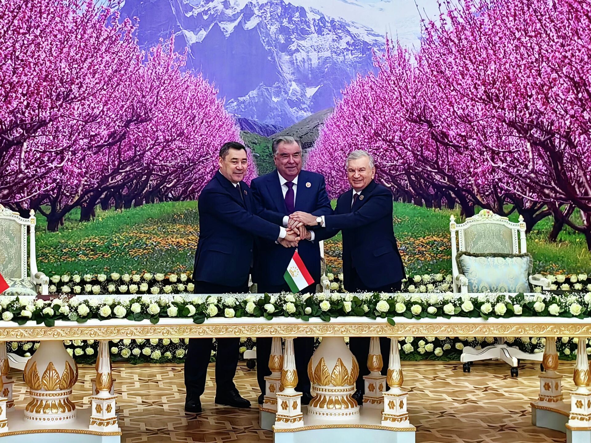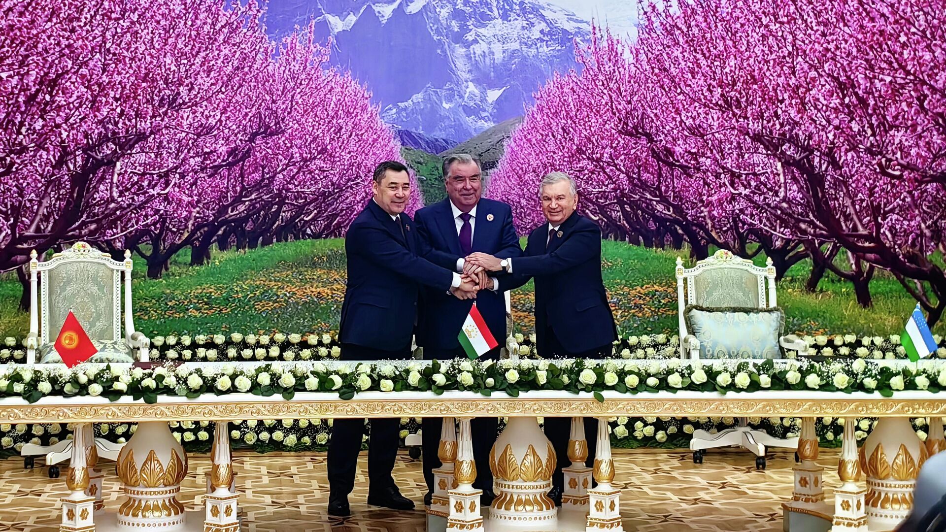 رئيس قيرغيزستان سدير جاباروف ورئيس طاجيكستان إمام علي رحمون ورئيس أوزبكستان شوكت ميرزيوييف (من اليسار إلى اليمين) في حفل توقيع اتفاقية تقاطع حدود الدولة للدول الثلاث في دوشانبي. - سبوتنيك عربي, 1920, 21.12.2025