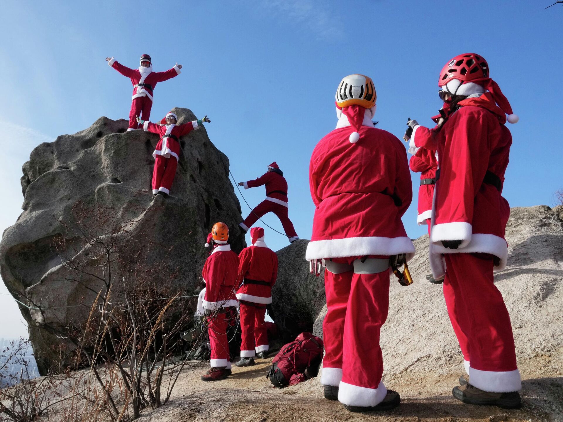 يتخذ متسلقو الجبال، وهم يرتدون أزياء "بابا نويل"، أوضاعا للتصوير خلال فعالية للدعاء من أجل تسلق آمن في العام الجديد 2026، على جبل بوخانسان في كوريا الجنوبية