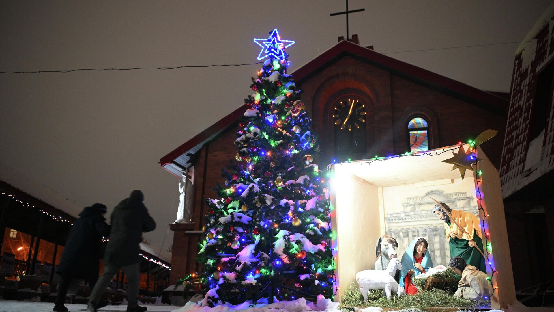شجرة عيد الميلاد عند مدخل الكاتدرائية الكاثوليكية في نوفوسيبيرسك في روسيا - سبوتنيك عربي, 1920, 25.12.2025
