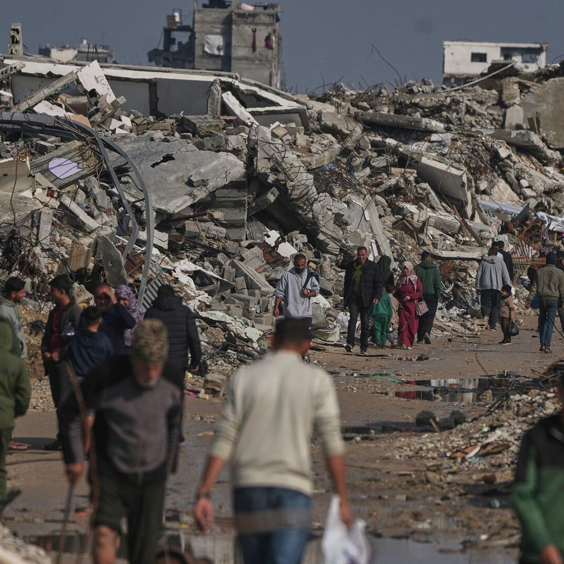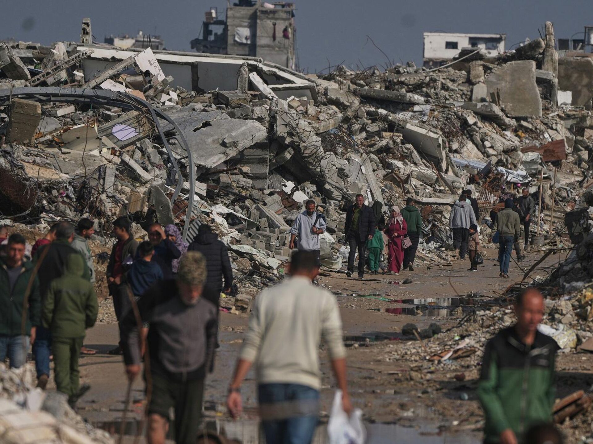 © AP Photo / Jehad Alshrafiفلسطينيون يسيرون في شارع محاط بمبان دمرت خلال عمليات جوية وبرية إسرائيلية في مدينة غزة، 17 ديسمبر/ كانون الأول 2025