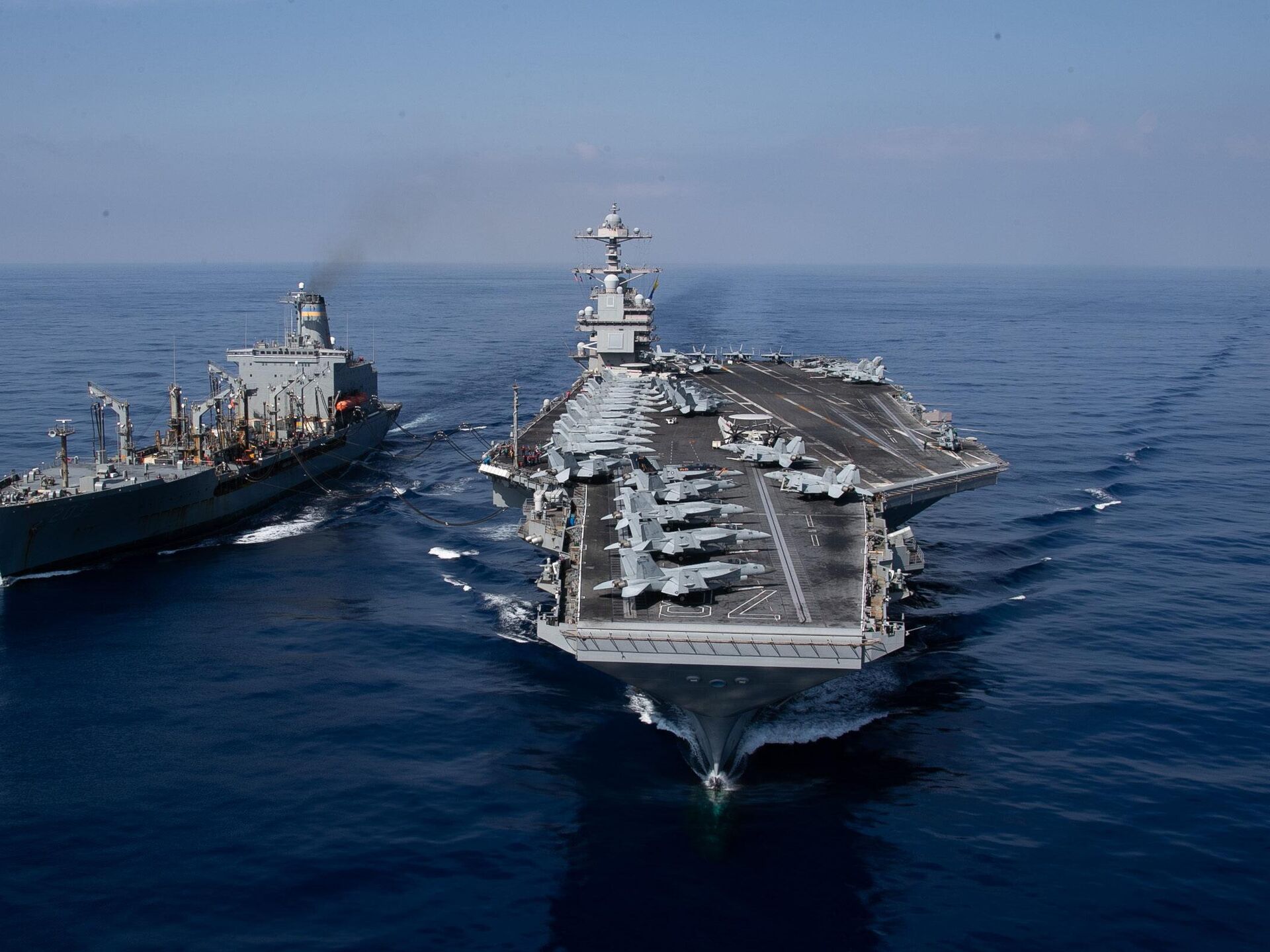 © Petty Officer 2nd Class Jackson AdkinsThe world's largest aircraft carrier USS Gerald R. Ford (CVN) 78 and the USNS Laramie (T-AO-203) conduct a refueling-at-sea in the Eastern Mediterranean Sea, Oct. 11, 2023.