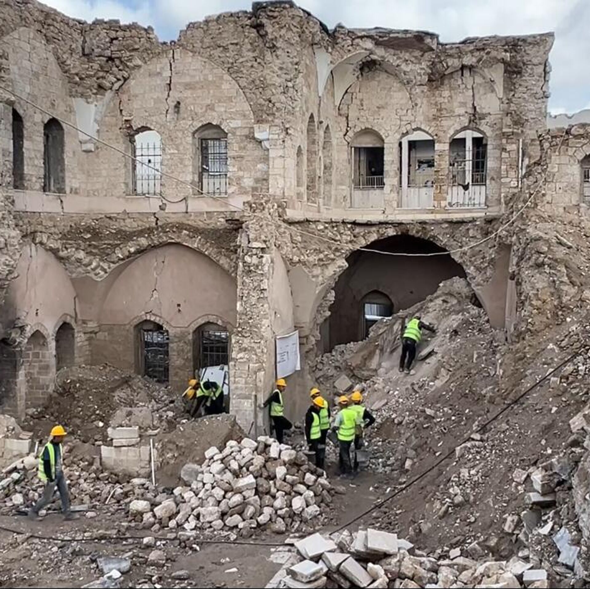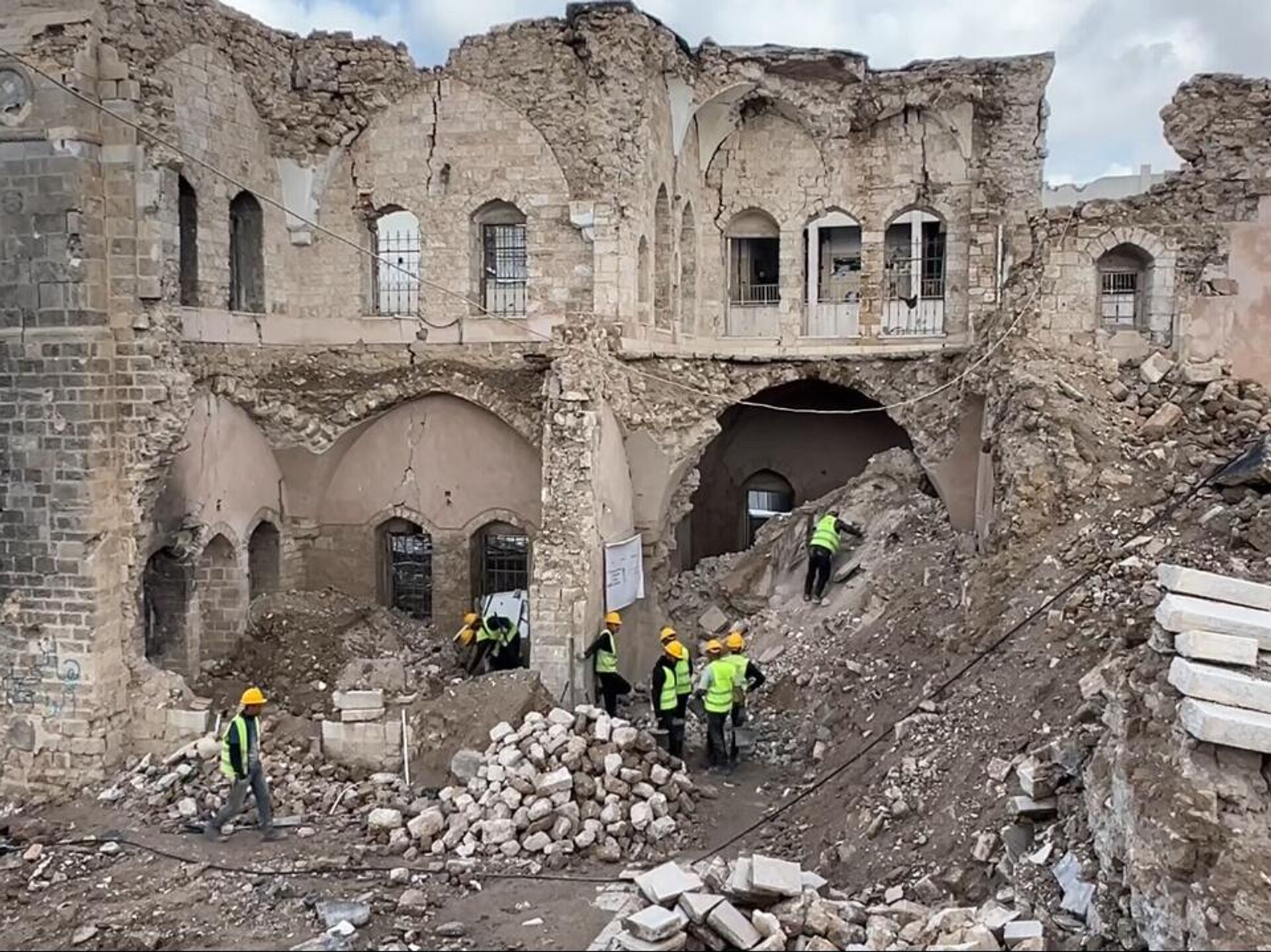 إزالة الركام من محيط متحف القصر، مكدّسين الحجارة القابلة لإعادة الاستخدام في مكان واحد وفصلها عن الركام.